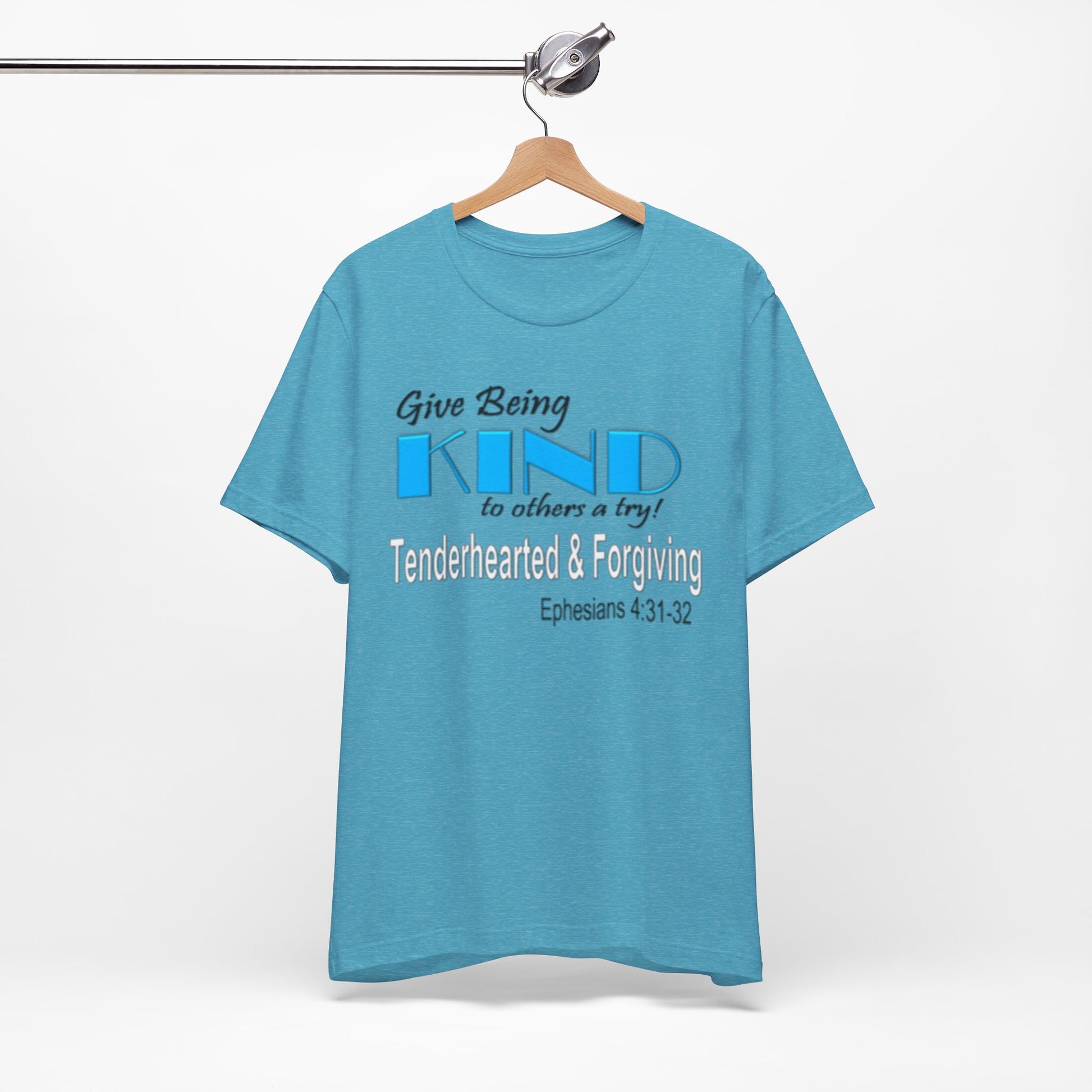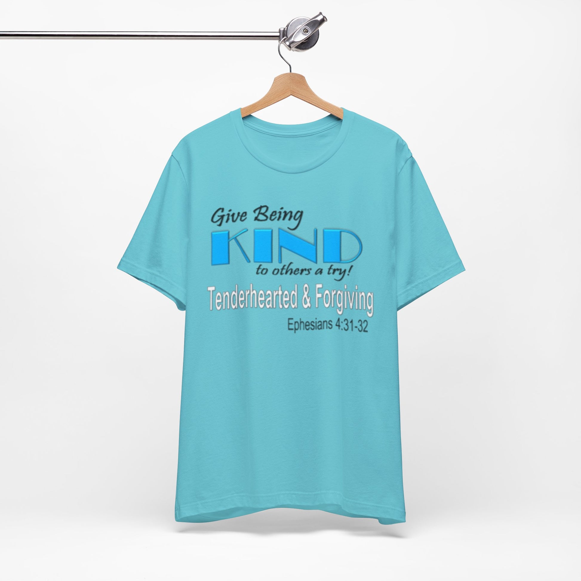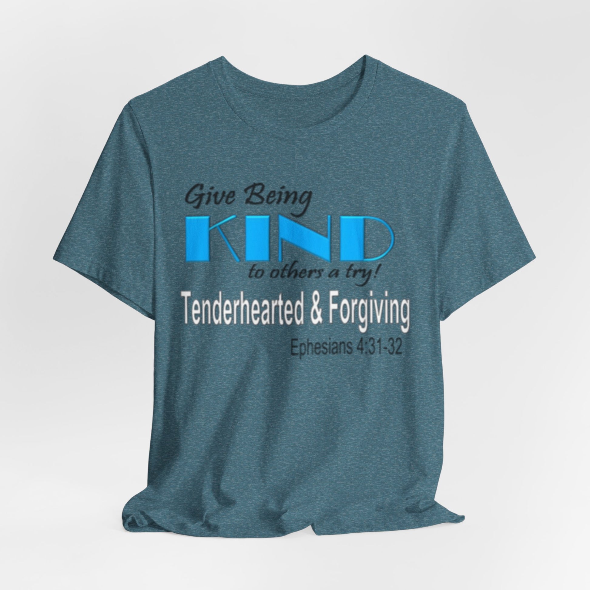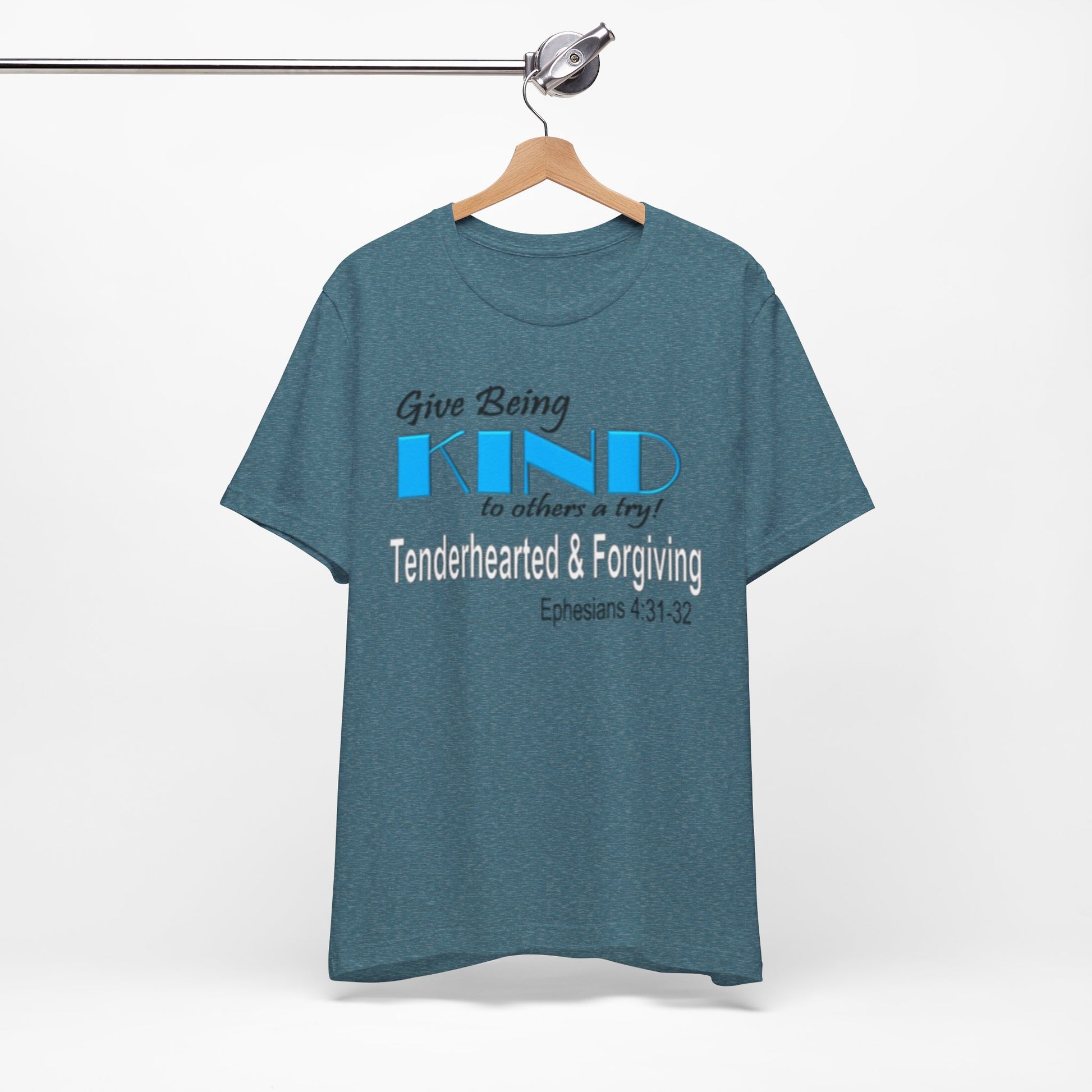 Soft, breathable, and gently styled — this lightweight jersey tee carries a quiet, faith-forward message that speaks in kindness. The front print layers a bold, blue block word “KIND” with softer script and scripture reference, creating a calm, hopeful look that settles easily into everyday life. Wear it to church gatherings, volunteer days, or casual meetups; it’s meant to feel like something you reach for when you want your clothing to reflect patience and grace. The crew neck and retail fit keep the silhouette neat for layering under a sweater or wearing on its own. Thoughtfully made details—tear-away label, ribbed collar, and side seams—make it comfortable for long days of service, study, or Sunday fellowship.