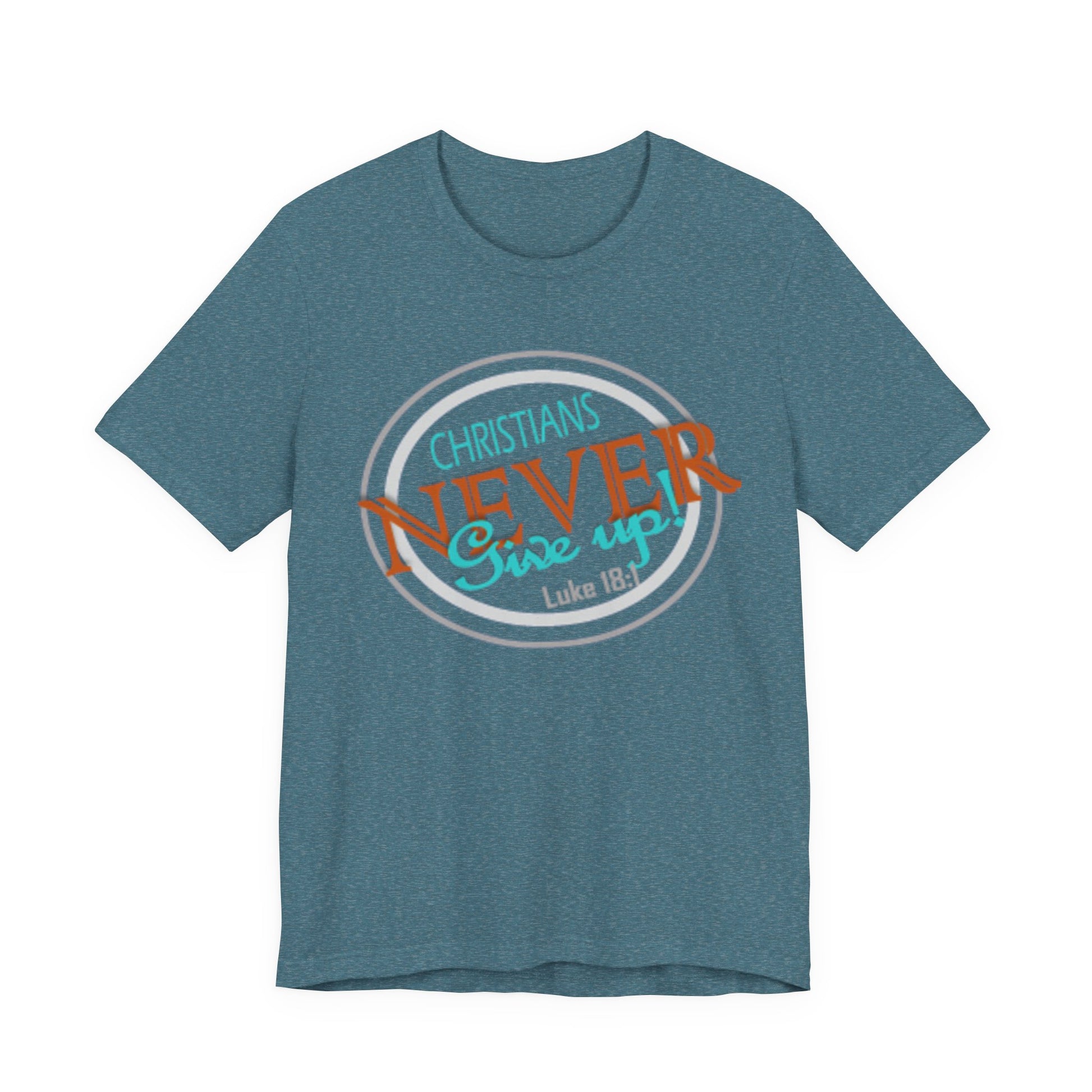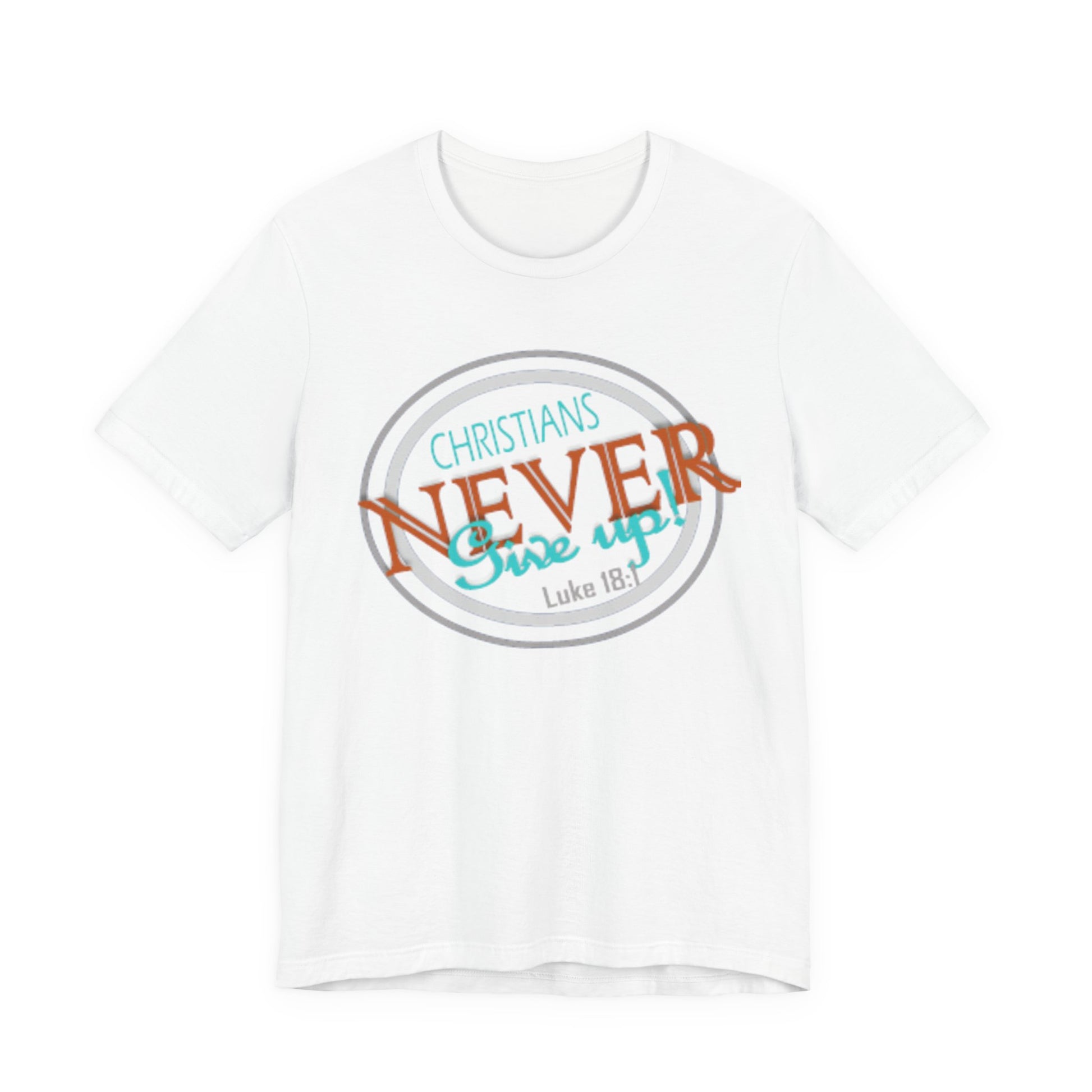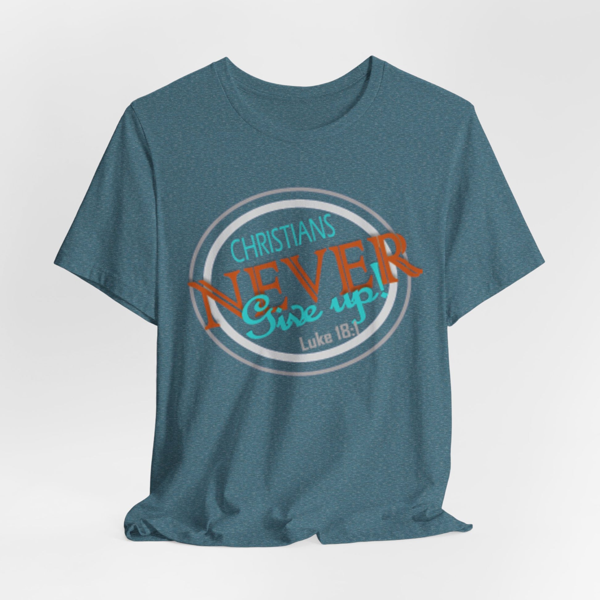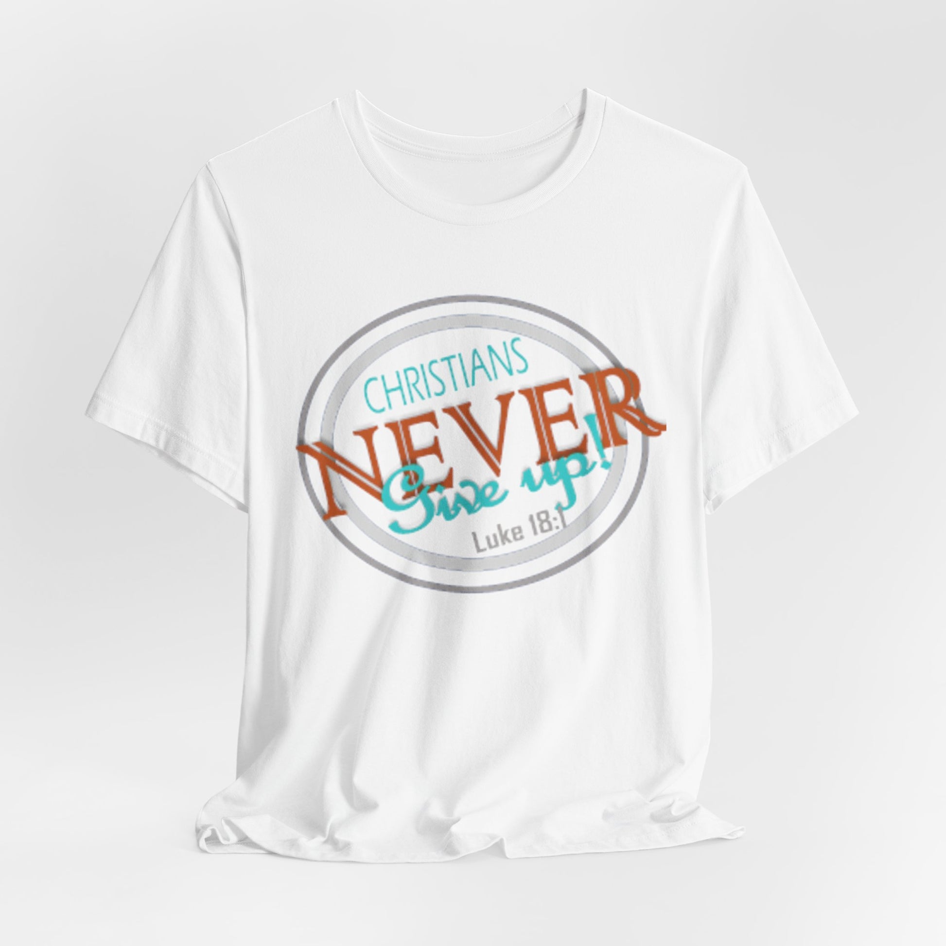 This lightweight crew-neck tee carries a faith-forward message with an easygoing, lived-in vibe. The soft Airlume combed and ring-spun cotton feels airy against the skin while the retail cut keeps the silhouette neat — great for layering under a cardigan or wearing solo on warm mornings. The front graphic blends script and bold lettering to read “Christians NEVER Give up,” evoking quiet resolve and gentle encouragement rather than loud proclamation. Subtle color contrasts in the print give it a vintage, slightly weathered look that feels personal and wearable every day. Finished with a ribbed knit collar, shoulder tape for stability, and a tear-away label for comfort, this tee feels thoughtful from fabric to print. It’s made with responsible manufacturing practices and REACH-certified materials, so it fits into a mindful wardrobe as comfortably as it fits into moments of quiet faith or community fellowship.