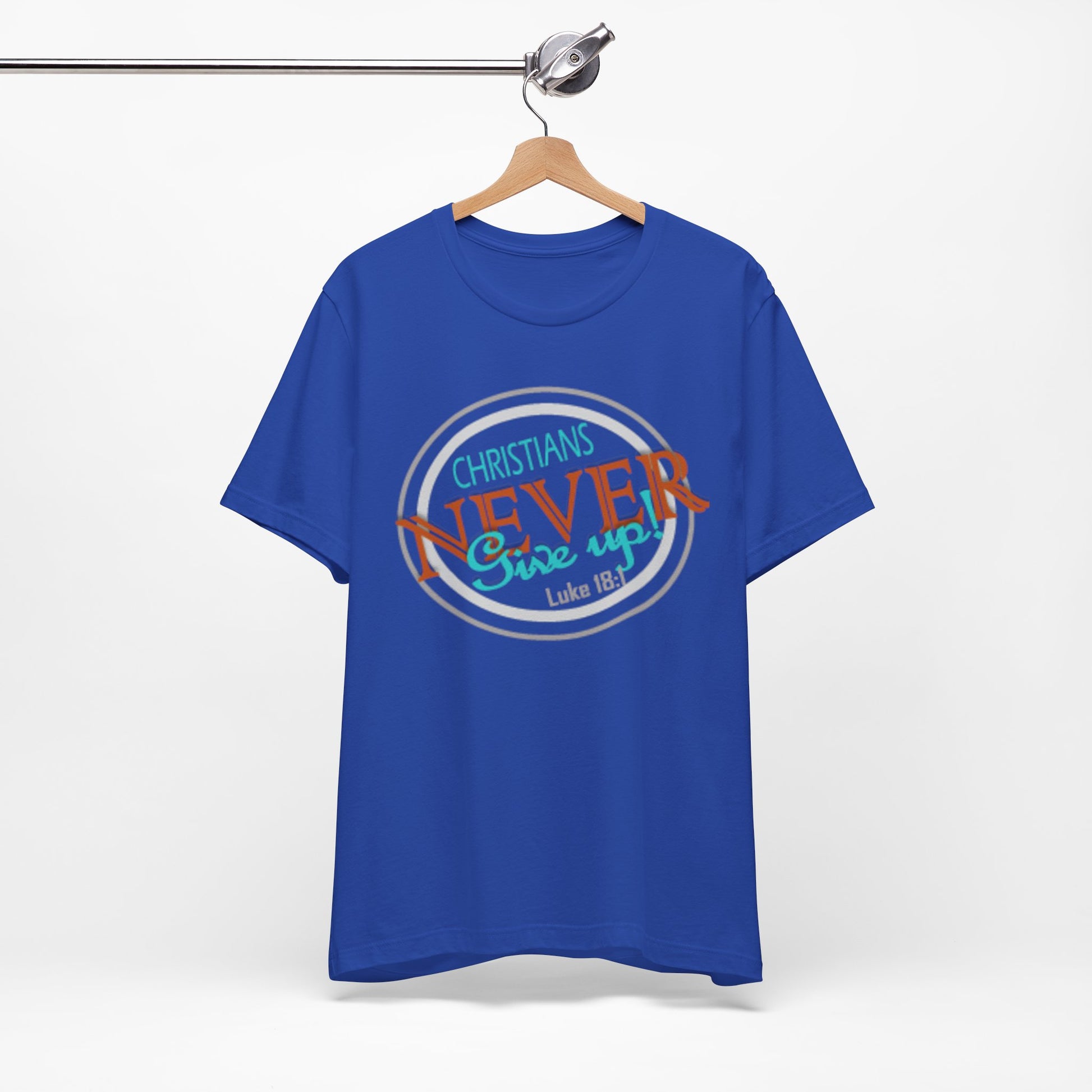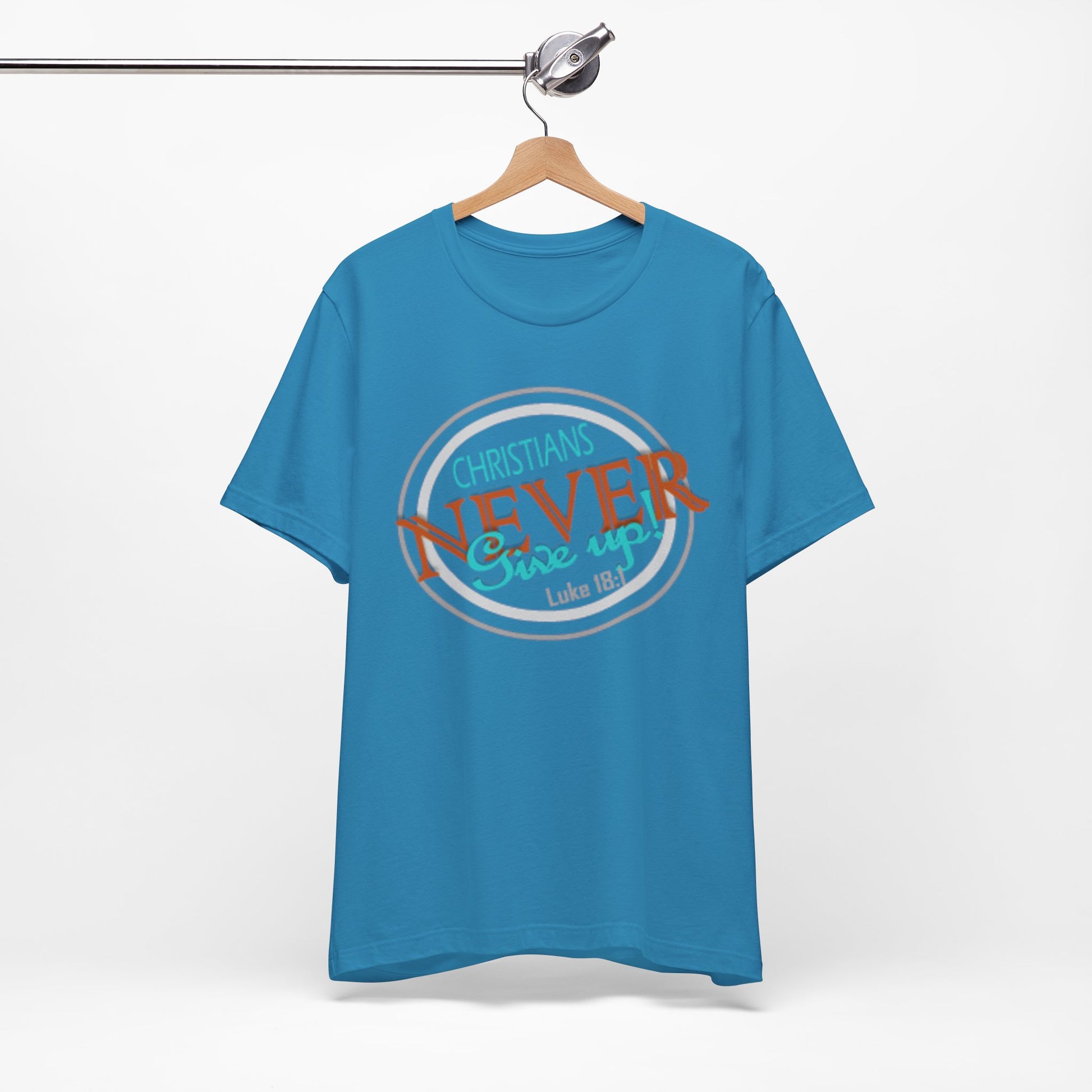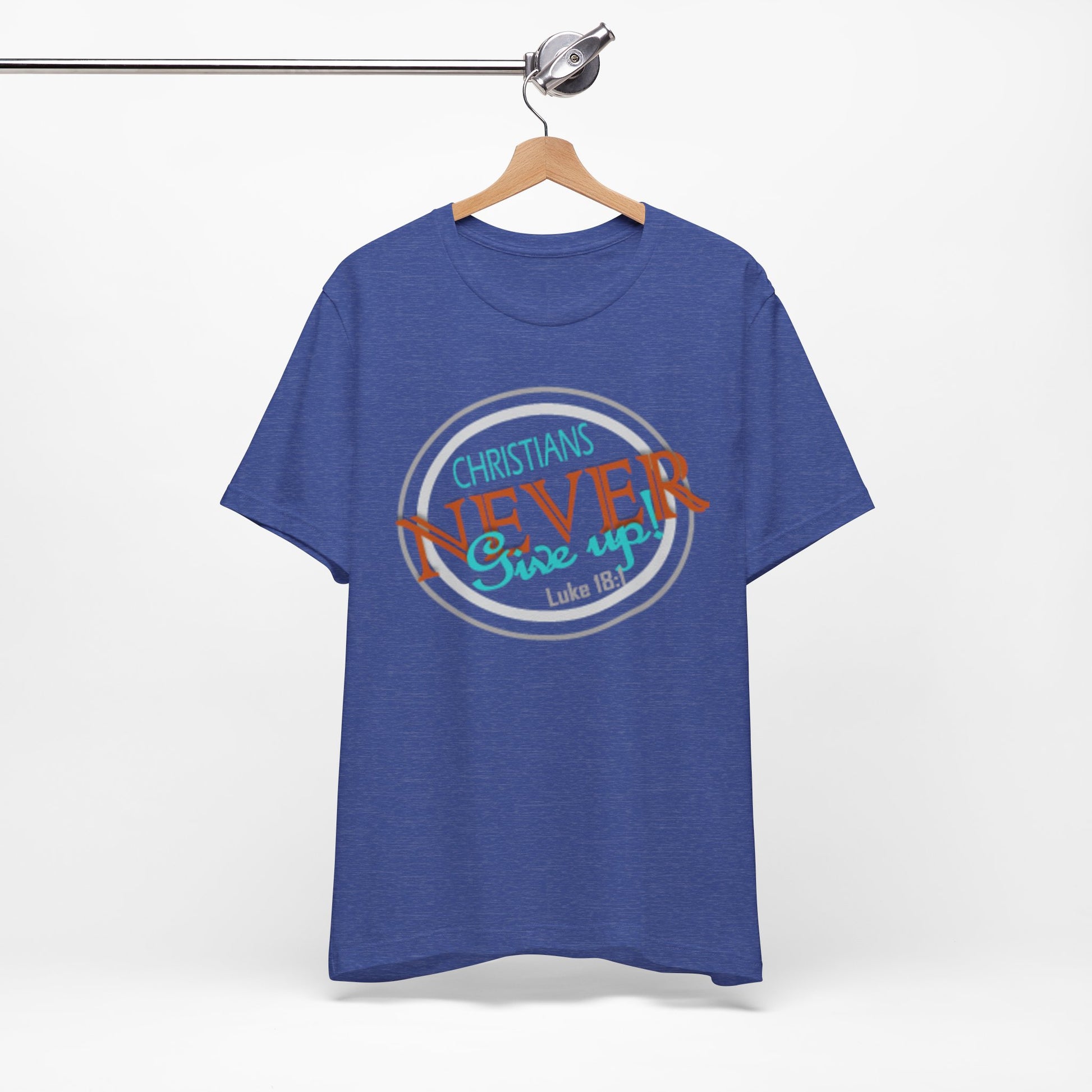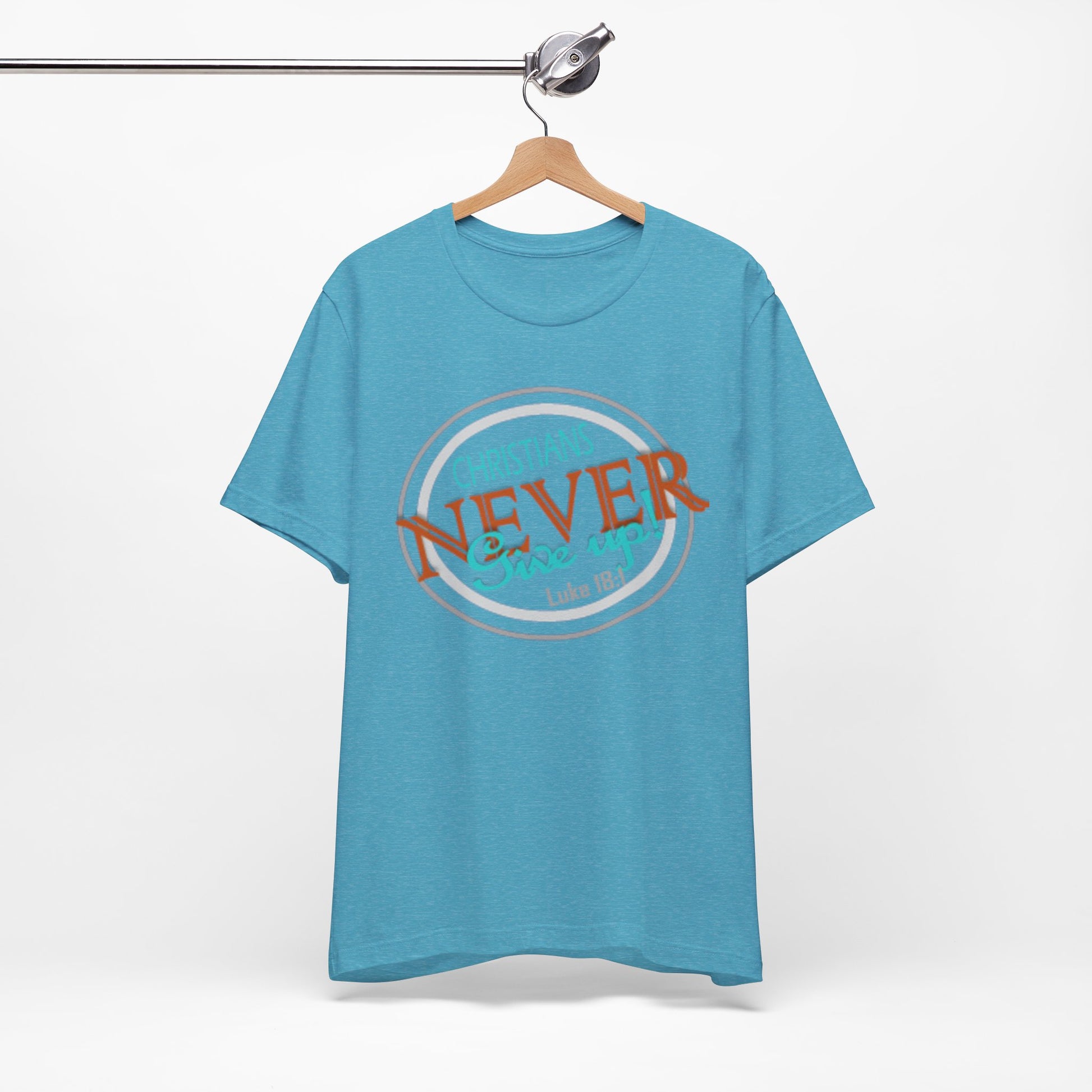 This lightweight crew-neck tee carries a faith-forward message with an easygoing, lived-in vibe. The soft Airlume combed and ring-spun cotton feels airy against the skin while the retail cut keeps the silhouette neat — great for layering under a cardigan or wearing solo on warm mornings. The front graphic blends script and bold lettering to read “Christians NEVER Give up,” evoking quiet resolve and gentle encouragement rather than loud proclamation. Subtle color contrasts in the print give it a vintage, slightly weathered look that feels personal and wearable every day. Finished with a ribbed knit collar, shoulder tape for stability, and a tear-away label for comfort, this tee feels thoughtful from fabric to print. It’s made with responsible manufacturing practices and REACH-certified materials, so it fits into a mindful wardrobe as comfortably as it fits into moments of quiet faith or community fellowship.