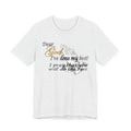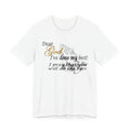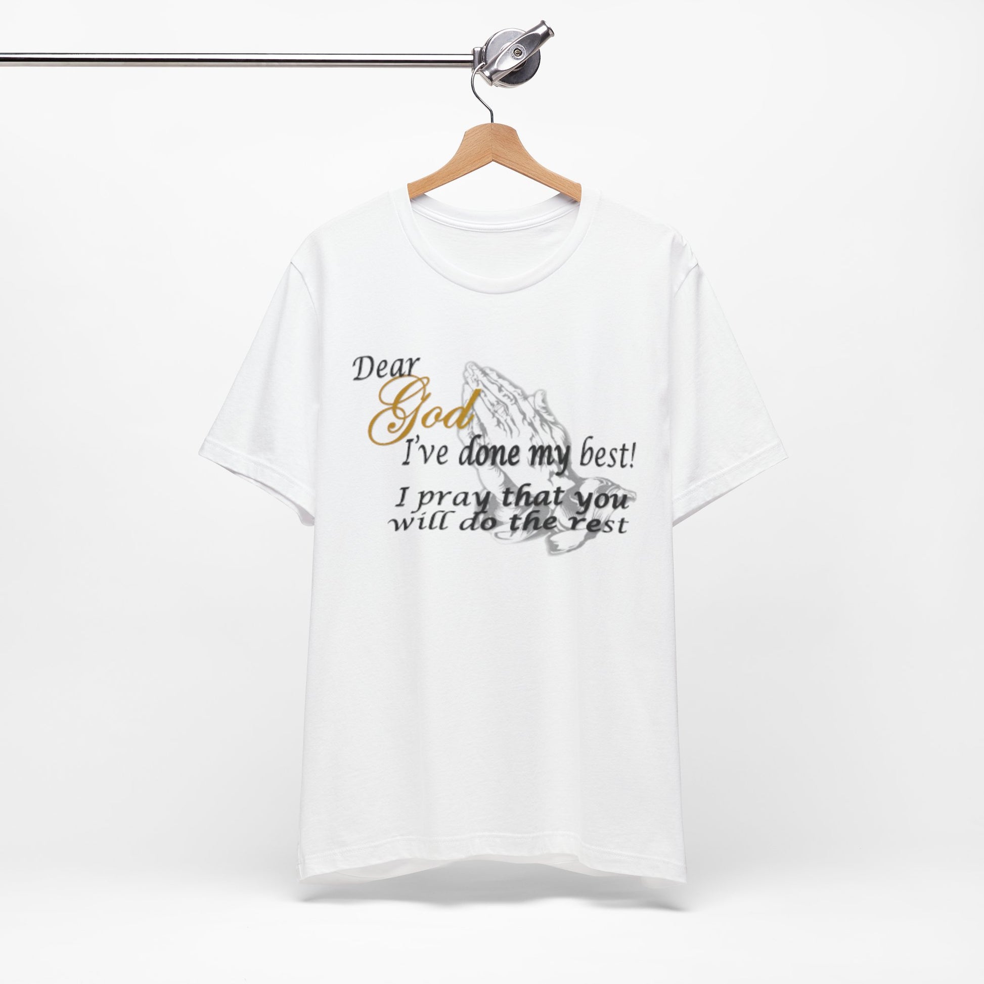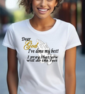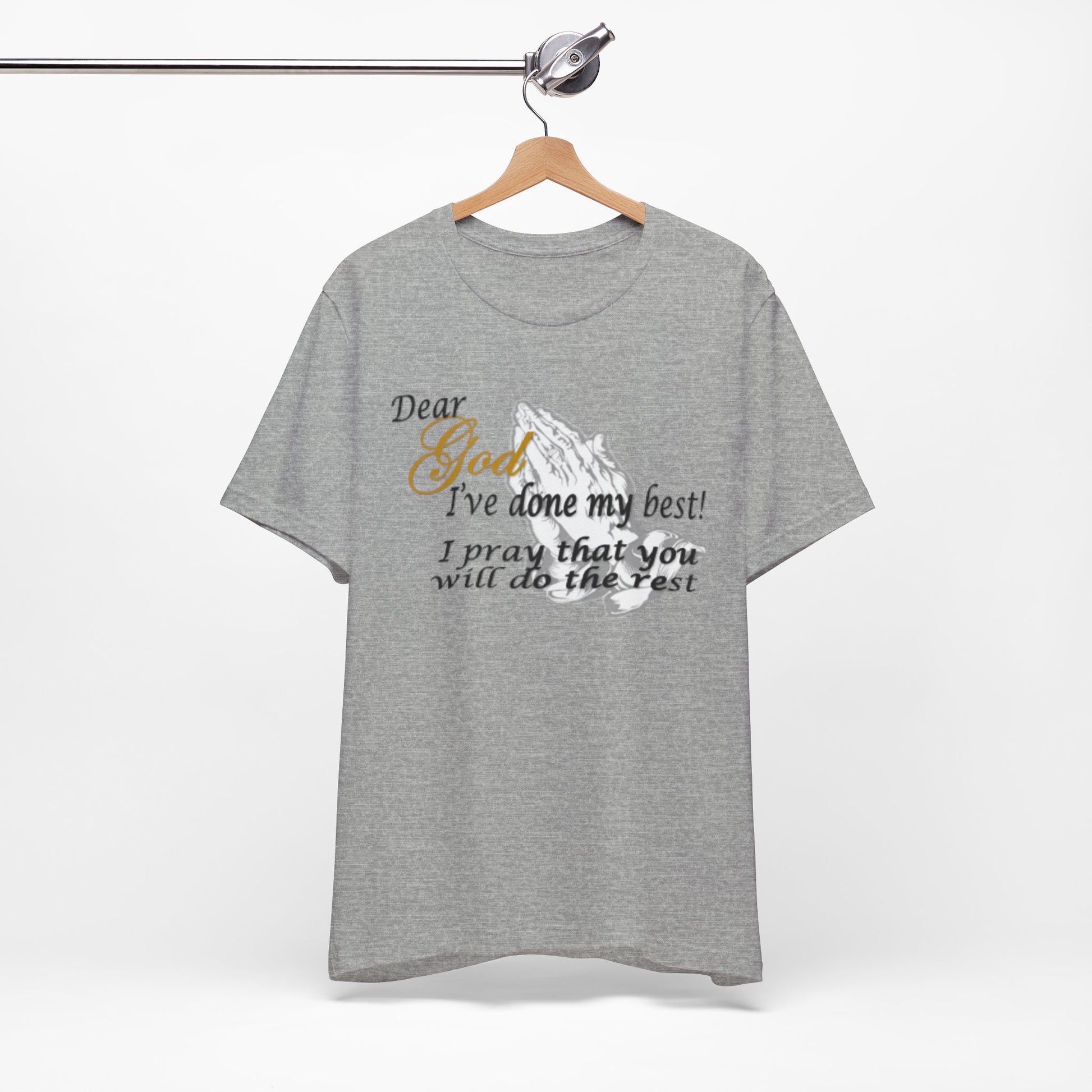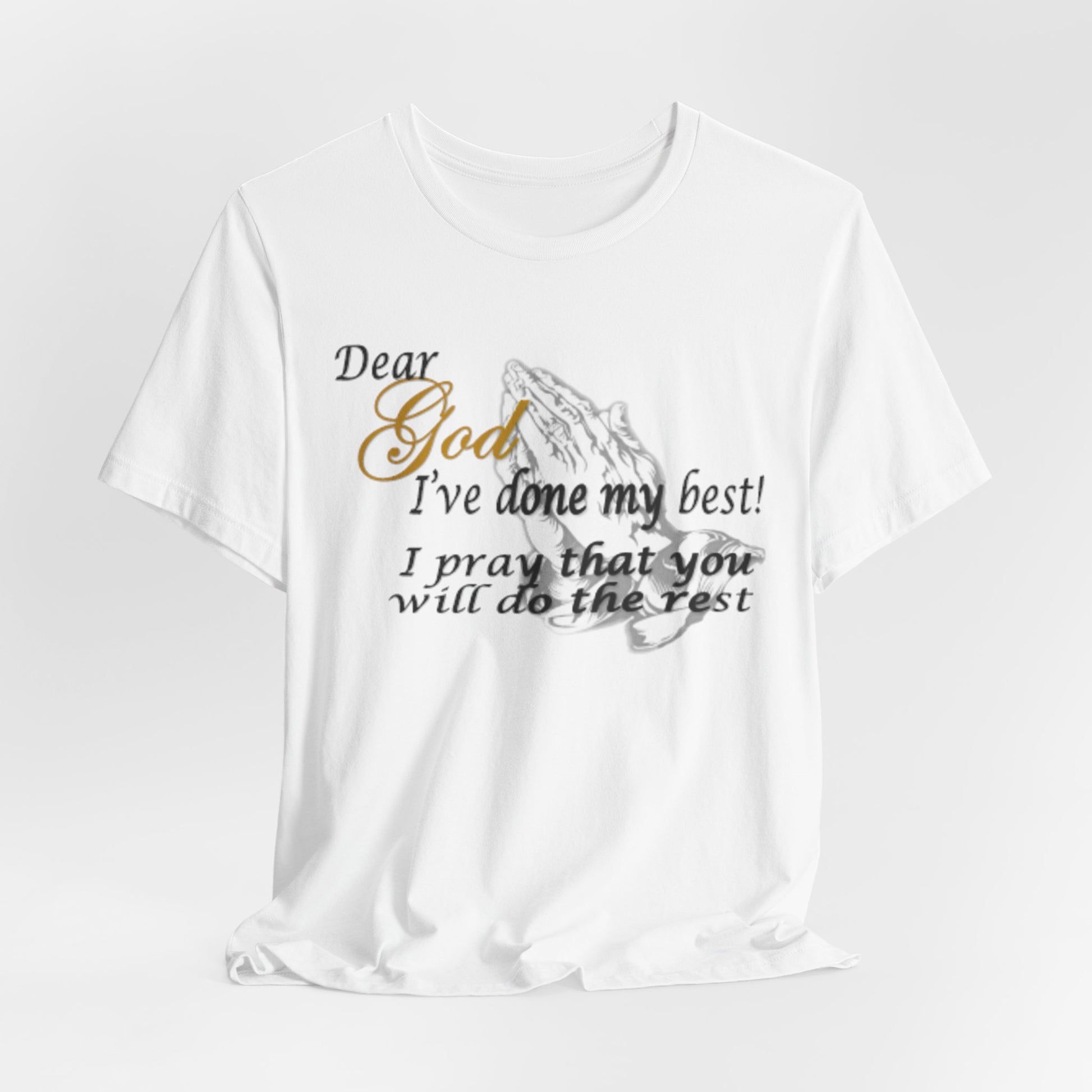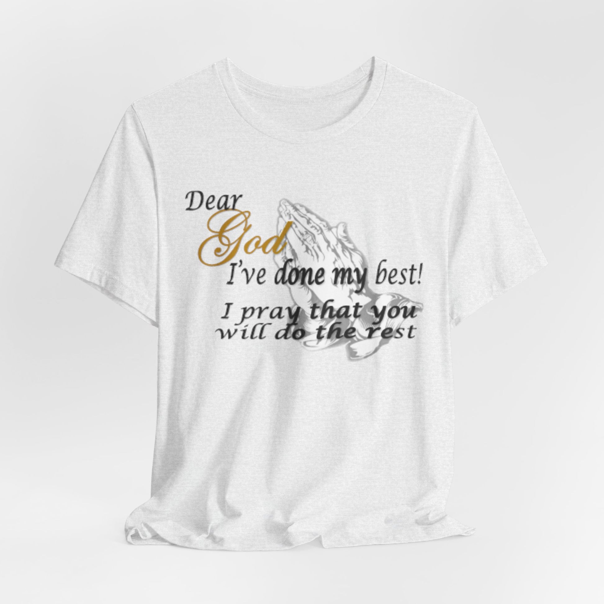 A soft, breathable tee that carries a quiet, heartfelt message. Lightweight Airlume combed cotton gives it a smooth hand and clean drape, letting the subtle front print—praying hands and the words “Dear God, I’ve done my best! I pray that you will do the rest”—sit comfortably over the chest. The crew neckline and retail fit make it easy to layer under a cardigan or wear alone during church, volunteer shifts, or slow Sunday afternoons. Thoughtful construction—side seams, ribbed collar, shoulder tape, and a tear-away label—keeps the shirt comfortable and long-lasting. Worn by someone who values faith, humility, and everyday devotion, this tee reads like a quiet affirmation that travels with you through daily life.