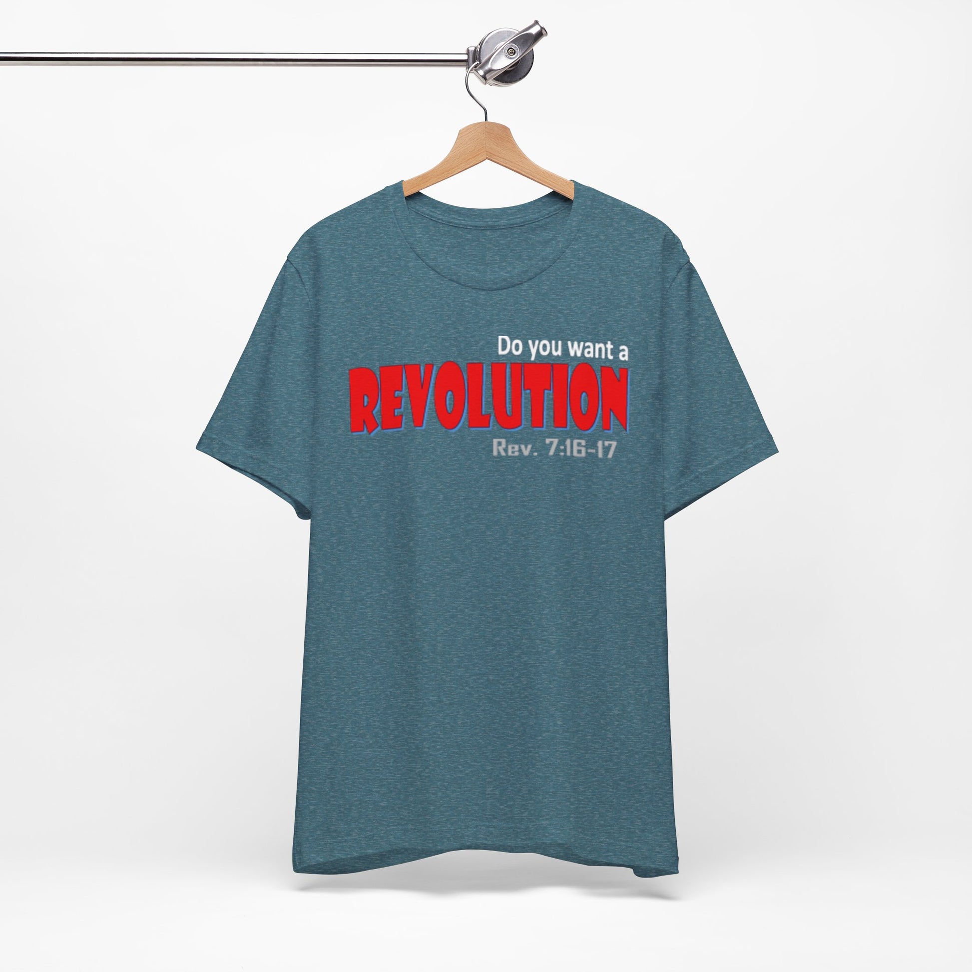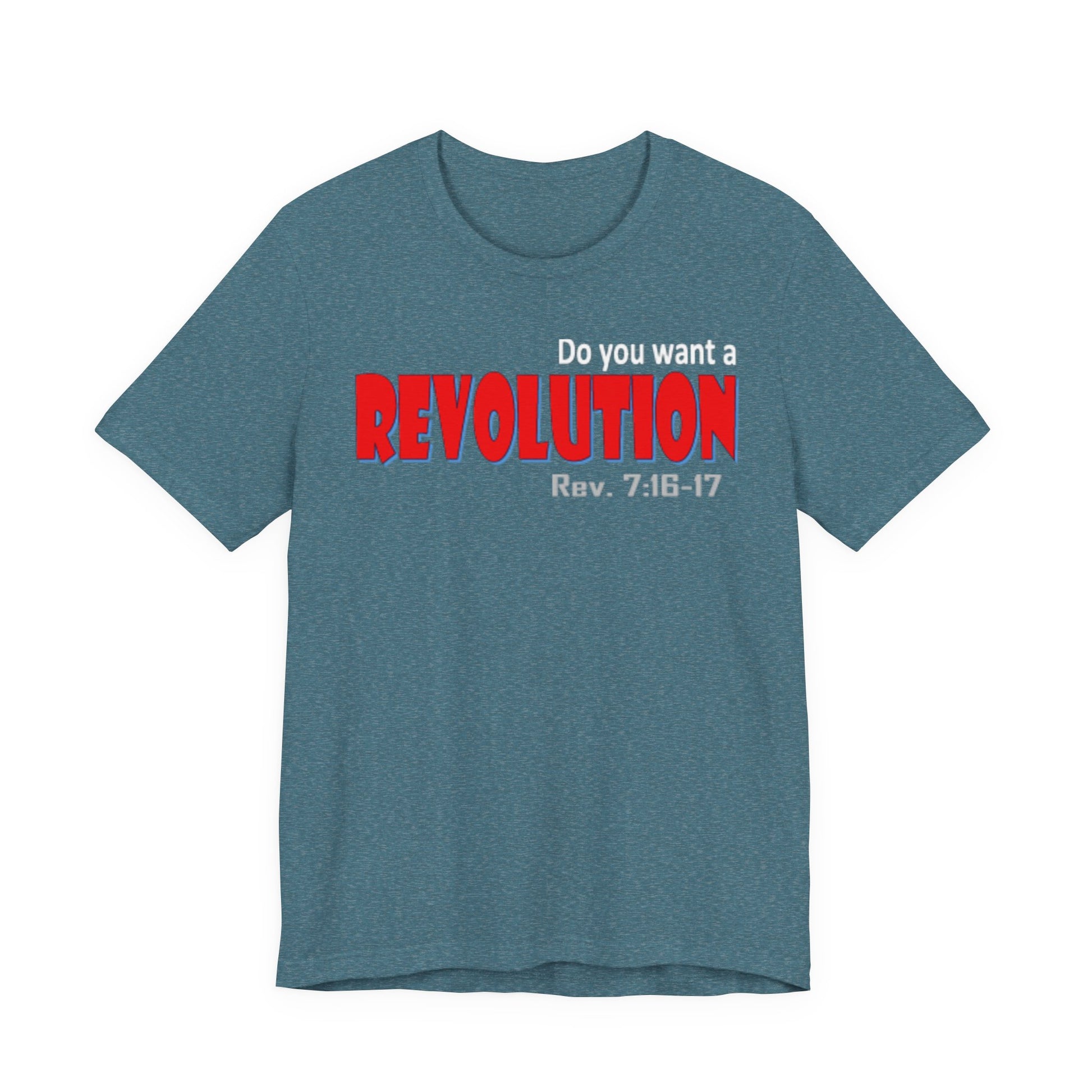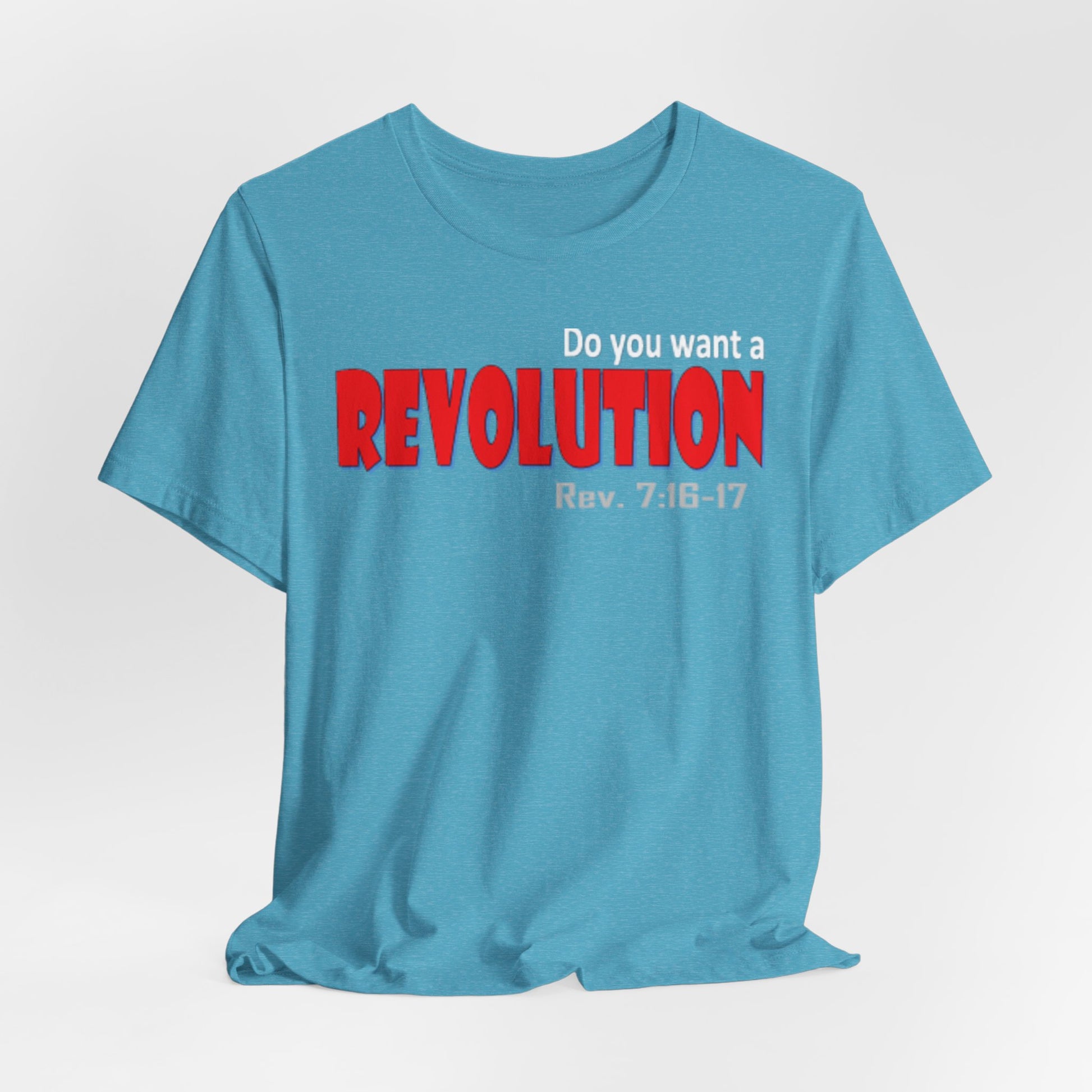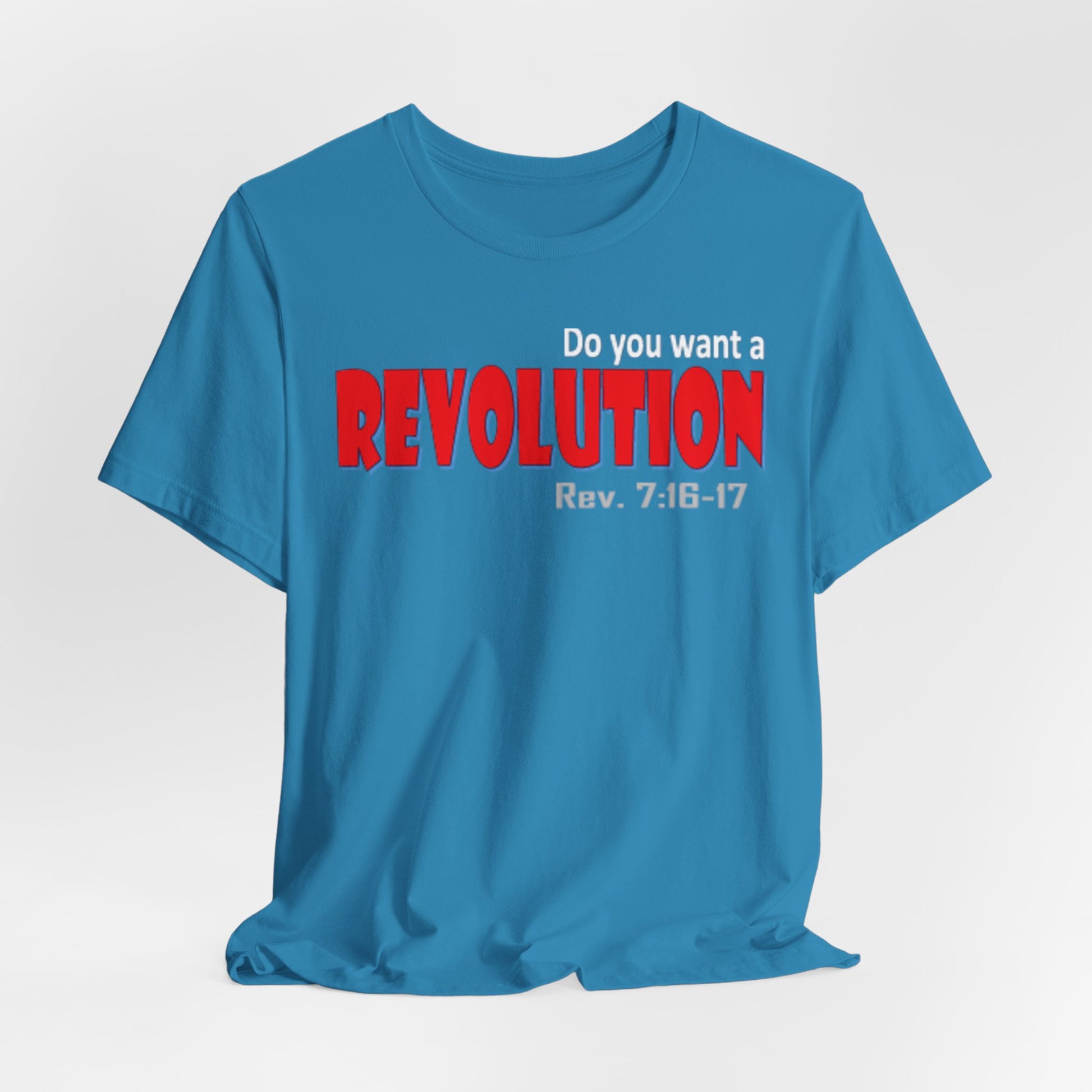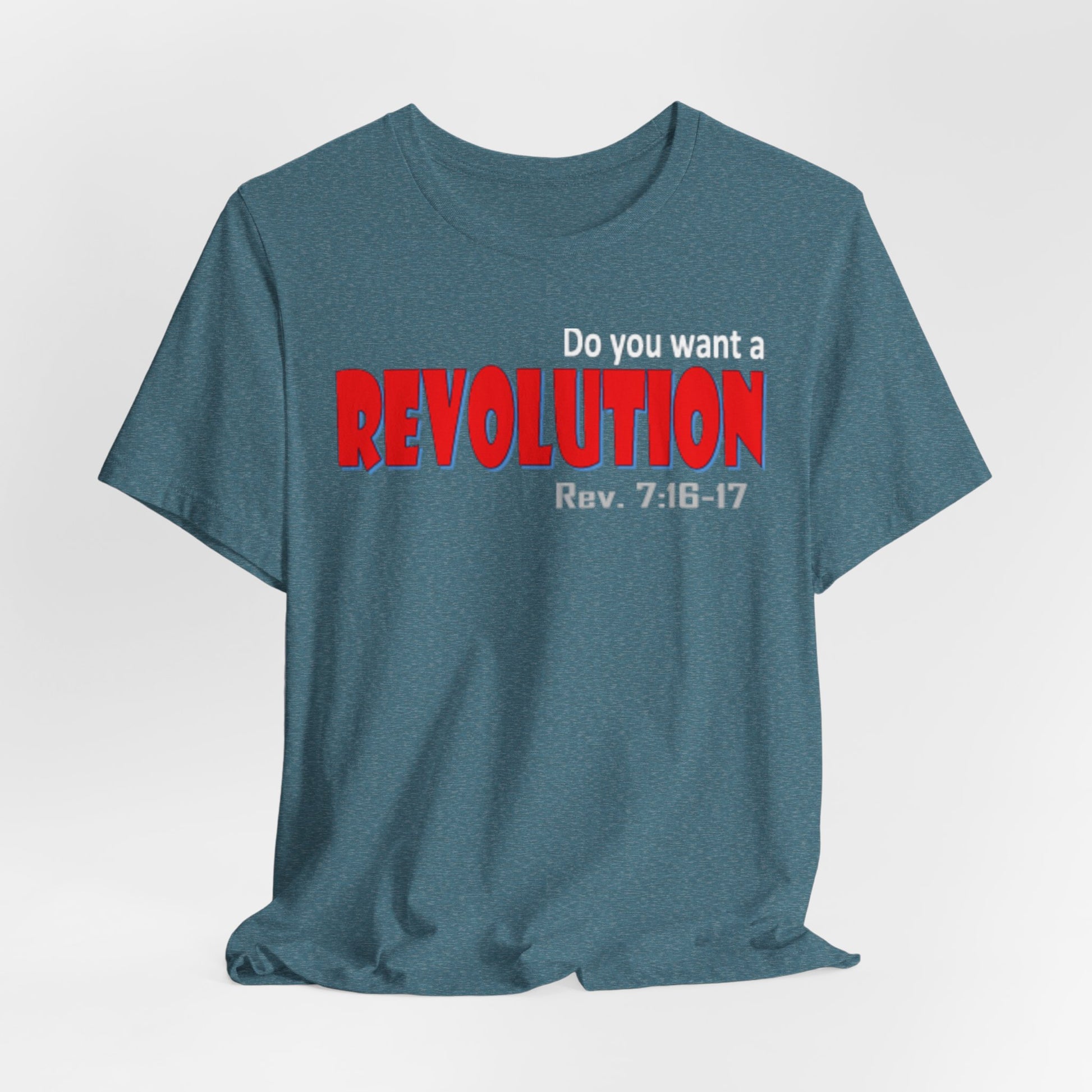 Lightweight, breathable tee with a bold typographic design that reads “REVOLUTION” in striking red. The soft Airlume combed and ring-spun cotton fabric drapes easily and layers well—comfortable for long days on the move or casual meet-ups. Thoughtful construction details (side seams, ribbed collar, shoulder tape) keep the shirt looking sharp after many washes. The design sits across the chest for clear, confident wear; subtle scripture reference under the main word adds a personal, reflective touch for those who connect with it. Ethically produced and REACH certified, this tee pairs well with jeans, jackets, or under a blazer when you want an edge without shouting for attention.