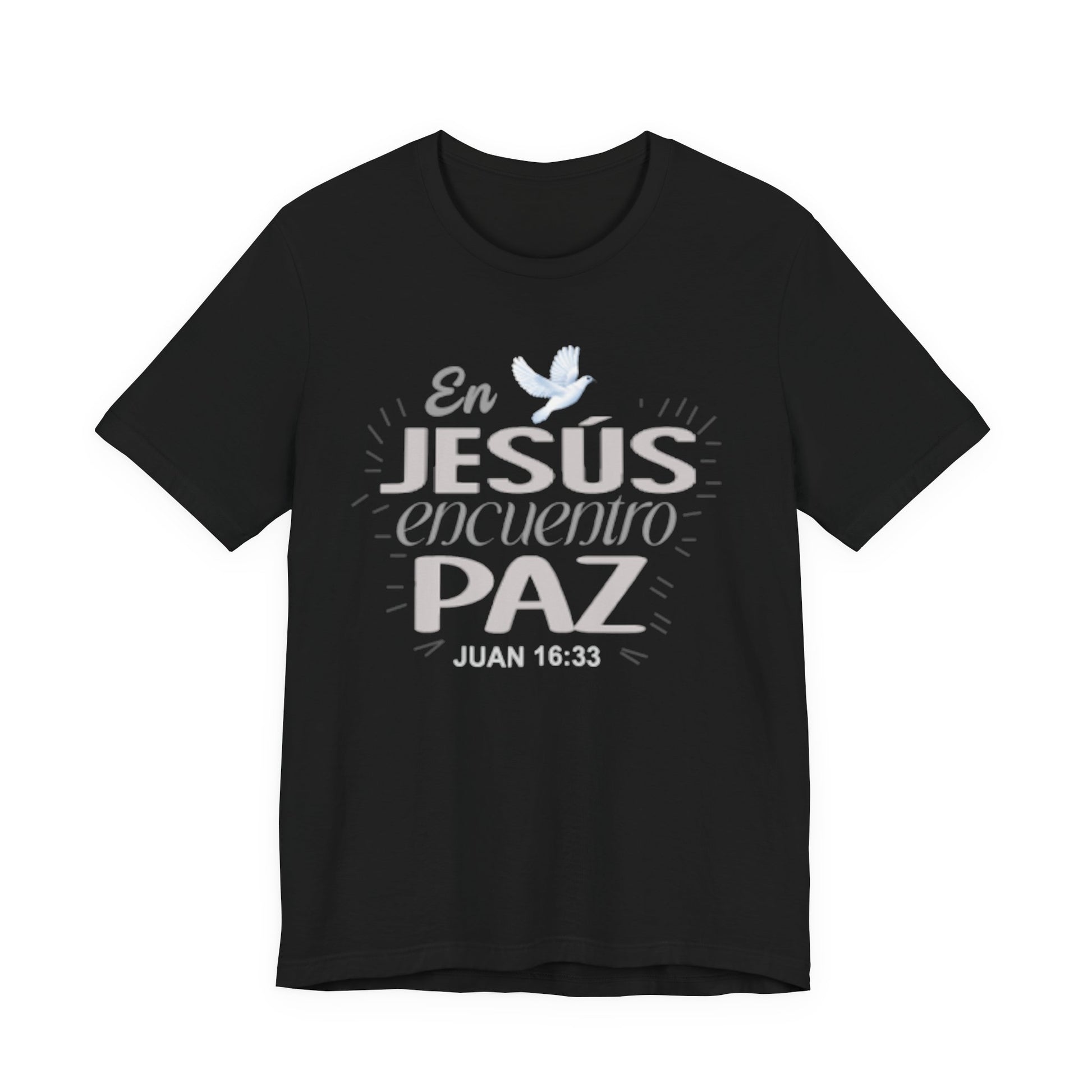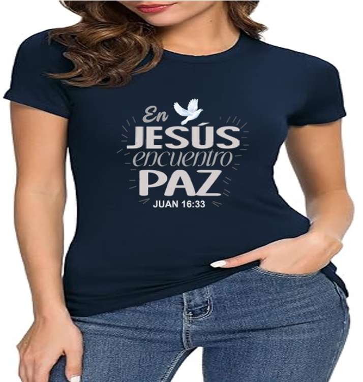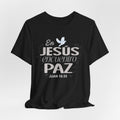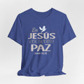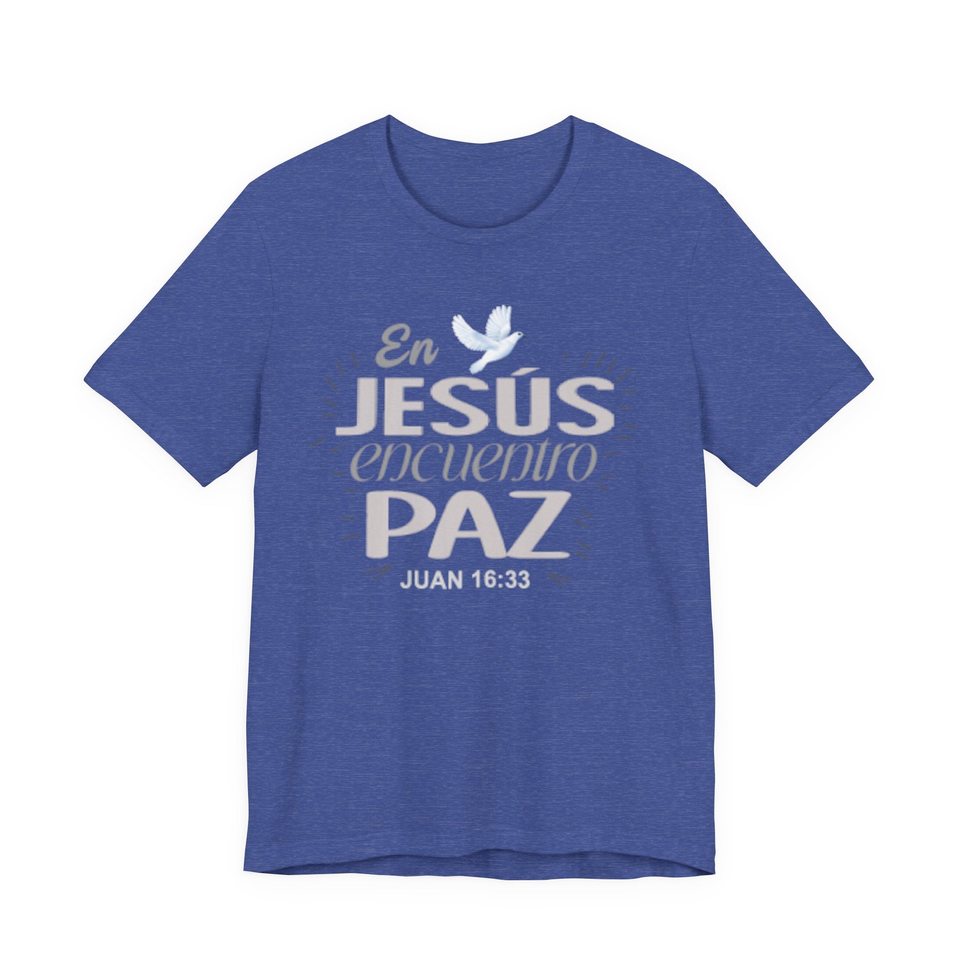 A soft, breathable cotton tee that quietly carries a message of faith and calm. The front features a gentle Spanish lettering layout — "En JESUS encuentro PAZ" with a small dove accent — rendered in light, airy tones that sit subtly against the fabric. Lightweight and easy to layer, this shirt settles into everyday routines: worn to church gatherings, volunteer meetups, quiet mornings with coffee, or evenings of reflection. The crew neck and retail cut keep the silhouette neat and comfortable, while the tear-away label and ribbed collar reduce irritation. Thoughtful construction details like side seams and shoulder tape help it keep shape through repeated wear and washes. If you look for clothing that speaks softly about faith and brings a sense of calm to daily life, this tee fits into those moments with understated grace.