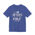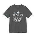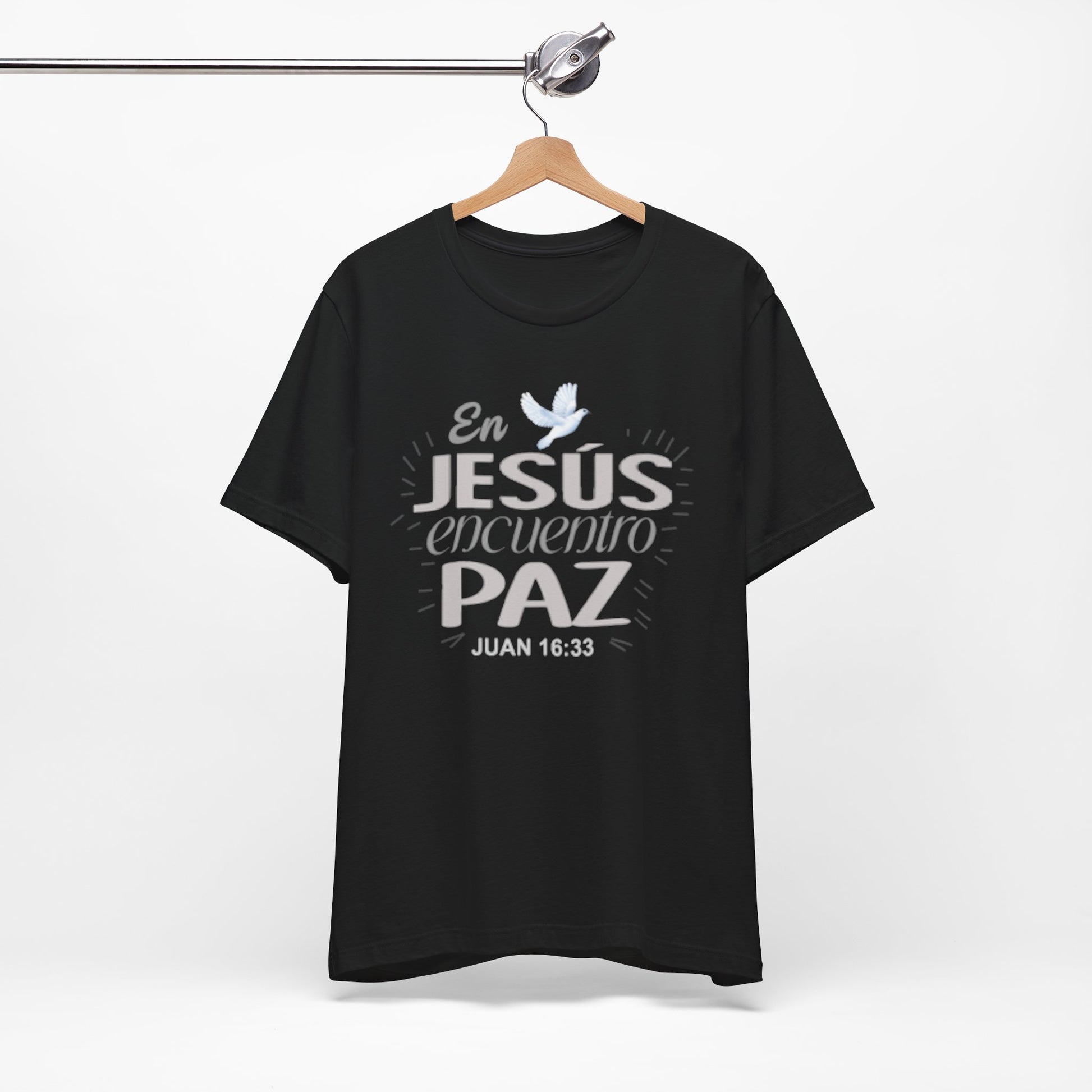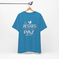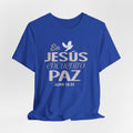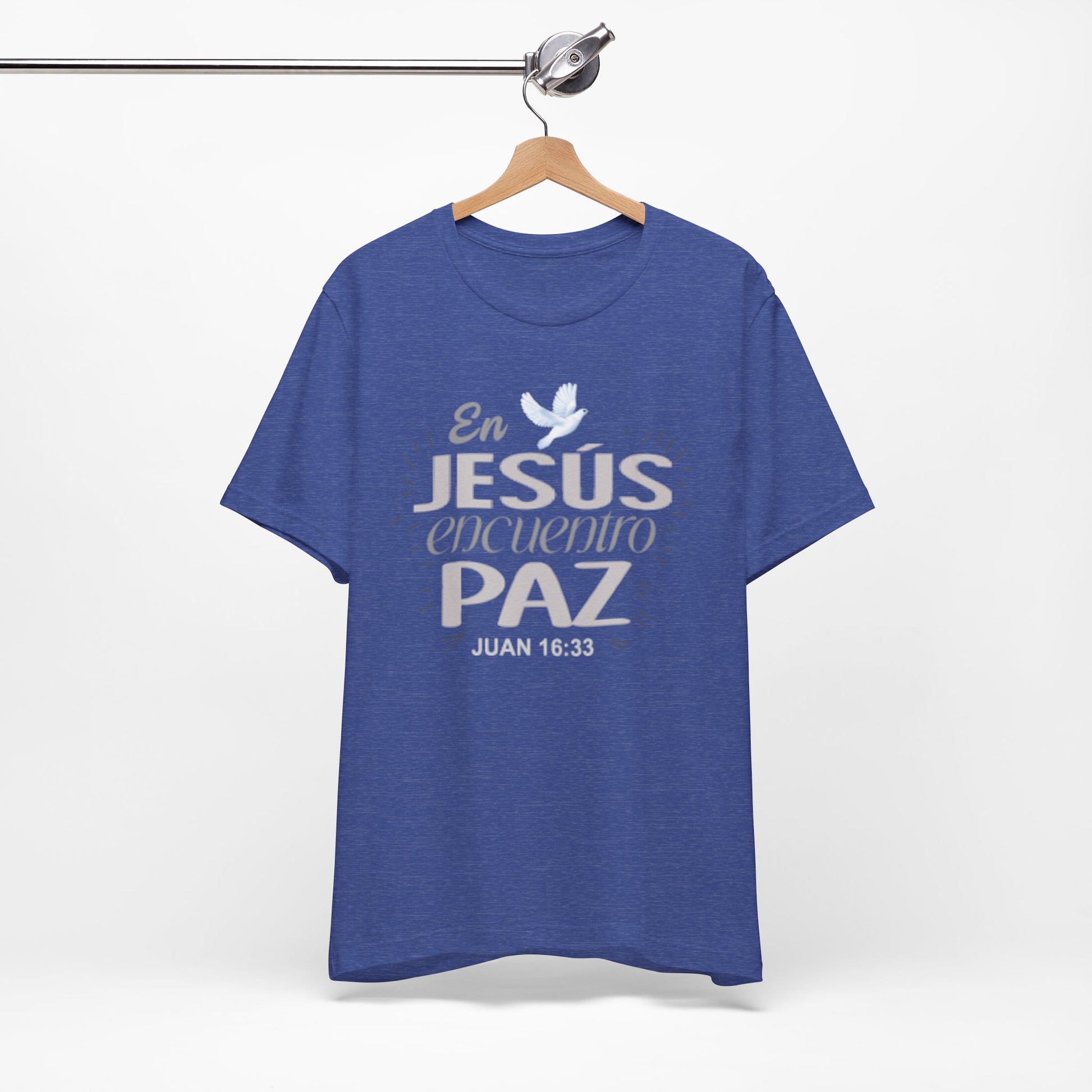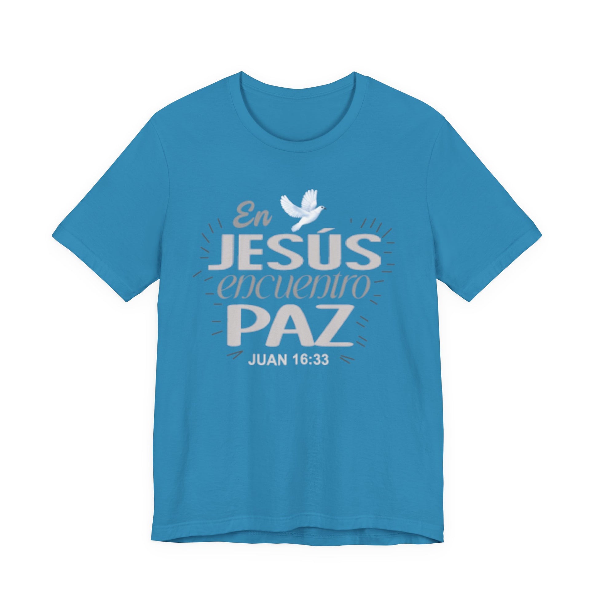 A soft, breathable cotton tee that quietly carries a message of faith and calm. The front features a gentle Spanish lettering layout — "En JESUS encuentro PAZ" with a small dove accent — rendered in light, airy tones that sit subtly against the fabric. Lightweight and easy to layer, this shirt settles into everyday routines: worn to church gatherings, volunteer meetups, quiet mornings with coffee, or evenings of reflection. The crew neck and retail cut keep the silhouette neat and comfortable, while the tear-away label and ribbed collar reduce irritation. Thoughtful construction details like side seams and shoulder tape help it keep shape through repeated wear and washes. If you look for clothing that speaks softly about faith and brings a sense of calm to daily life, this tee fits into those moments with understated grace.
