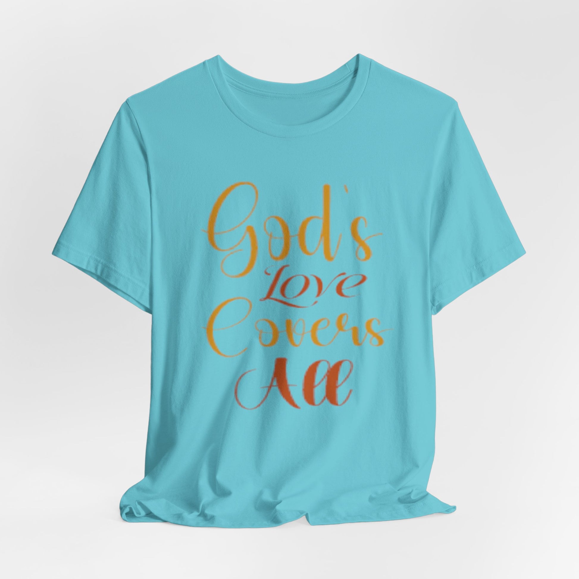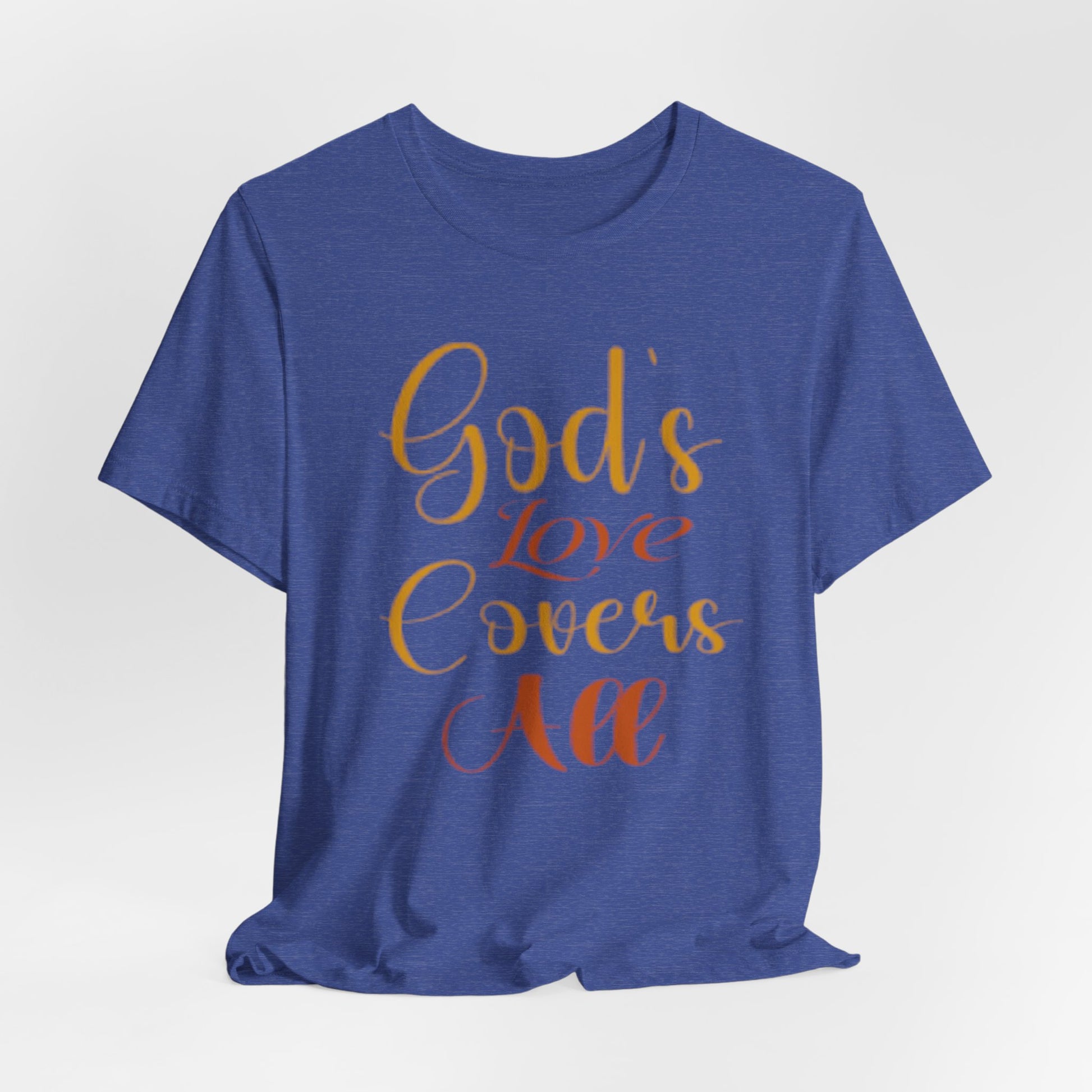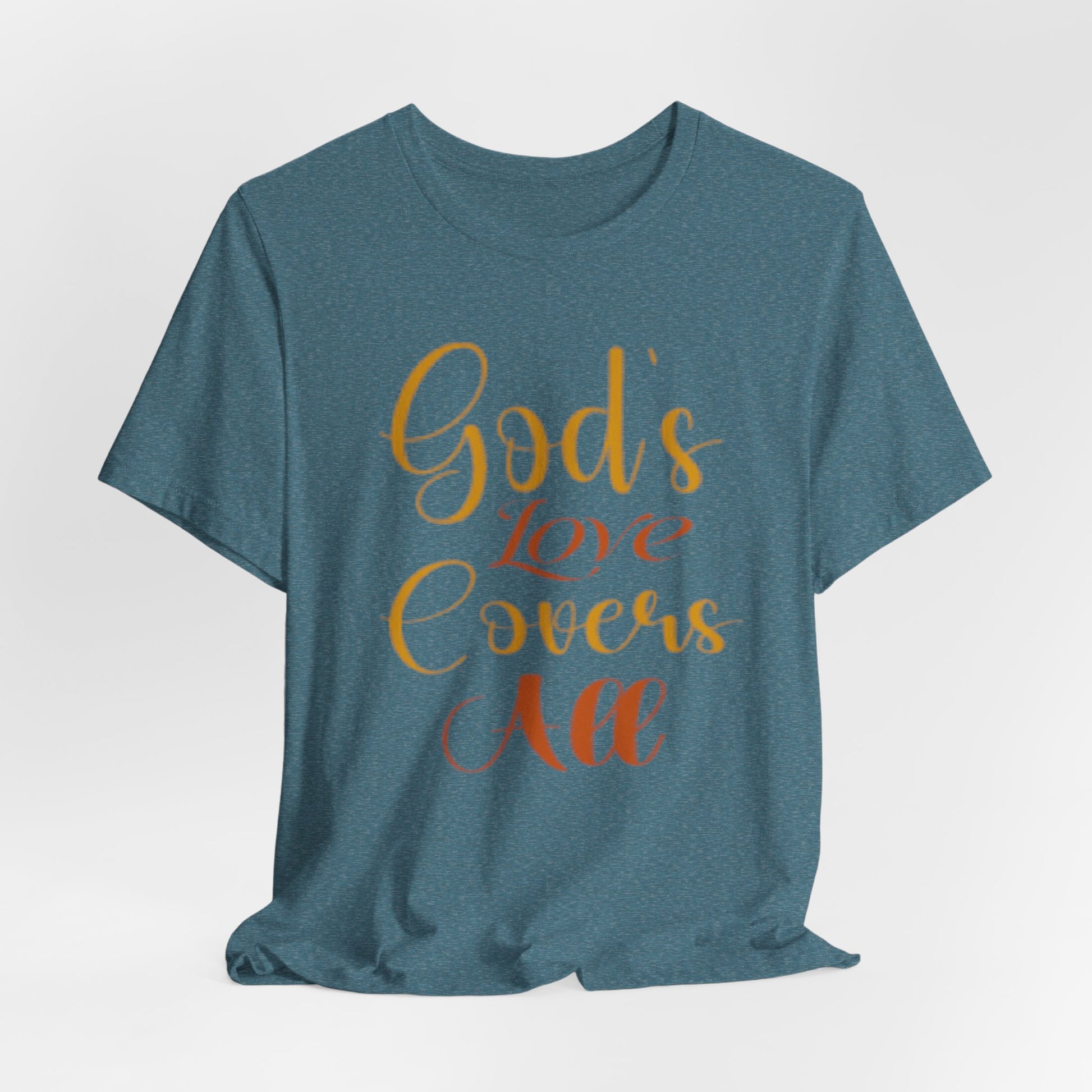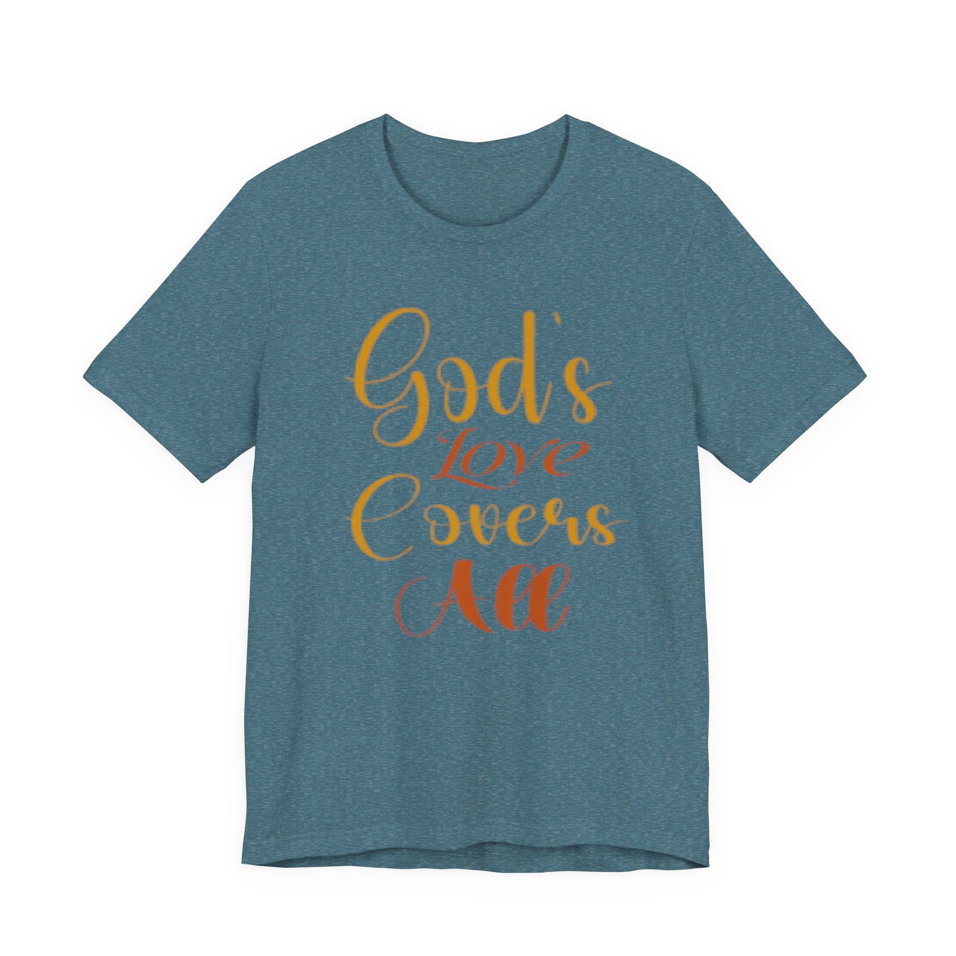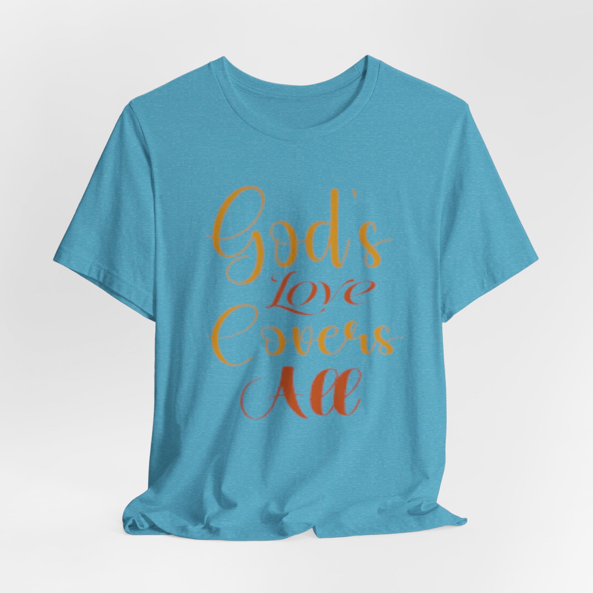 A lightweight, soft cotton tee printed with warm, handwritten lettering that reads “God’s Love Covers All.” It feels like slipping into a quiet morning of faith—calm, honest, and gently reassuring. The subtle, brush-style typography carries a soft metallic sheen against a clean white background, so the message reads like a quiet promise rather than a shout. Wear it to church, small-group nights, volunteer days, or when you need a wearable reminder of grace. The retail cut keeps the silhouette tidy for layering under jackets or pairing with jeans, while the tear-away label and breathable Airlume cotton make it comfortable for long Sundays and everyday living.