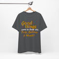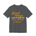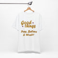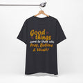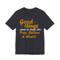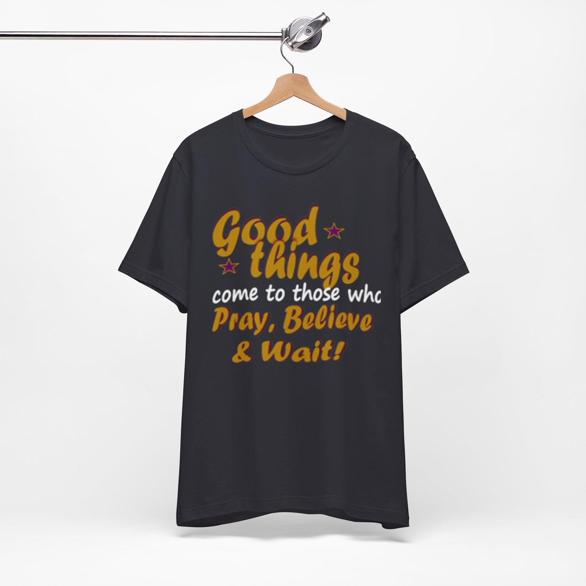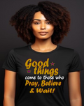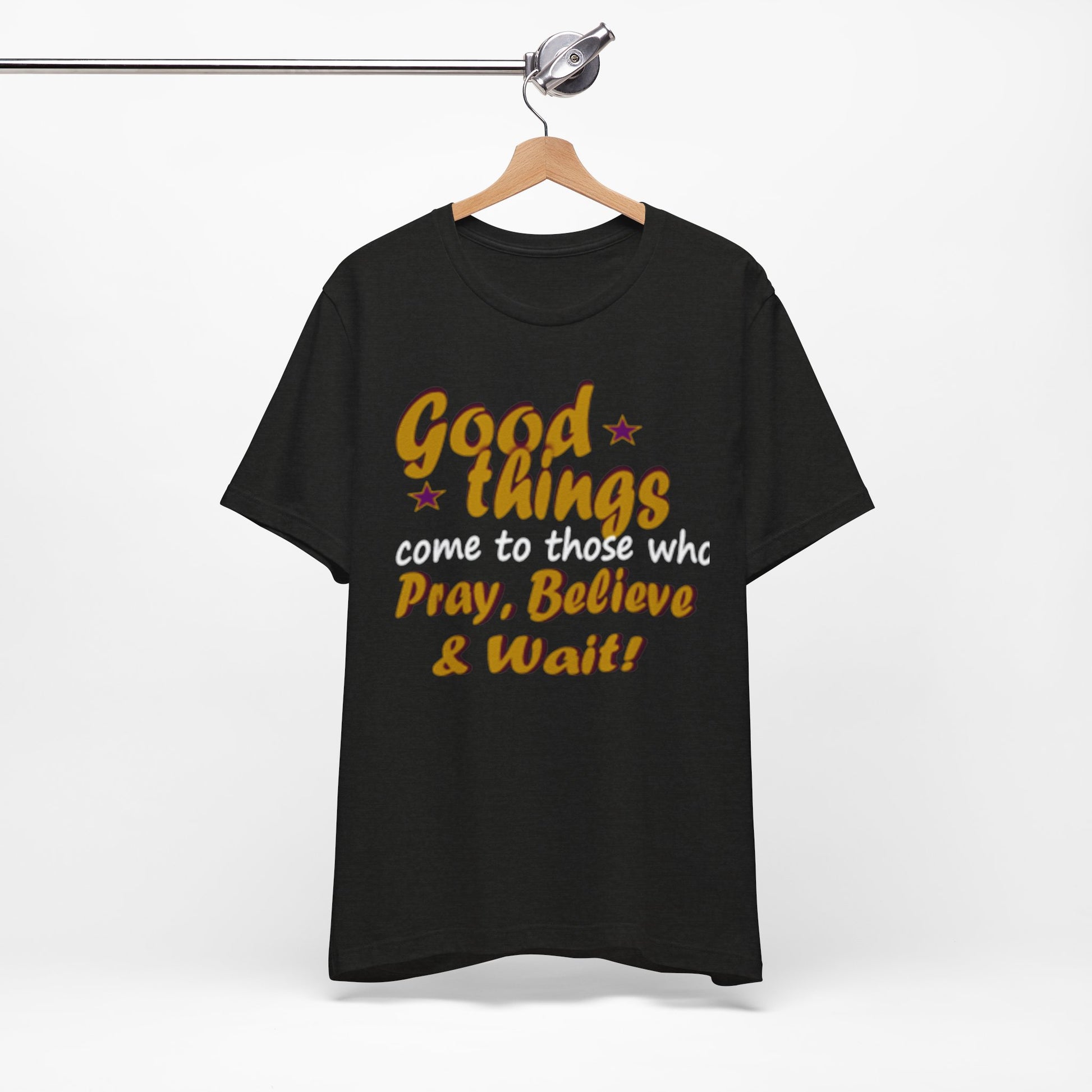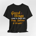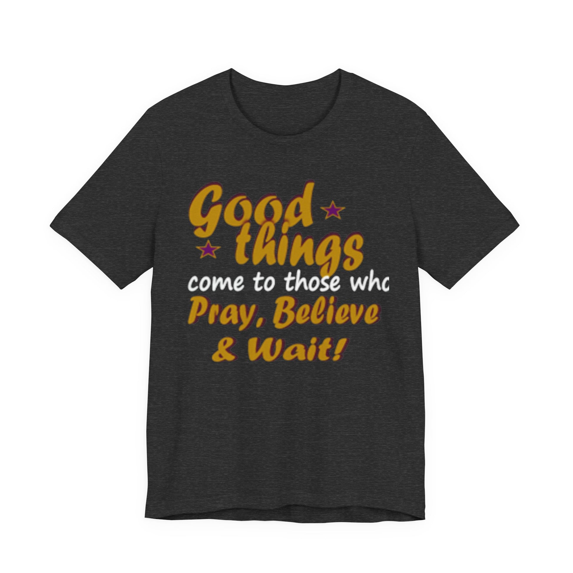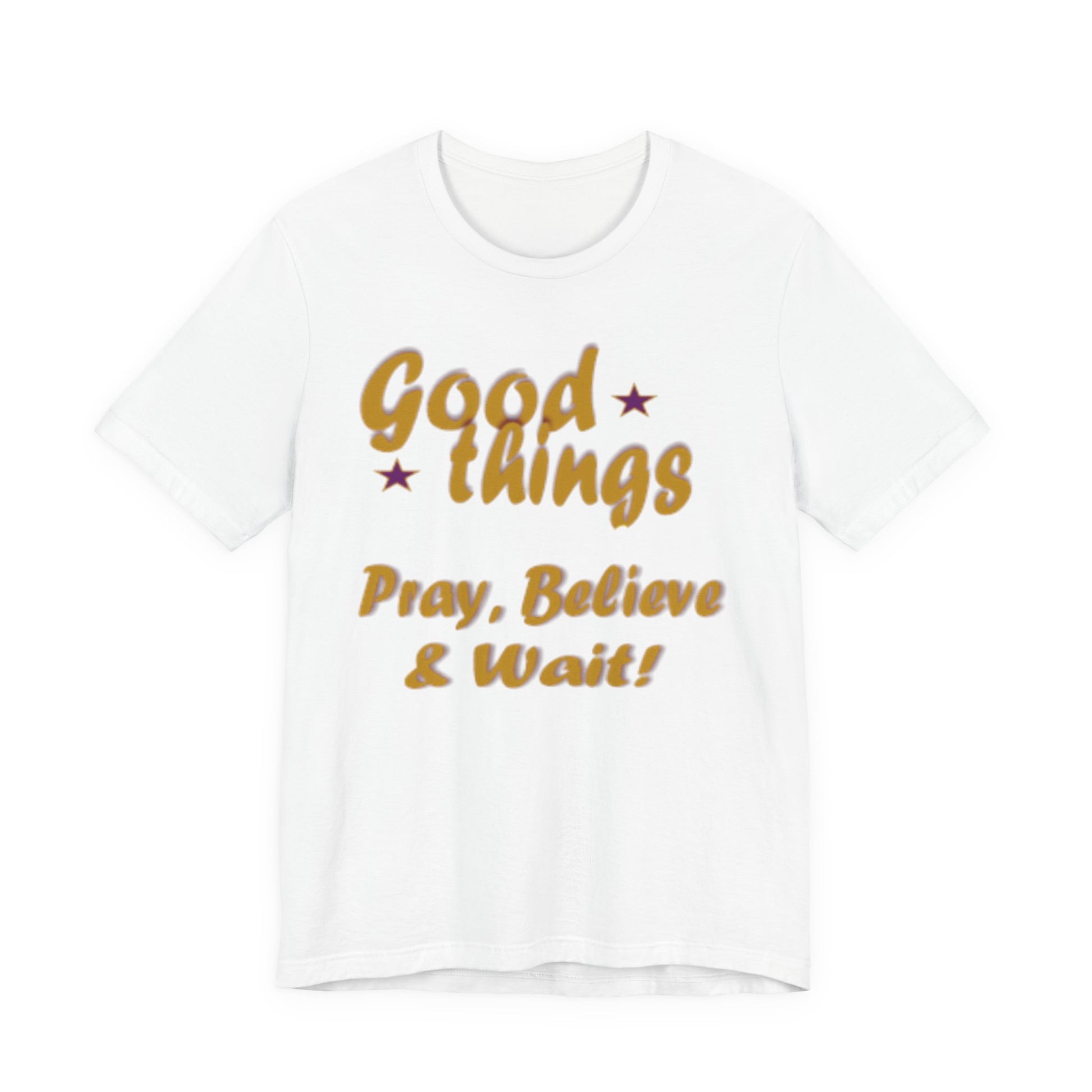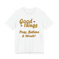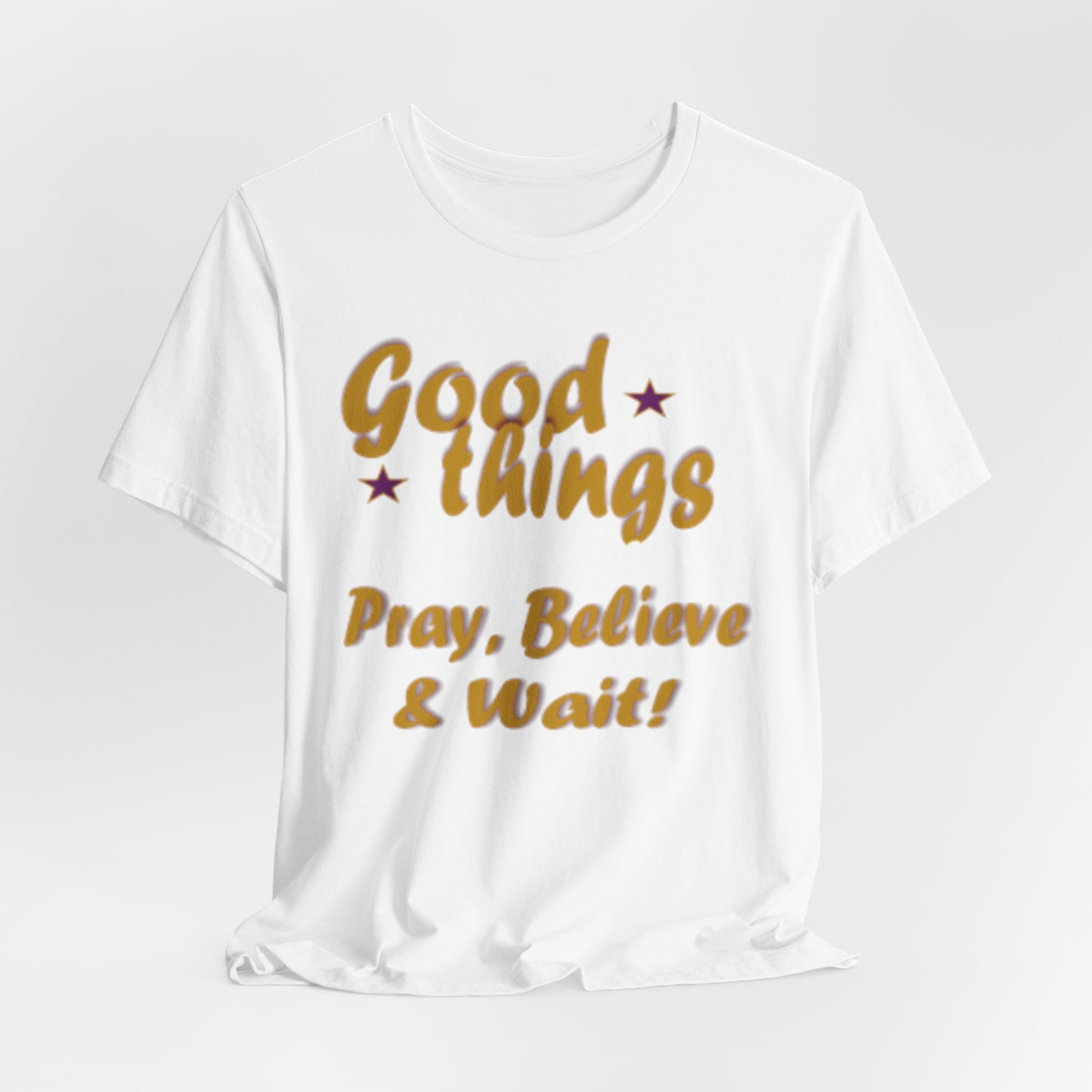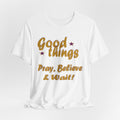A soft, breathable tee that speaks gently to patience and faith. The vintage-inspired lettering reads “Good things — Pray, Believe & Wait!” in warm gold tones with subtle star accents, giving a calm, hopeful vibe. Lightweight Airlume combed cotton keeps you cool while side seams and ribbed collar hold the shape wash after wash. Wear it on quiet mornings with coffee, to community gatherings, or layered under a jacket for relaxed weekend plans. The tear-away label and thoughtful construction make it comfortable for all-day wear — an easy companion for moments when you want to move through life with intention and quiet confidence.