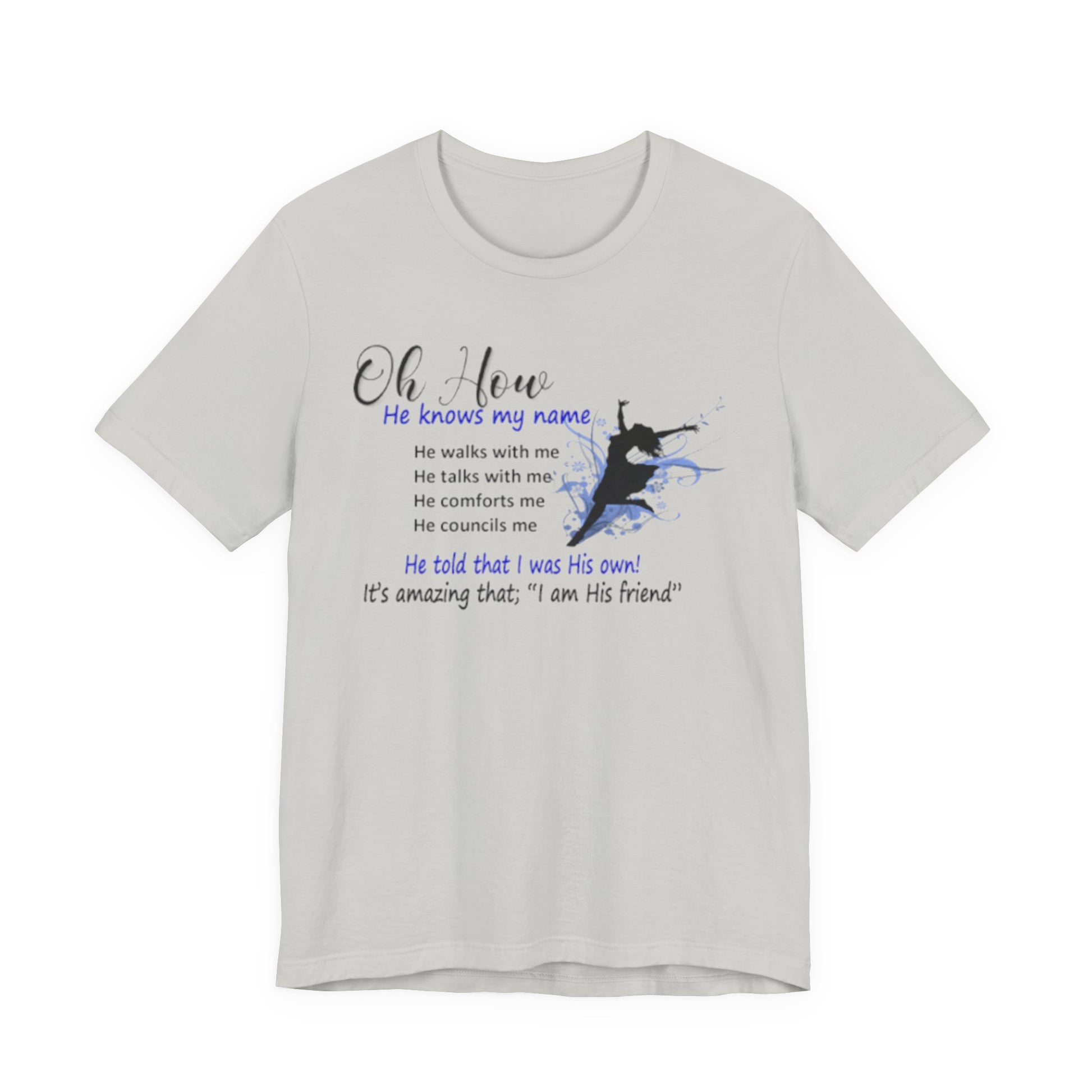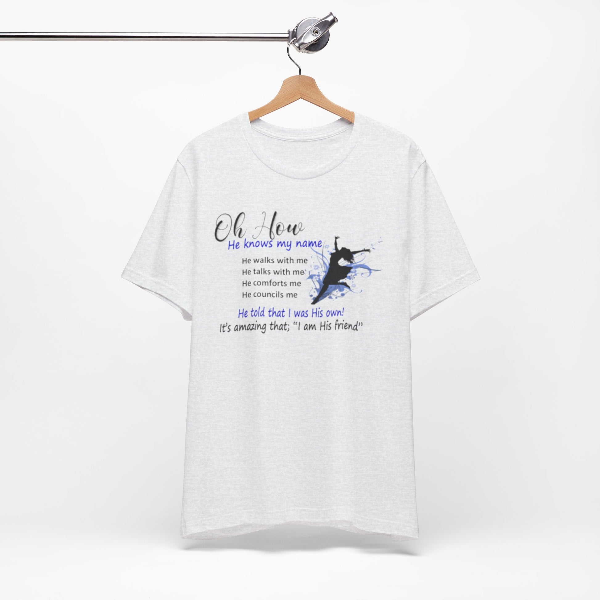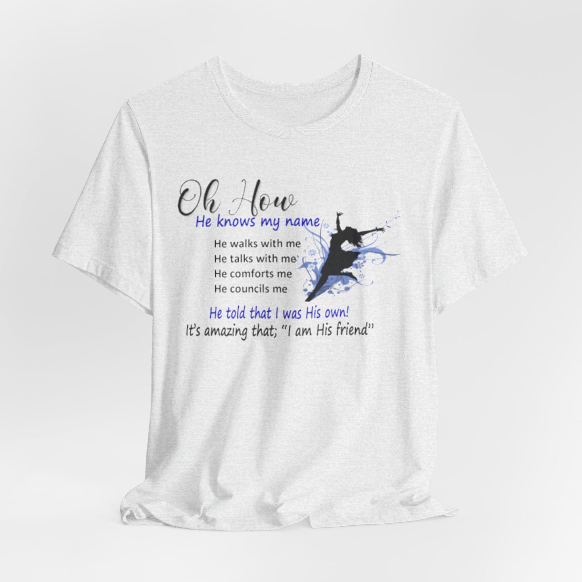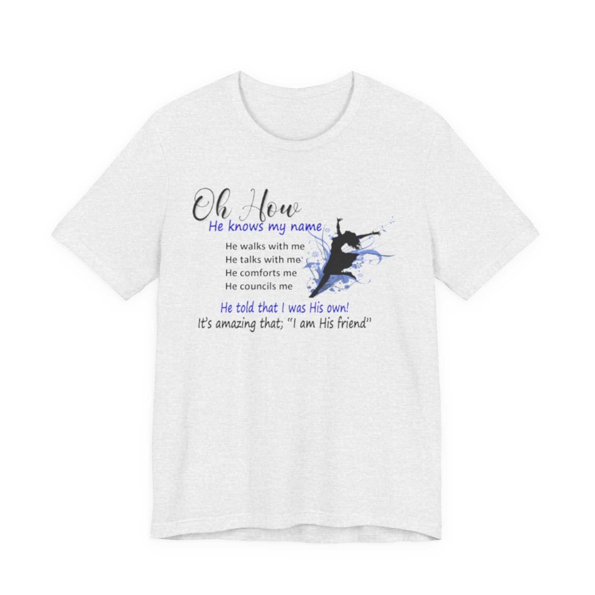 Lightweight, soft, and quietly expressive. This jersey tee pairs breathable Airlume combed and ring-spun cotton with a gentle faith-centered design that reads like a whispered reminder. Short sleeves and a classic crew neckline keep the silhouette familiar and easy to layer. The front graphic—subtle watercolor tones and a small silhouette—carries a personal message about relationship and comfort. Wear it for slow mornings, community gatherings, or days when you want your clothing to reflect a quiet confidence and steady hope.