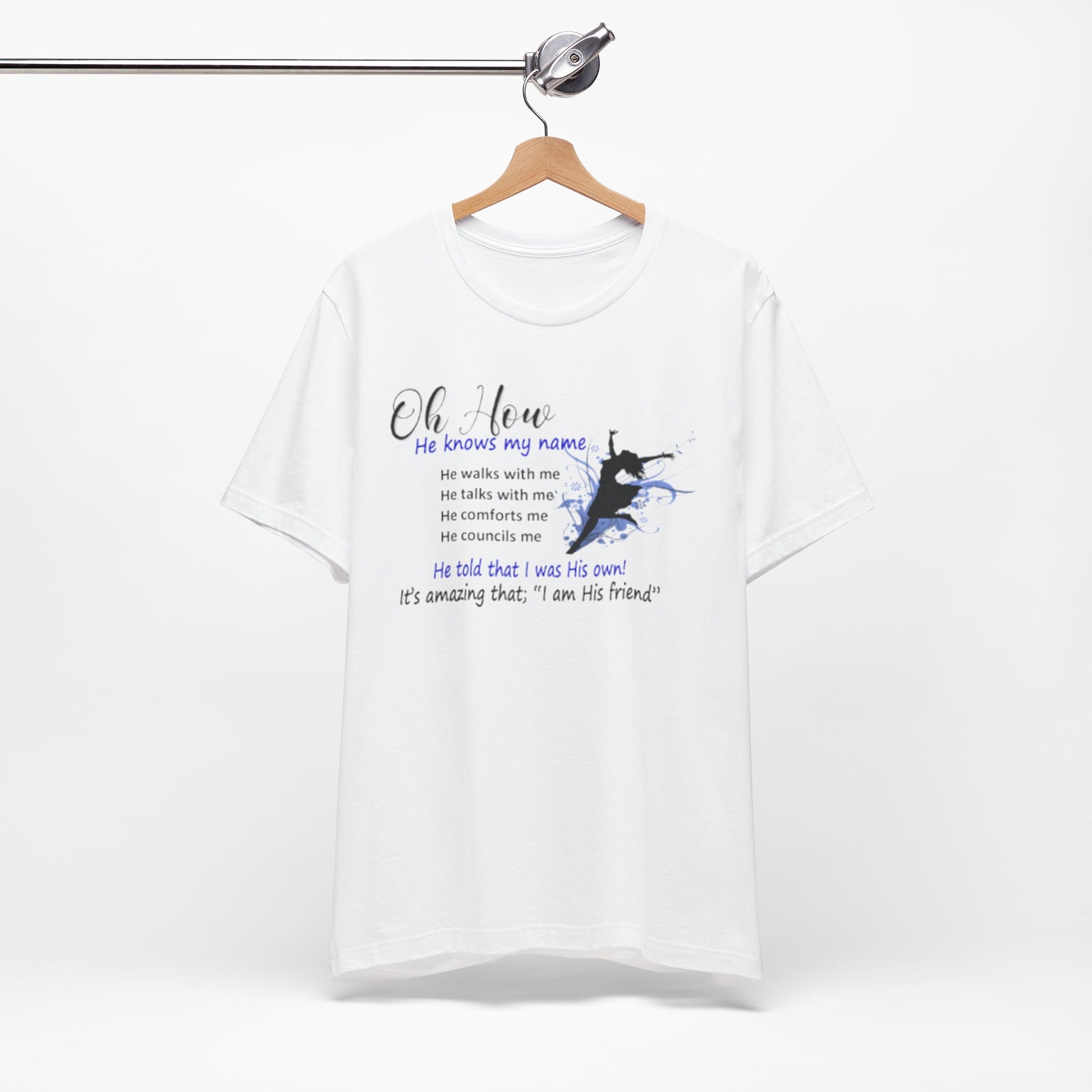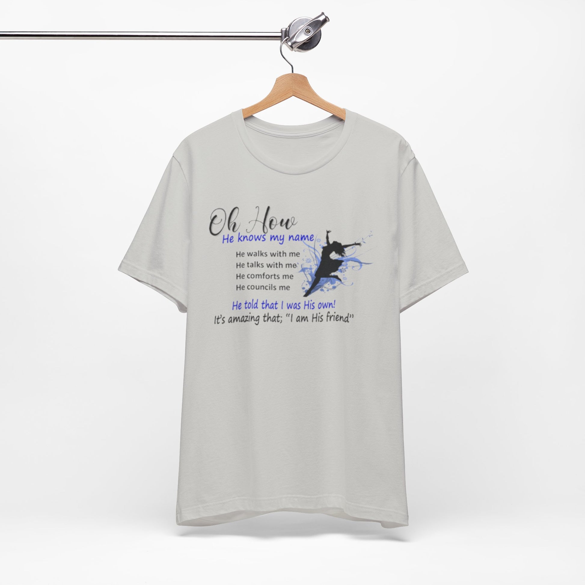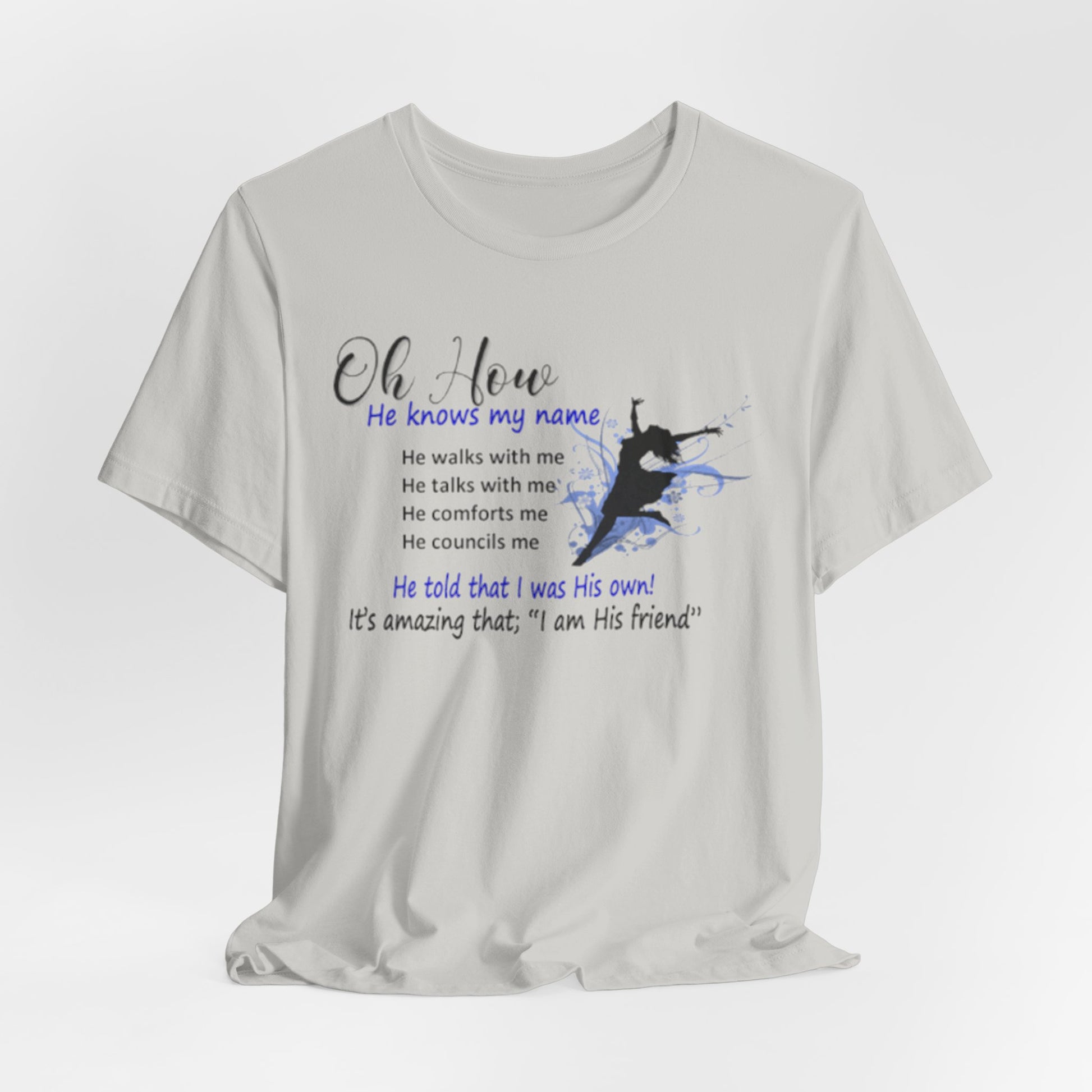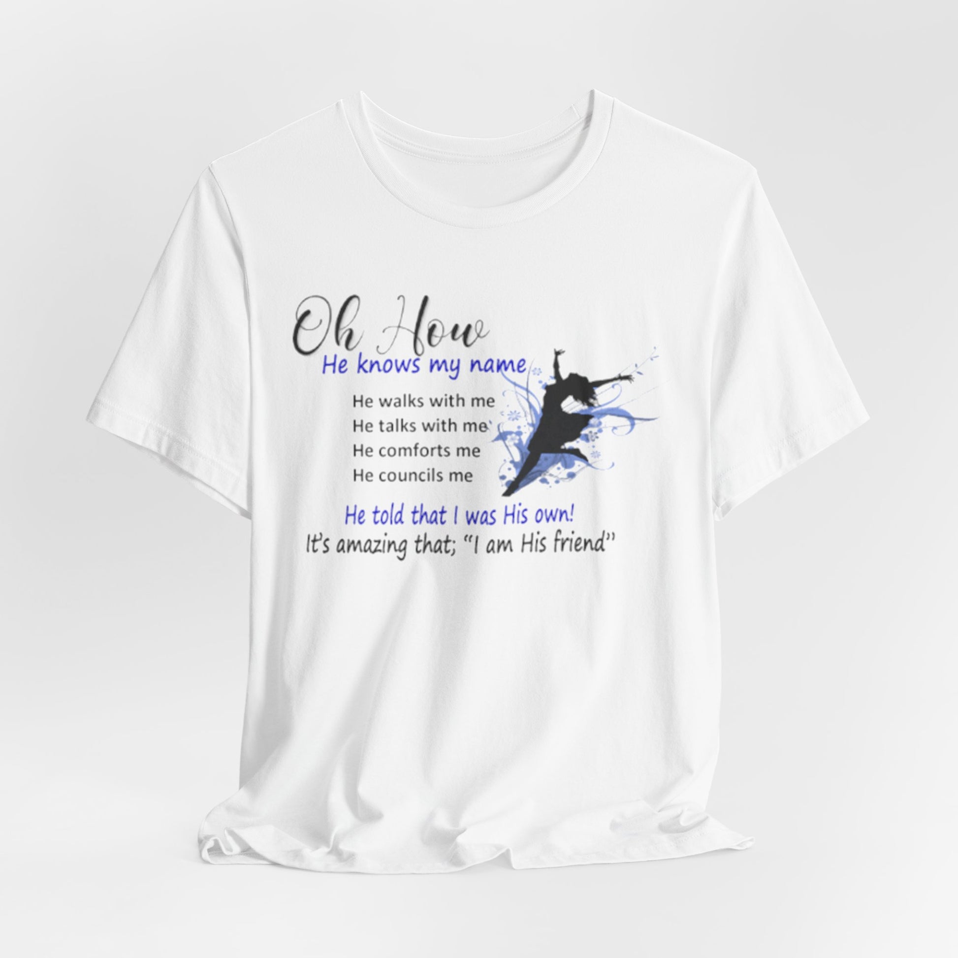 Lightweight, soft, and quietly expressive. This jersey tee pairs breathable Airlume combed and ring-spun cotton with a gentle faith-centered design that reads like a whispered reminder. Short sleeves and a classic crew neckline keep the silhouette familiar and easy to layer. The front graphic—subtle watercolor tones and a small silhouette—carries a personal message about relationship and comfort. Wear it for slow mornings, community gatherings, or days when you want your clothing to reflect a quiet confidence and steady hope.