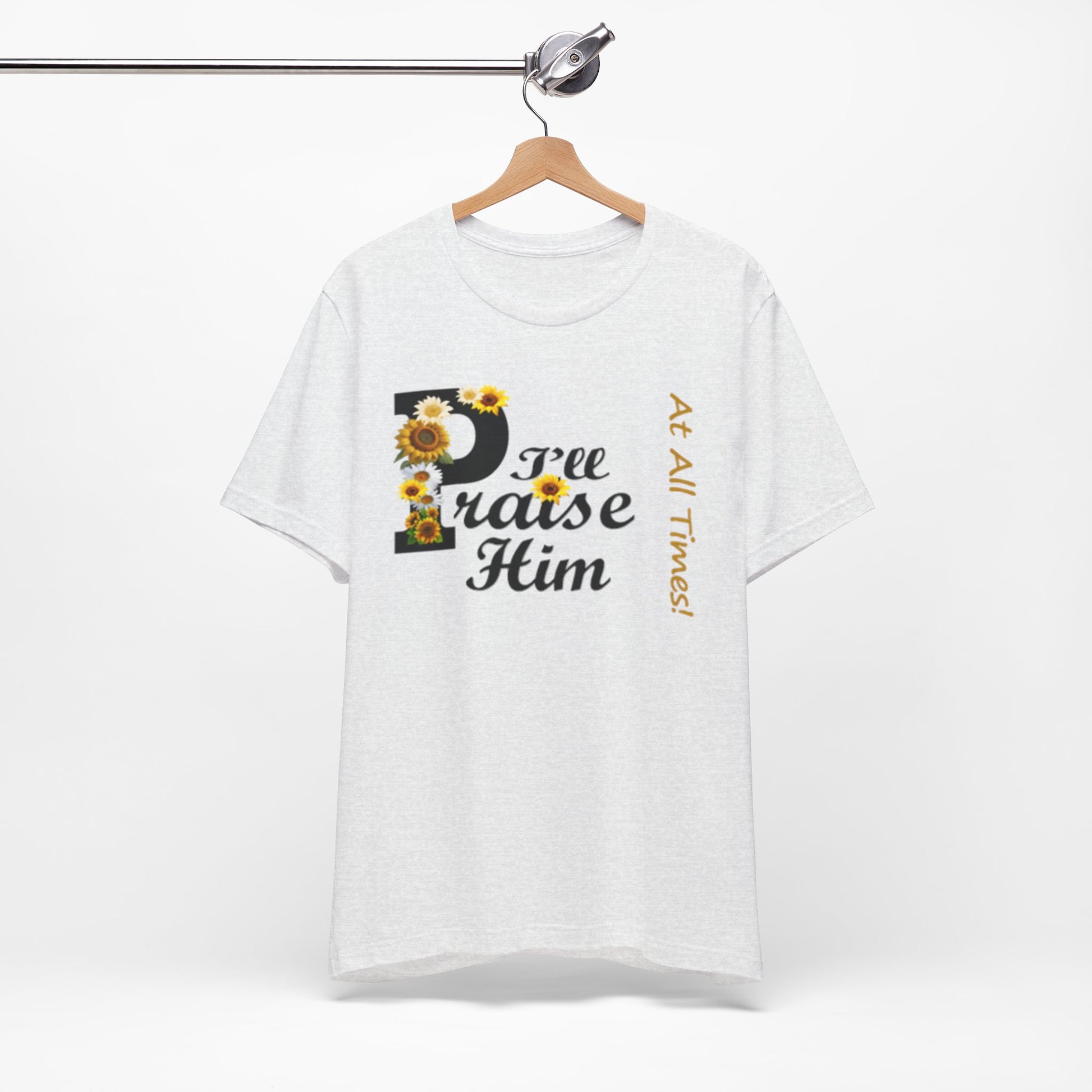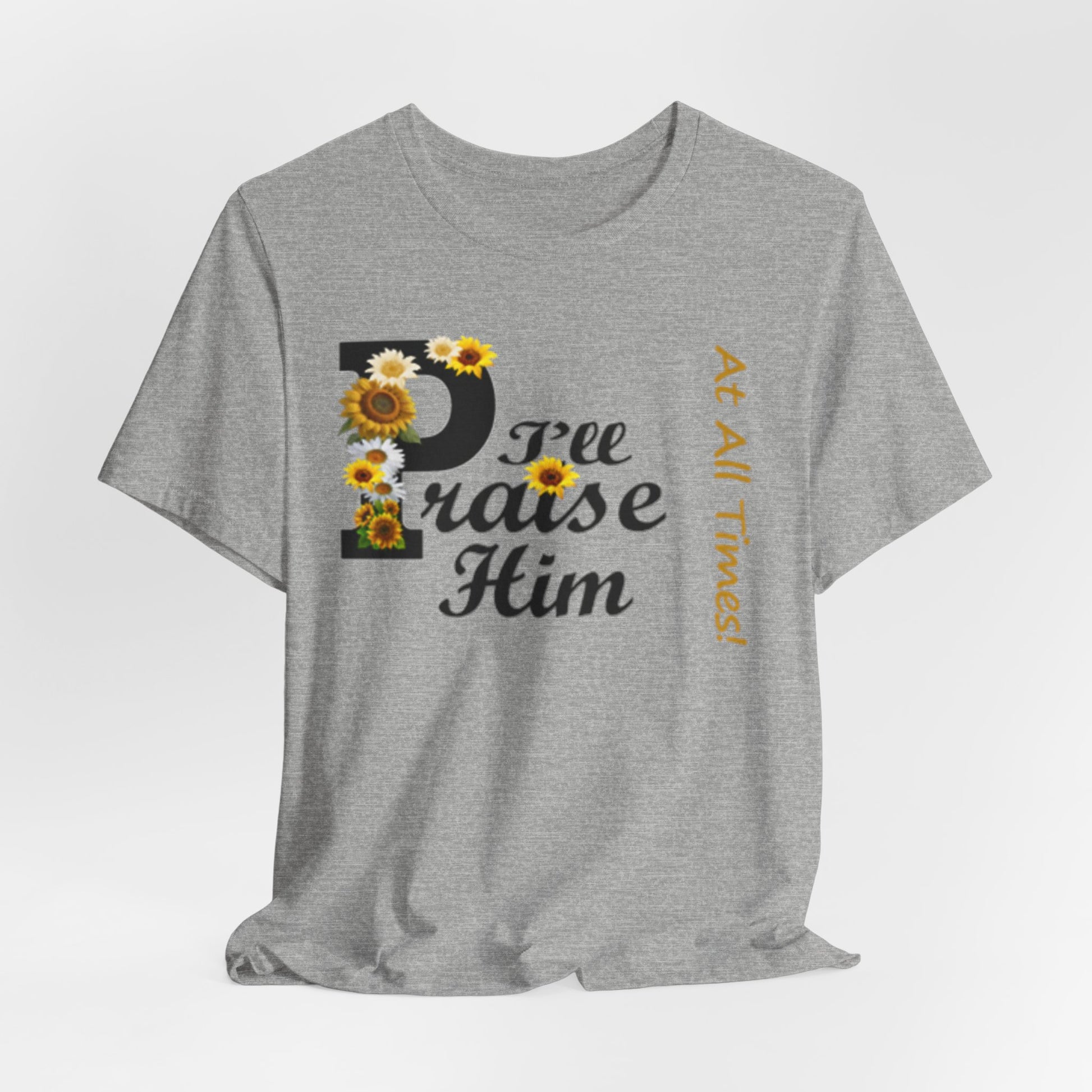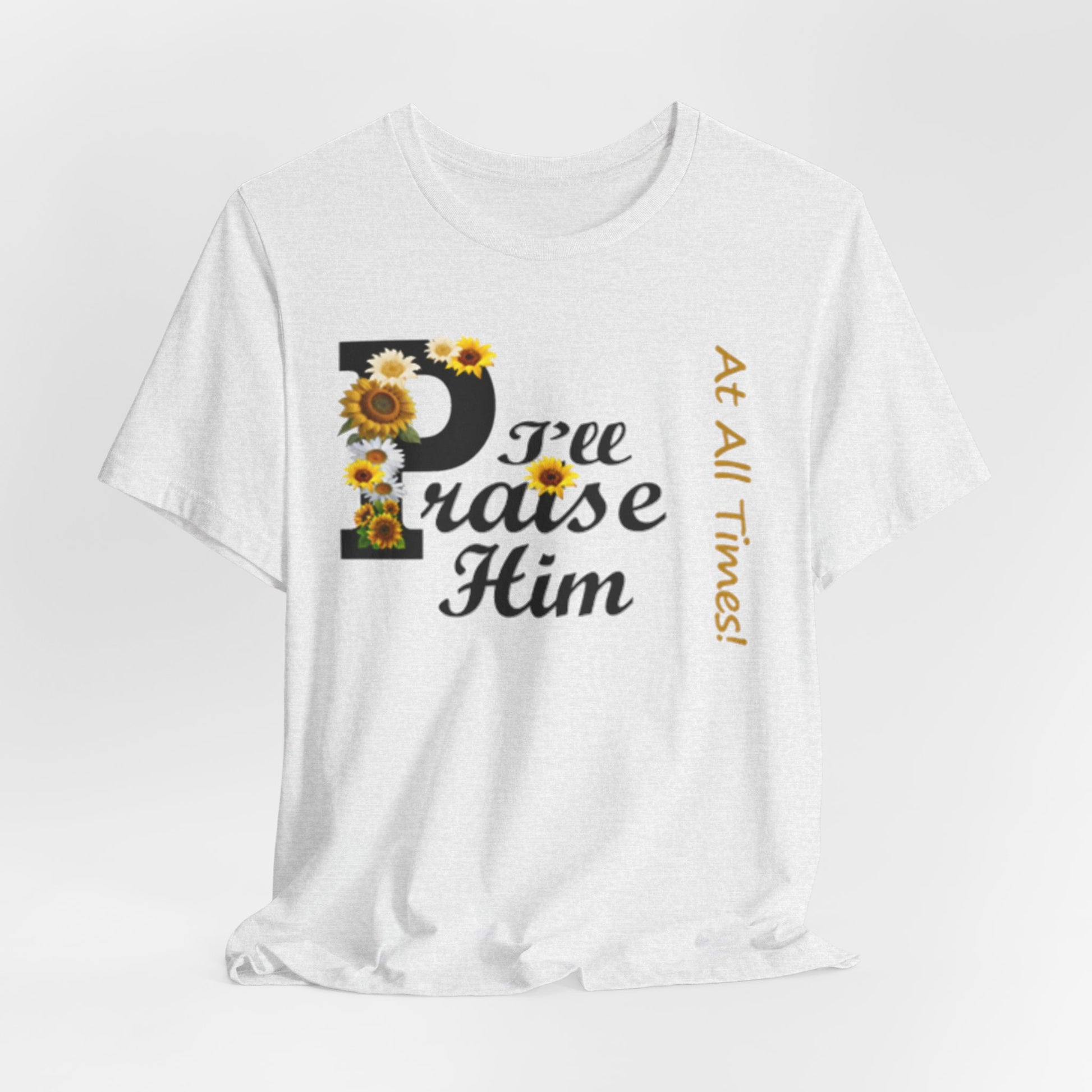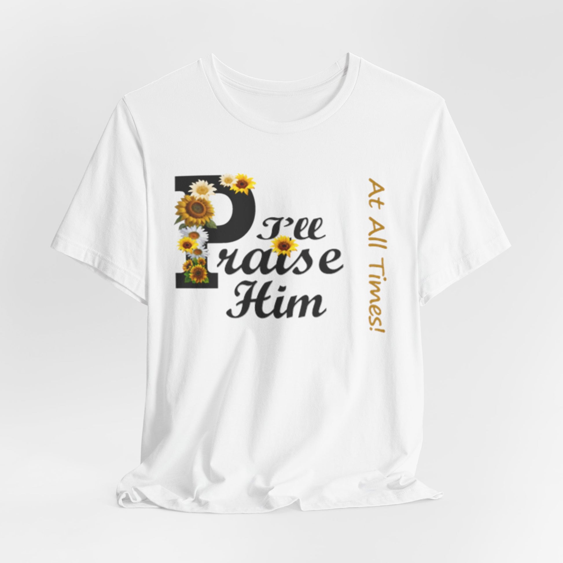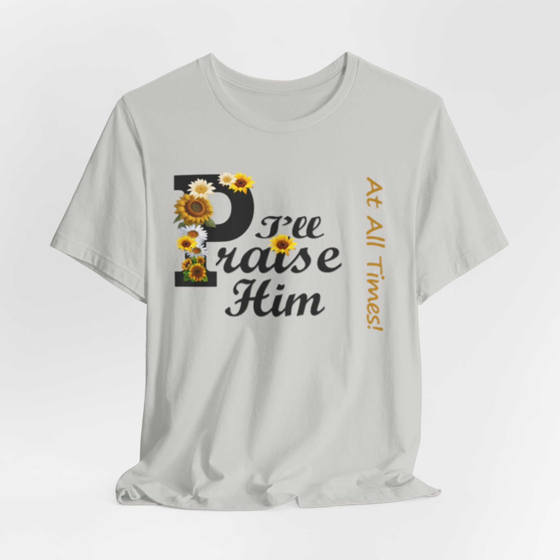 Light, soft, and quietly joyful — this tee carries a gentle message of faith with a touch of sunny charm. A large, floral-accented “P” leads into sweeping script that reads “raise Him,” while a slim vertical line of text beside it whispers “At All Times.” Wear it to feel rooted and calm: the breathable cotton keeps you comfortable during morning coffee, community gatherings, or a peaceful afternoon on the porch. The design sits centered but unobtrusive, letting the sentiment speak without shouting. It’s the sort of shirt you reach for on reflective days, when you want your outfit to reflect what matters without getting in the way.