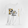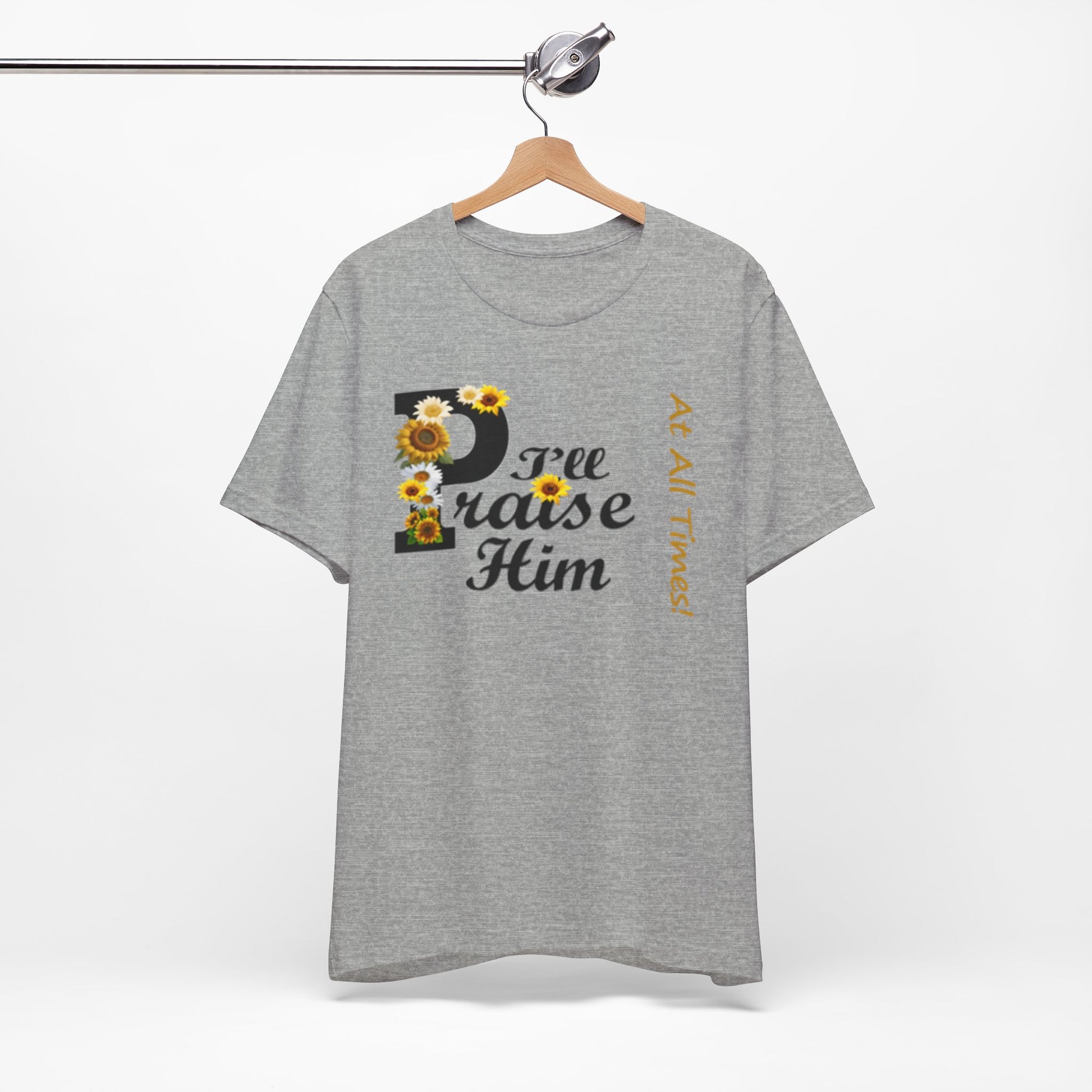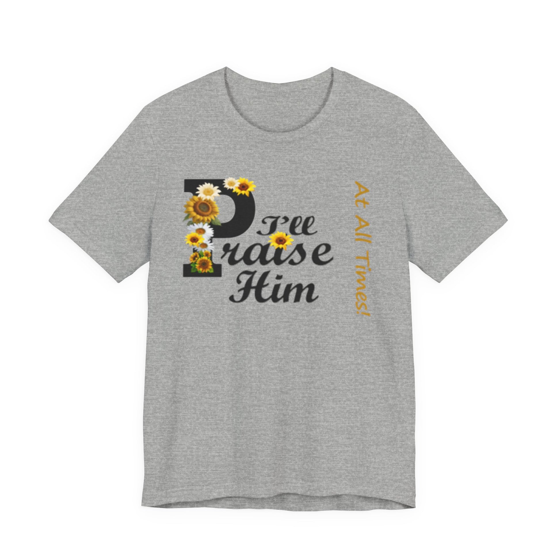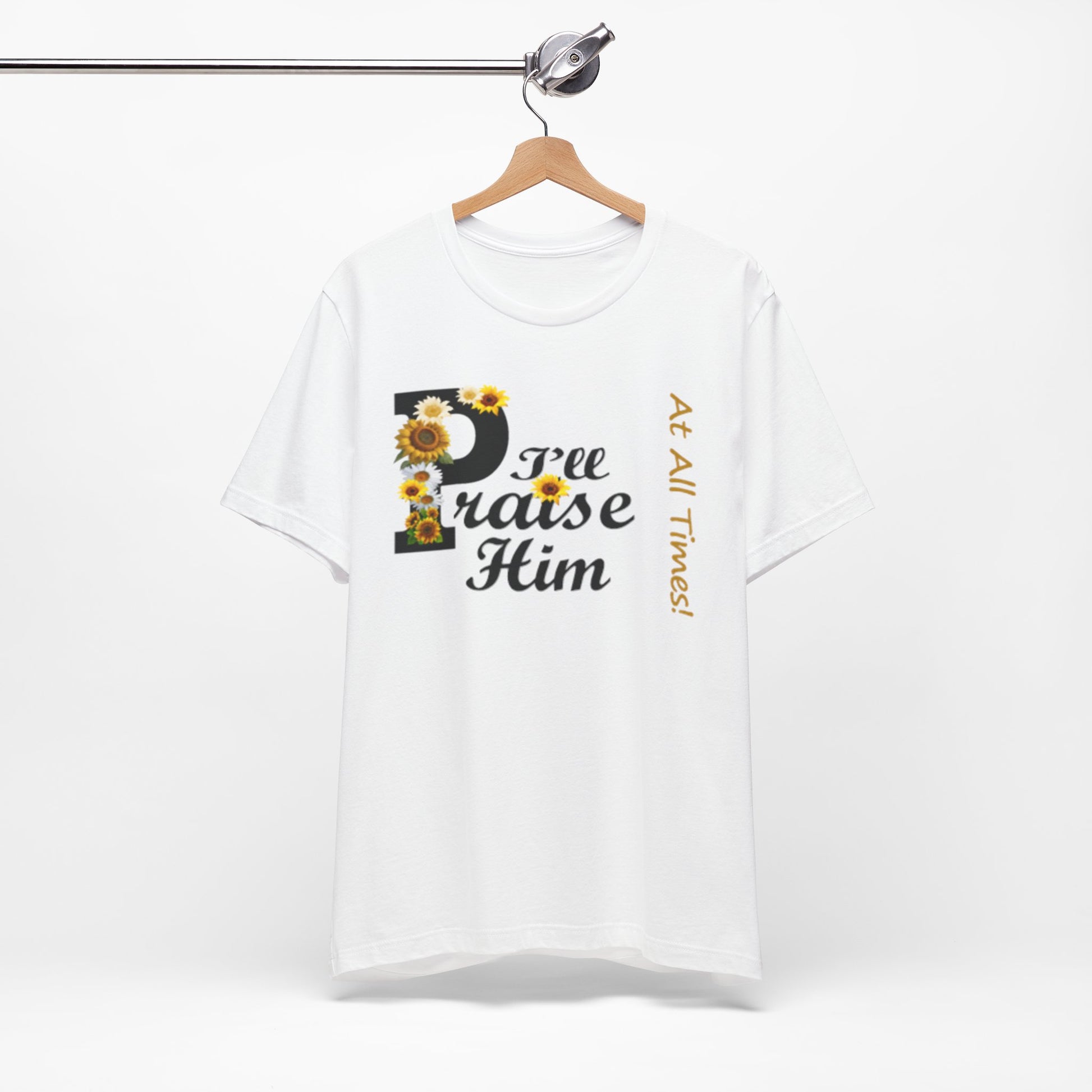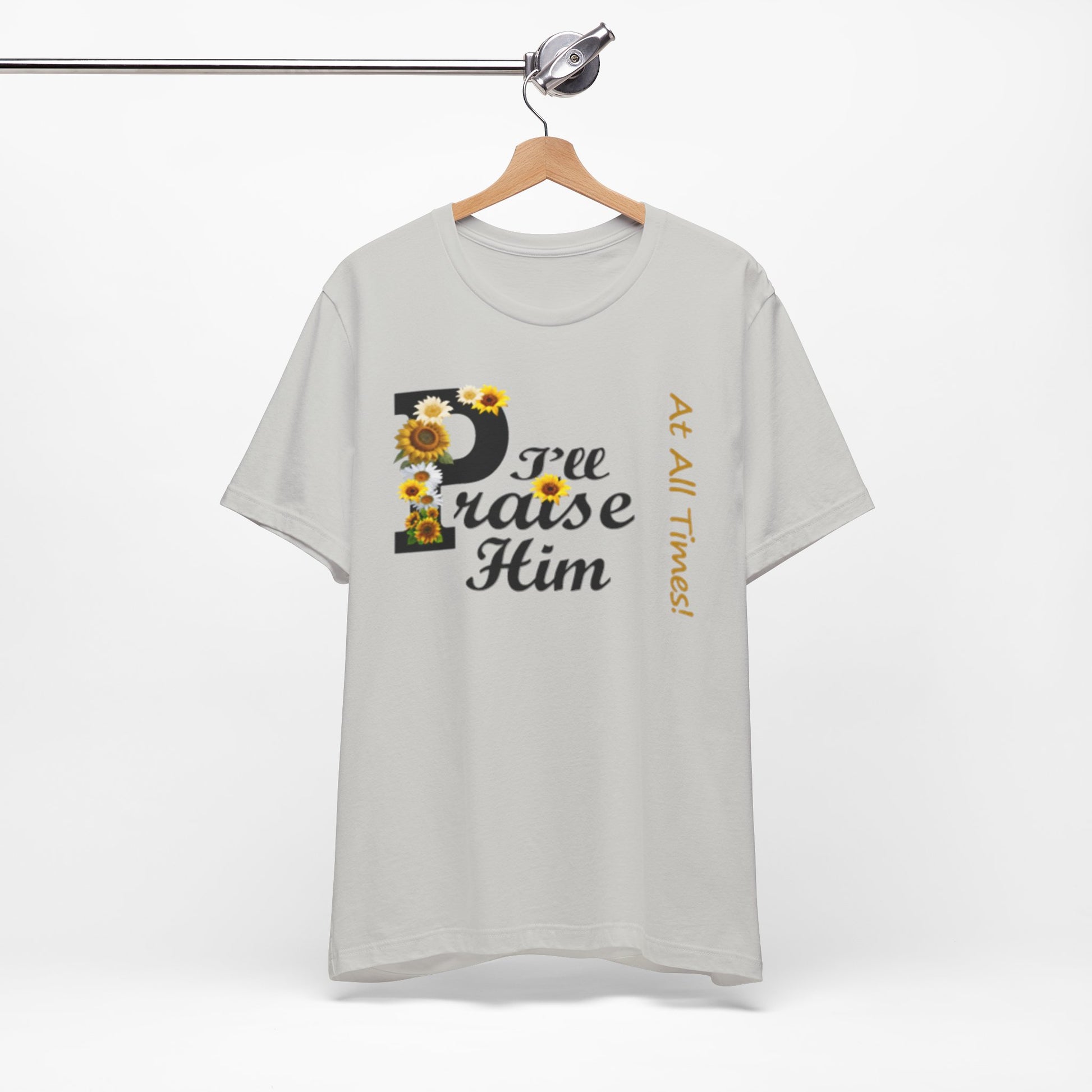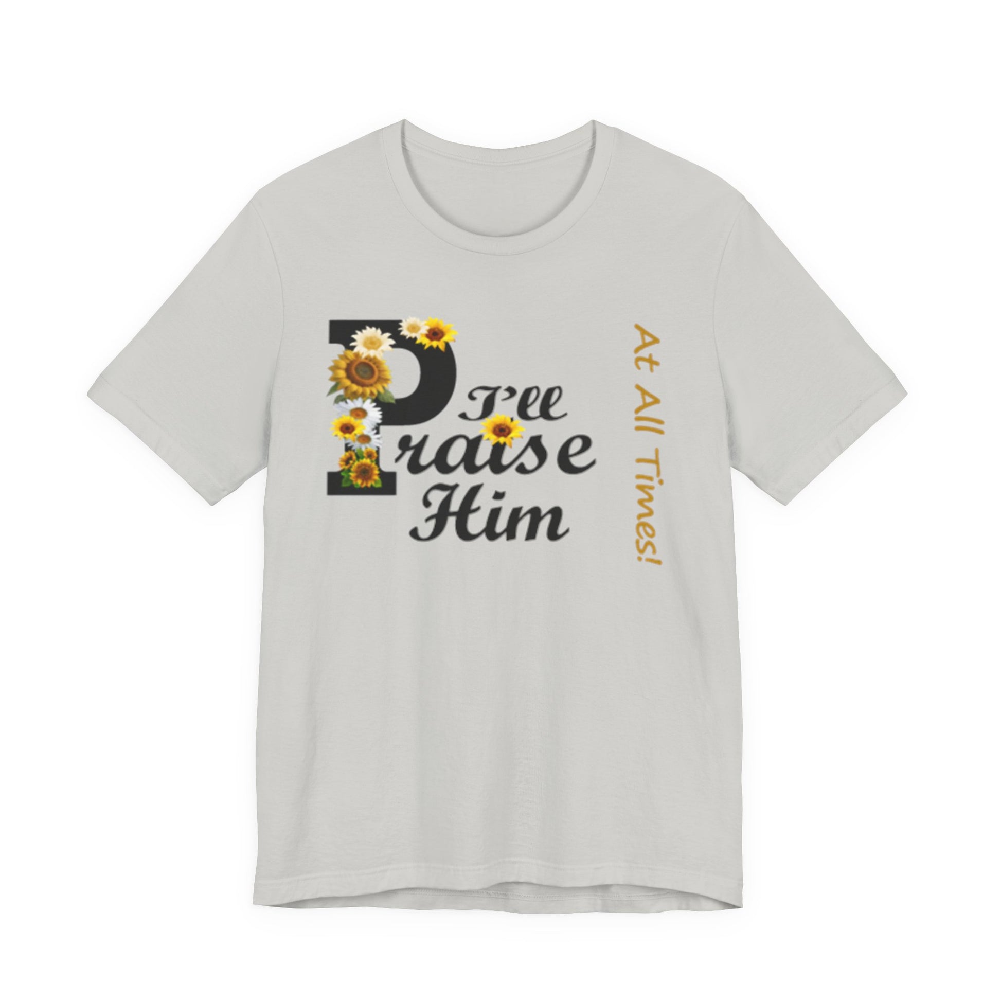Light, soft, and quietly joyful — this tee carries a gentle message of faith with a touch of sunny charm. A large, floral-accented “P” leads into sweeping script that reads “raise Him,” while a slim vertical line of text beside it whispers “At All Times.” Wear it to feel rooted and calm: the breathable cotton keeps you comfortable during morning coffee, community gatherings, or a peaceful afternoon on the porch. The design sits centered but unobtrusive, letting the sentiment speak without shouting. It’s the sort of shirt you reach for on reflective days, when you want your outfit to reflect what matters without getting in the way.