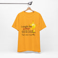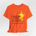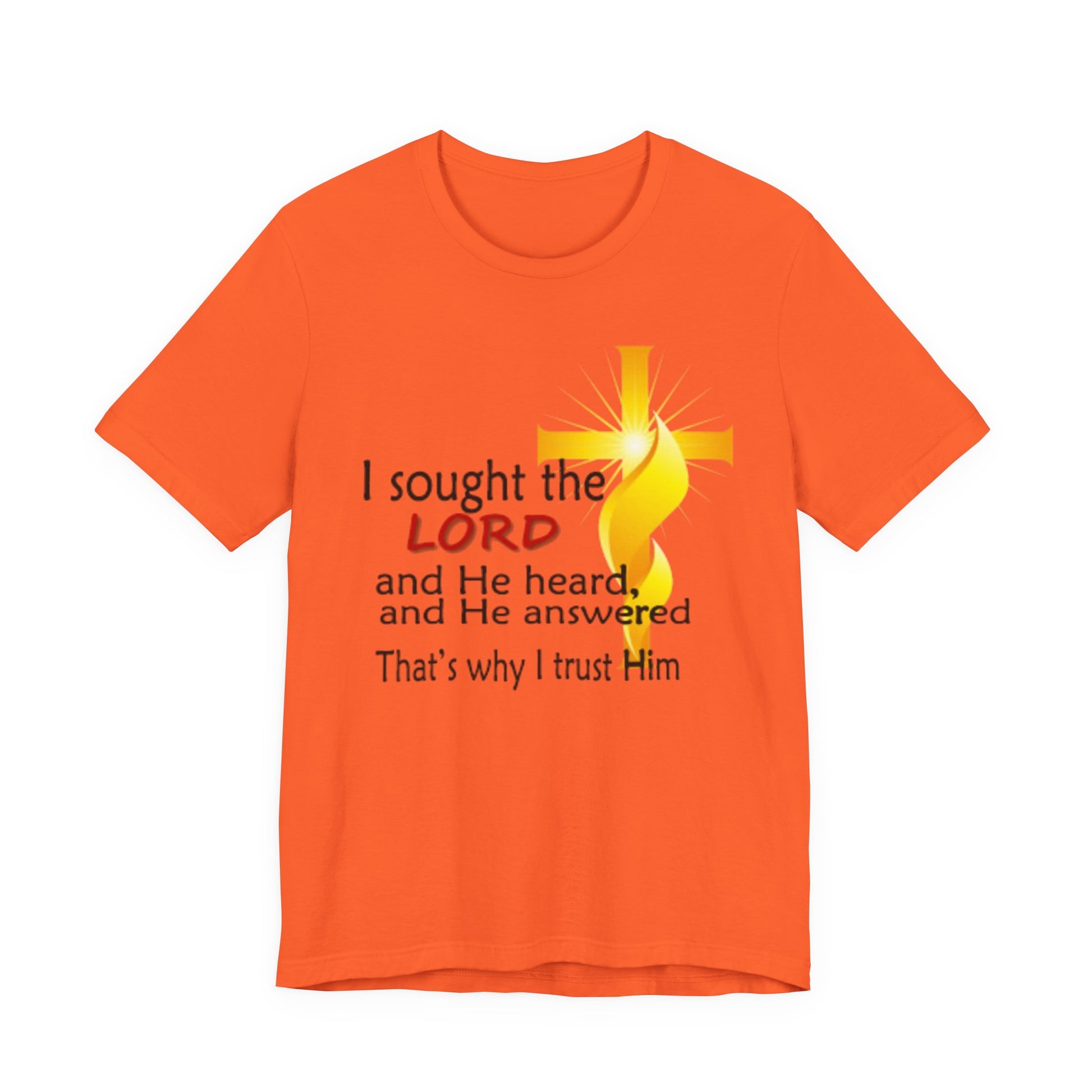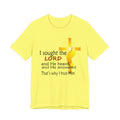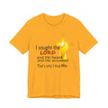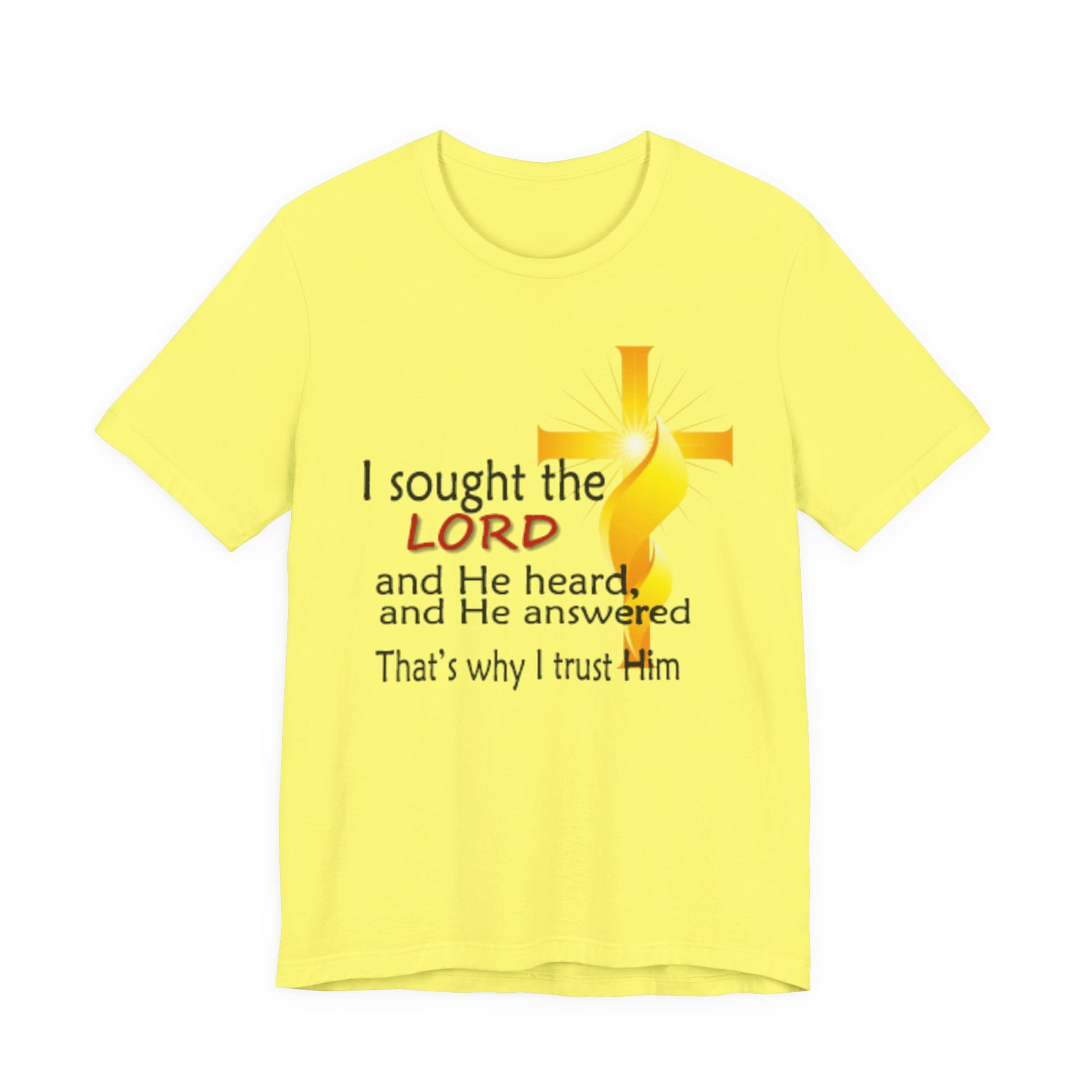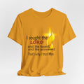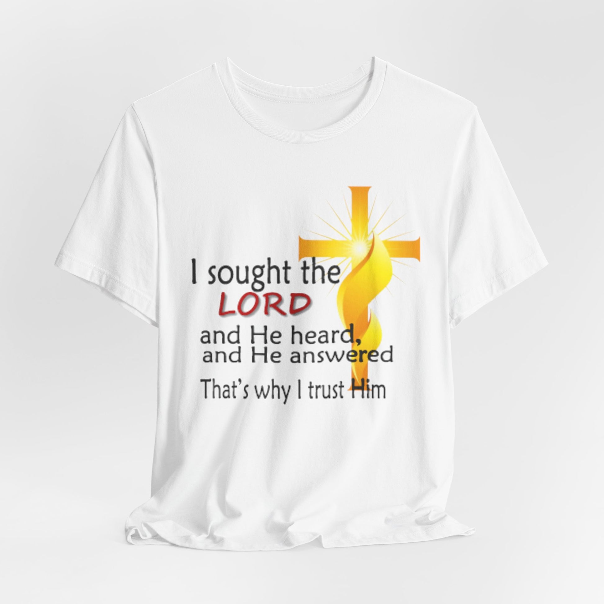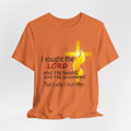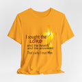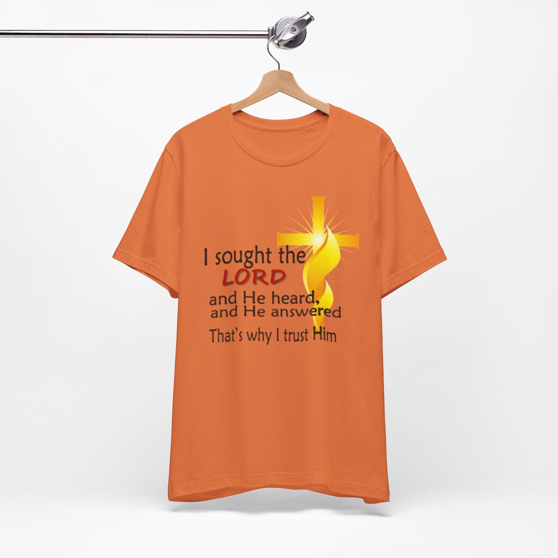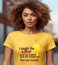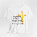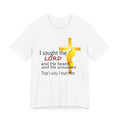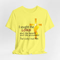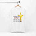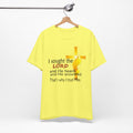Soft, breathable tee that carries a quiet, faithful message. The lightweight Airlume cotton feels gentle on skin, while the clean crew neckline and retail fit keep the look neat and easy to layer. A warm golden cross and subtle devotional text sit on the chest, creating a calm, hopeful focal point — something to reach for on weekday mornings, church gatherings, or slow evenings at home. The tear-away label and reinforced shoulder tape make it comfortable for everyday wear, and the side seams help the shirt hold its shape wash after wash.