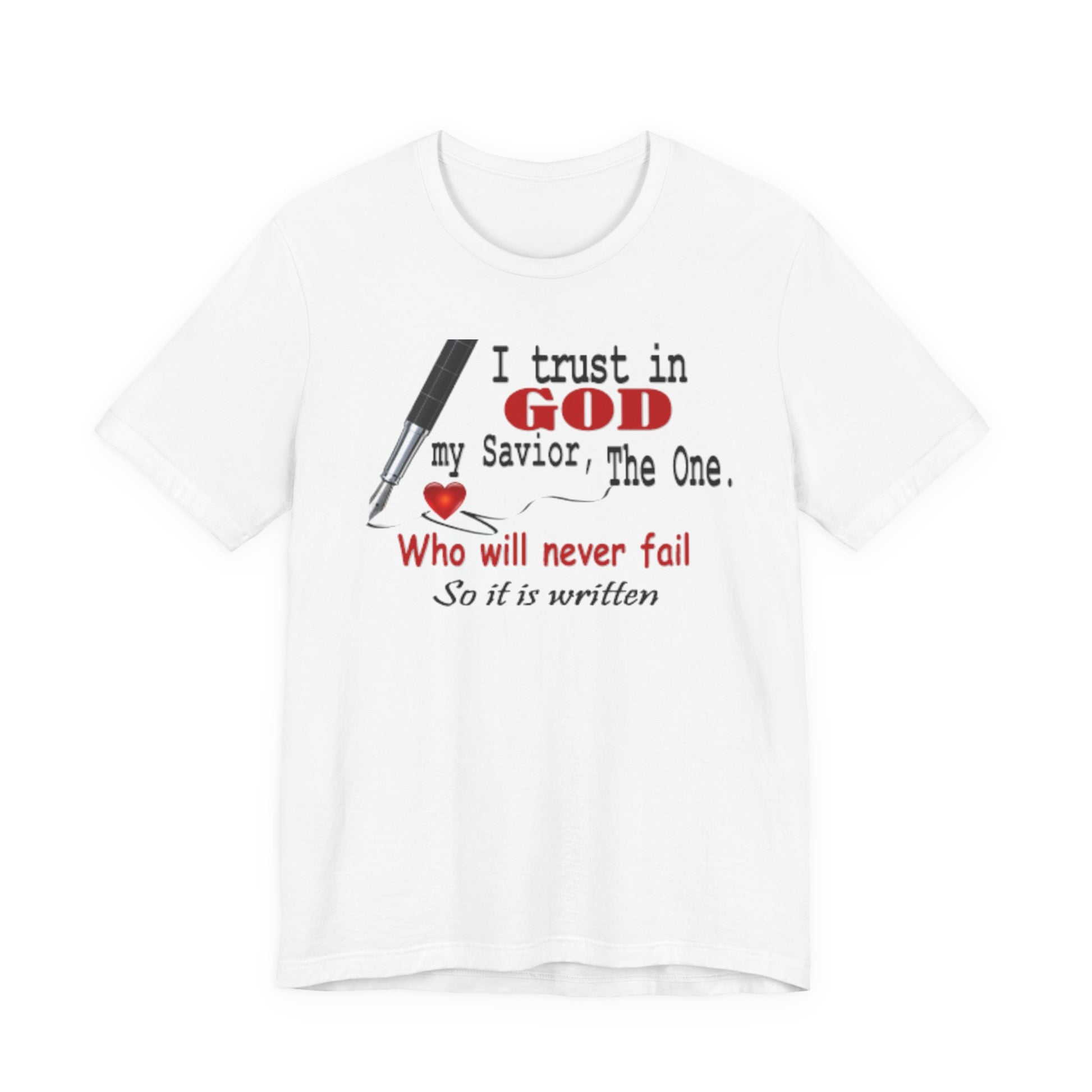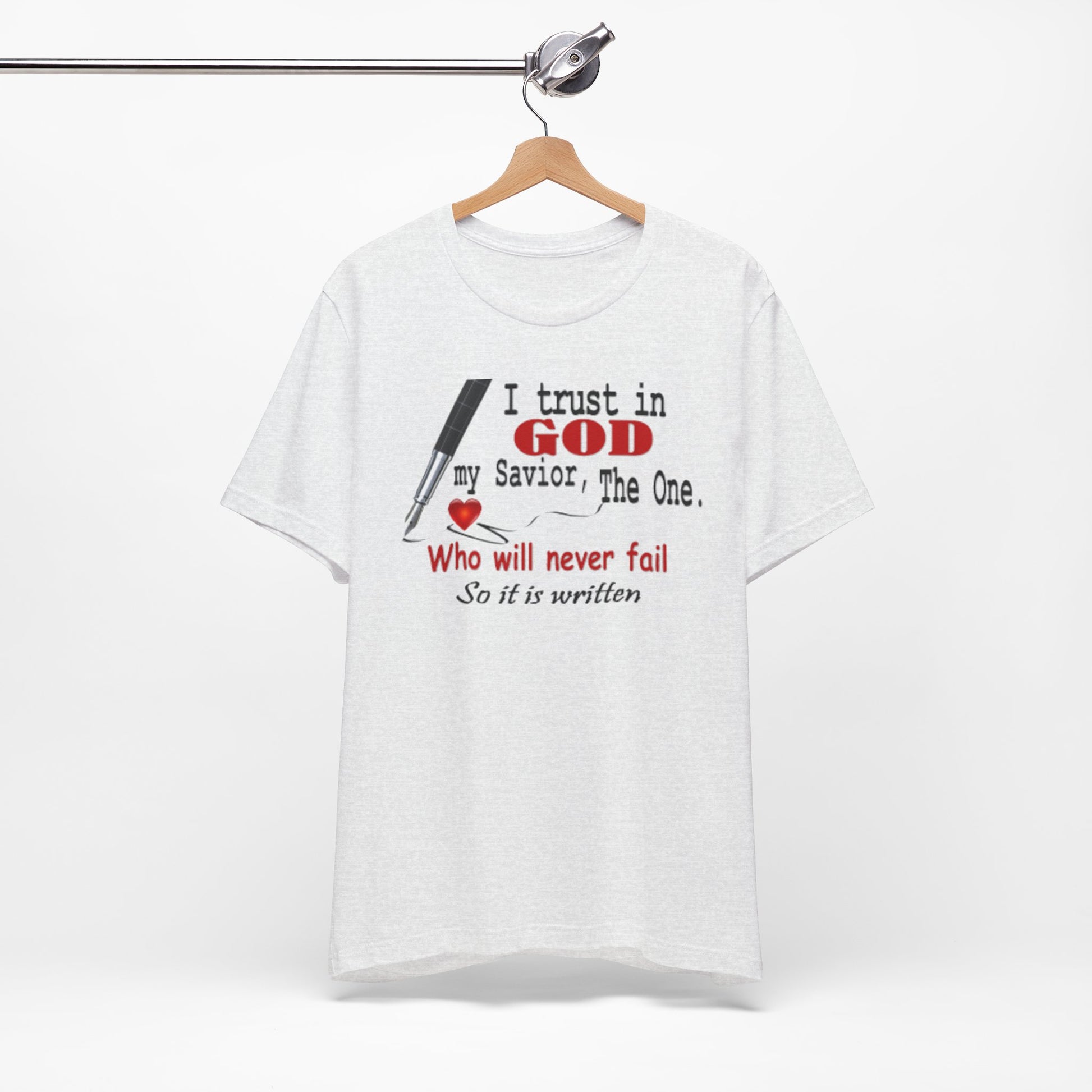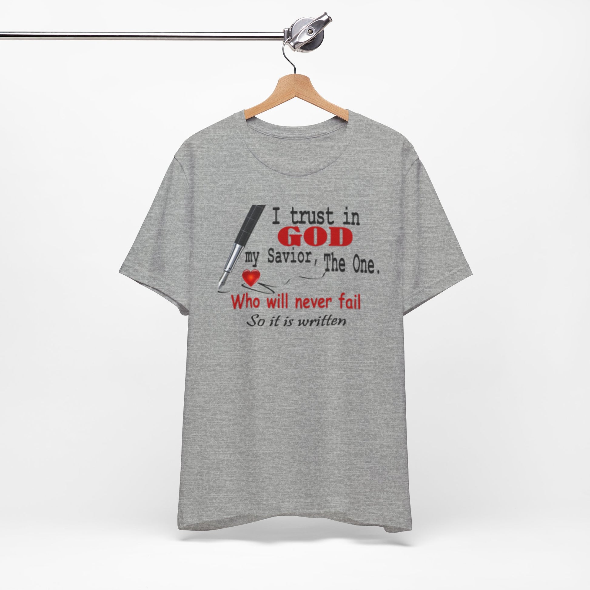 Soft, breathable tee that carries a quiet message of faith. The lightweight cotton feels gentle against skin while the ribbed crew collar and side seams keep the silhouette tidy through everyday wear. A simple typographic design — with a small pen and heart accent — sits on the chest, pairing modesty with a personal touch. Wear it to worship, volunteer shifts, or slow Sunday afternoons: it layers easily under a cardigan or stands on its own with jeans. The overall mood is humble and reassuring, for those who like their faith expressed with calm confidence rather than loud proclamation.