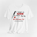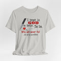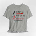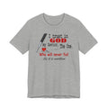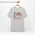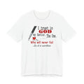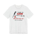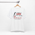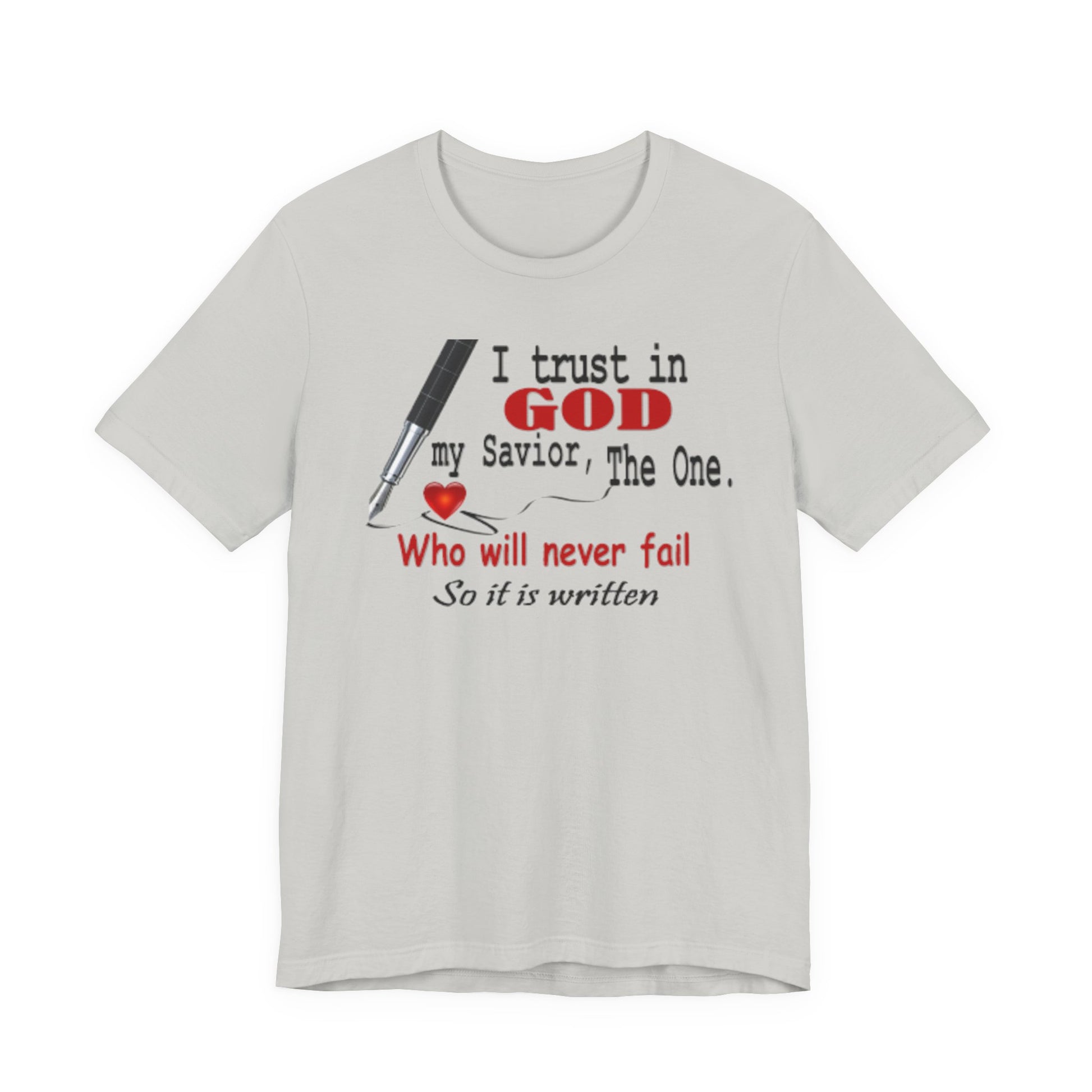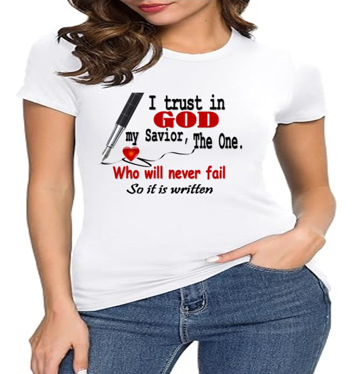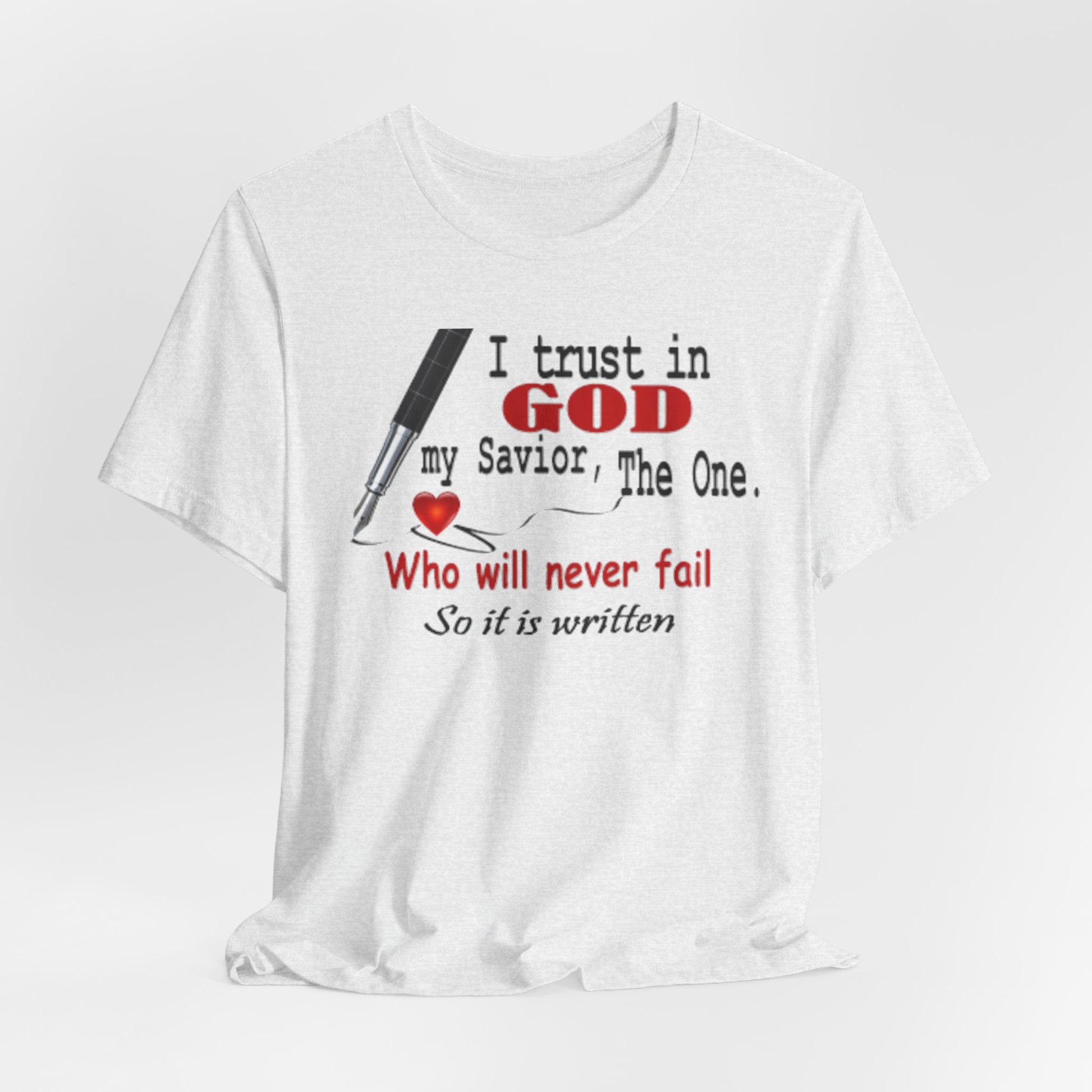 Soft, breathable tee that carries a quiet message of faith. The lightweight cotton feels gentle against skin while the ribbed crew collar and side seams keep the silhouette tidy through everyday wear. A simple typographic design — with a small pen and heart accent — sits on the chest, pairing modesty with a personal touch. Wear it to worship, volunteer shifts, or slow Sunday afternoons: it layers easily under a cardigan or stands on its own with jeans. The overall mood is humble and reassuring, for those who like their faith expressed with calm confidence rather than loud proclamation.
