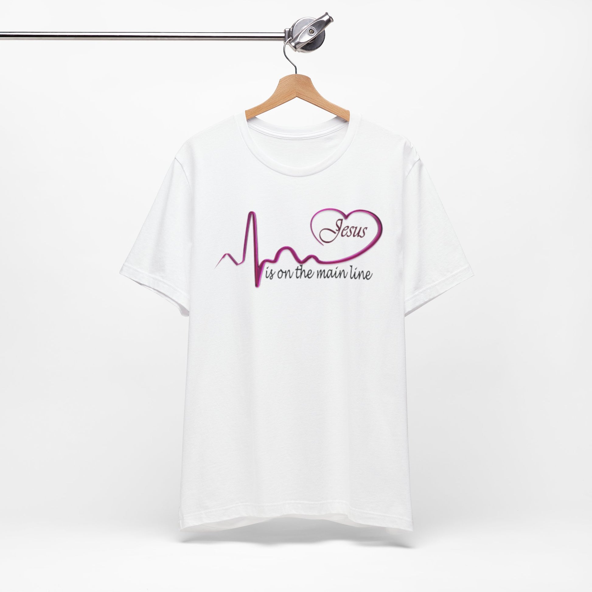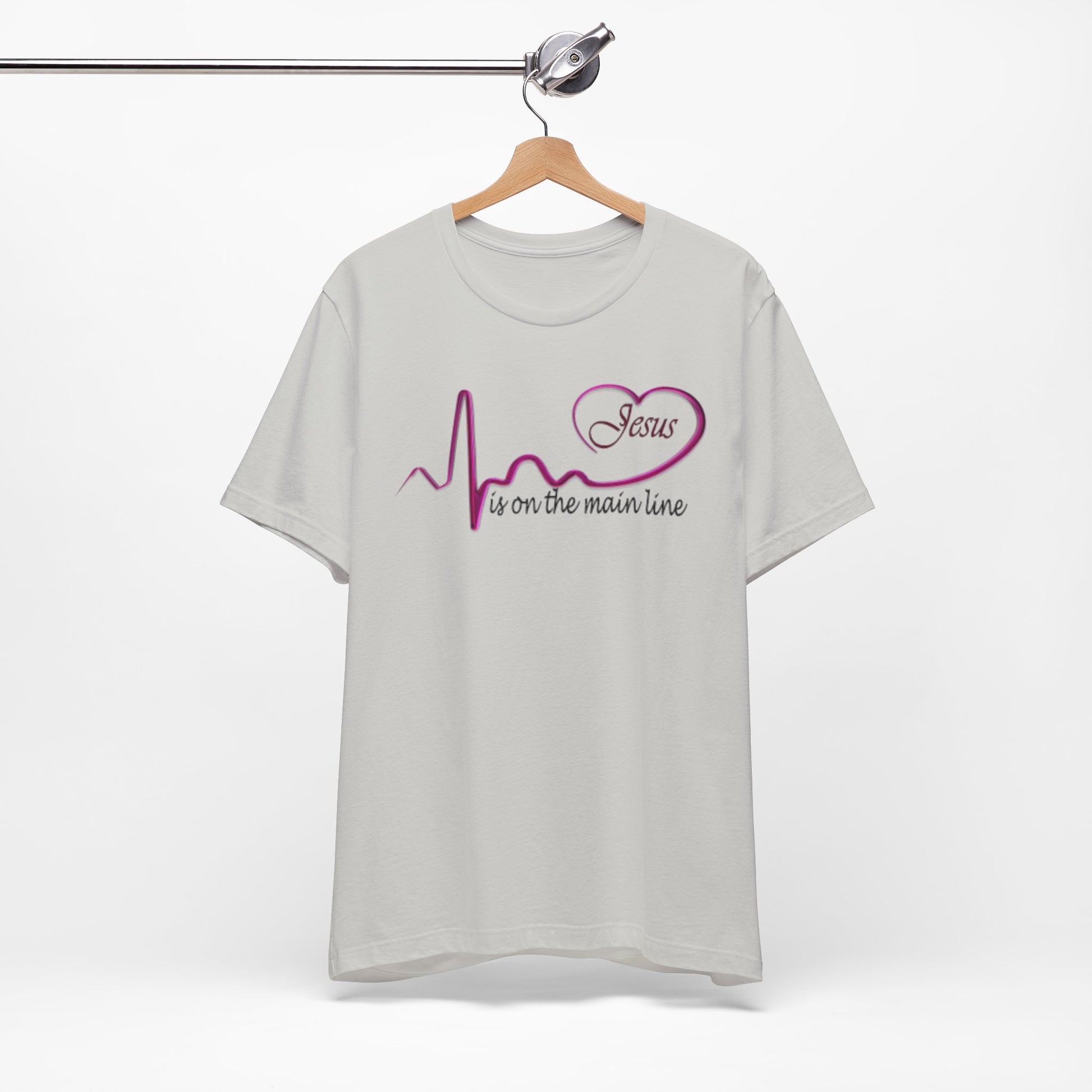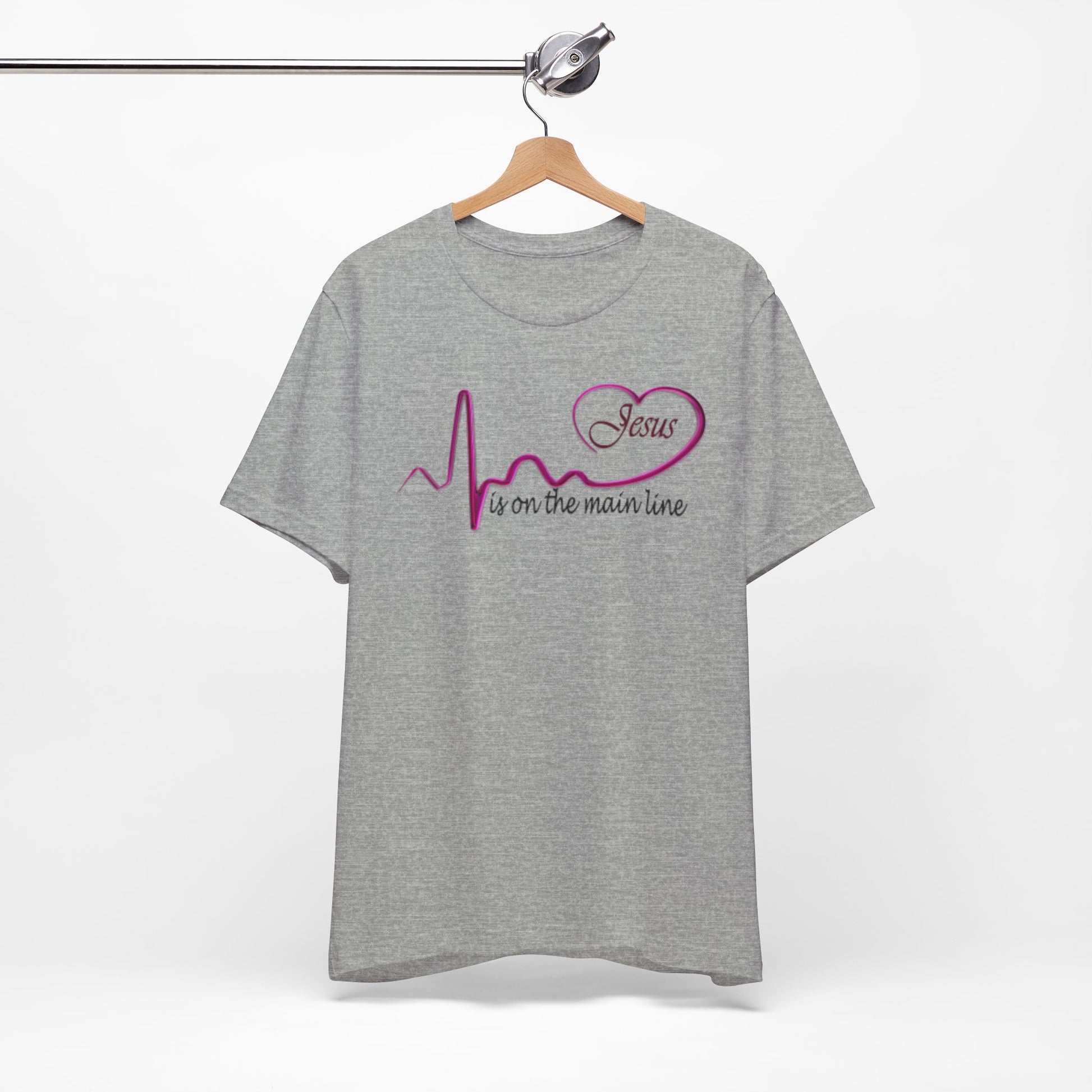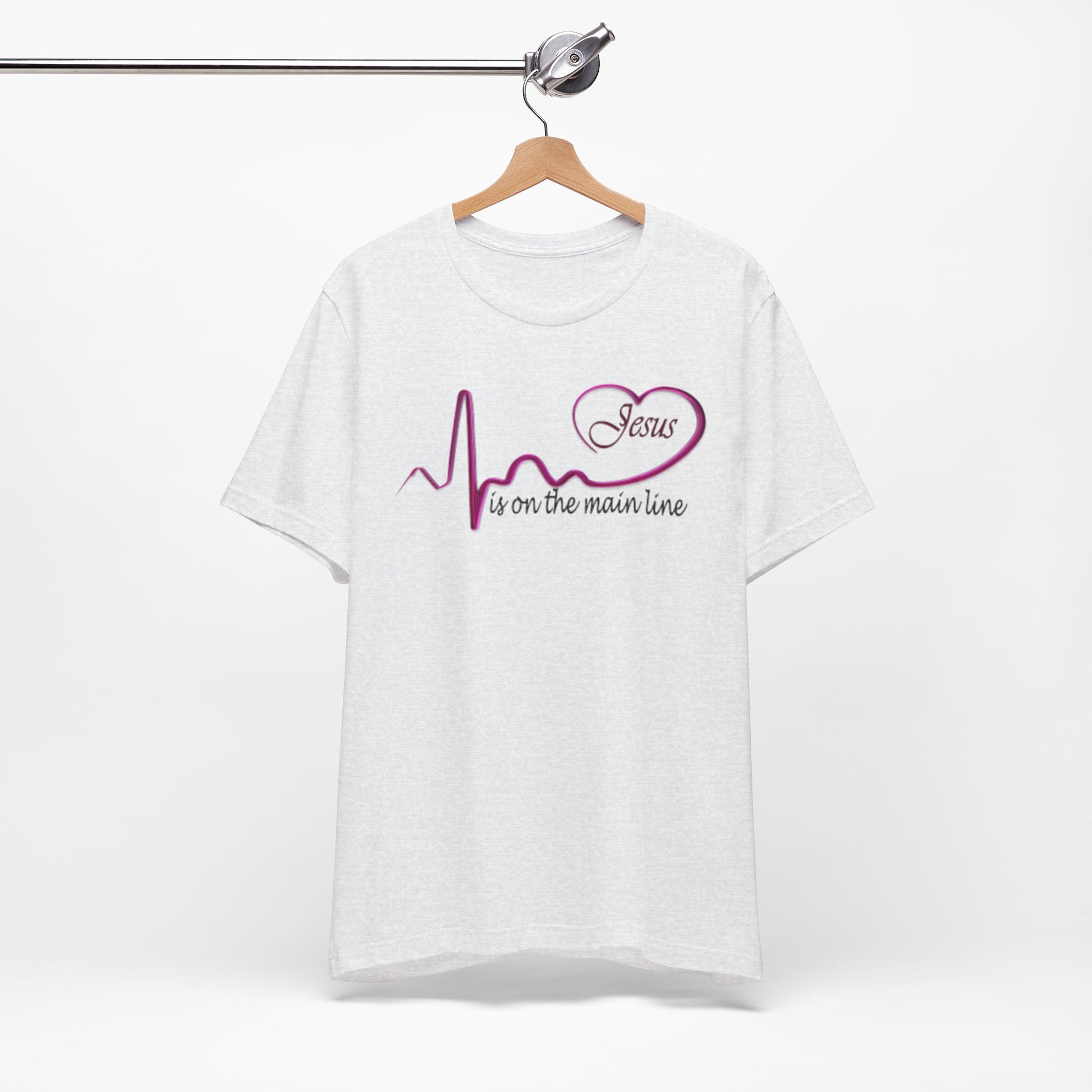 This lightweight crew-neck tee carries a quiet, heartfelt message: a heartbeat line that flows into a heart-shaped script reading "Jesus," with the phrase "is on the main line" beneath. Breathable Airlume combed and ring-spun cotton keeps the shirt soft against skin and easy to layer. The slim retail fit and ribbed collar give a tidy silhouette that works for church gatherings, volunteer days, or everyday wear. Thoughtful construction—side seams, shoulder tape, and a tear-away label—keeps the shirt comfortable and long-lasting. The design reads like a personal reminder of faith, gentle and contemporary rather than flashy.