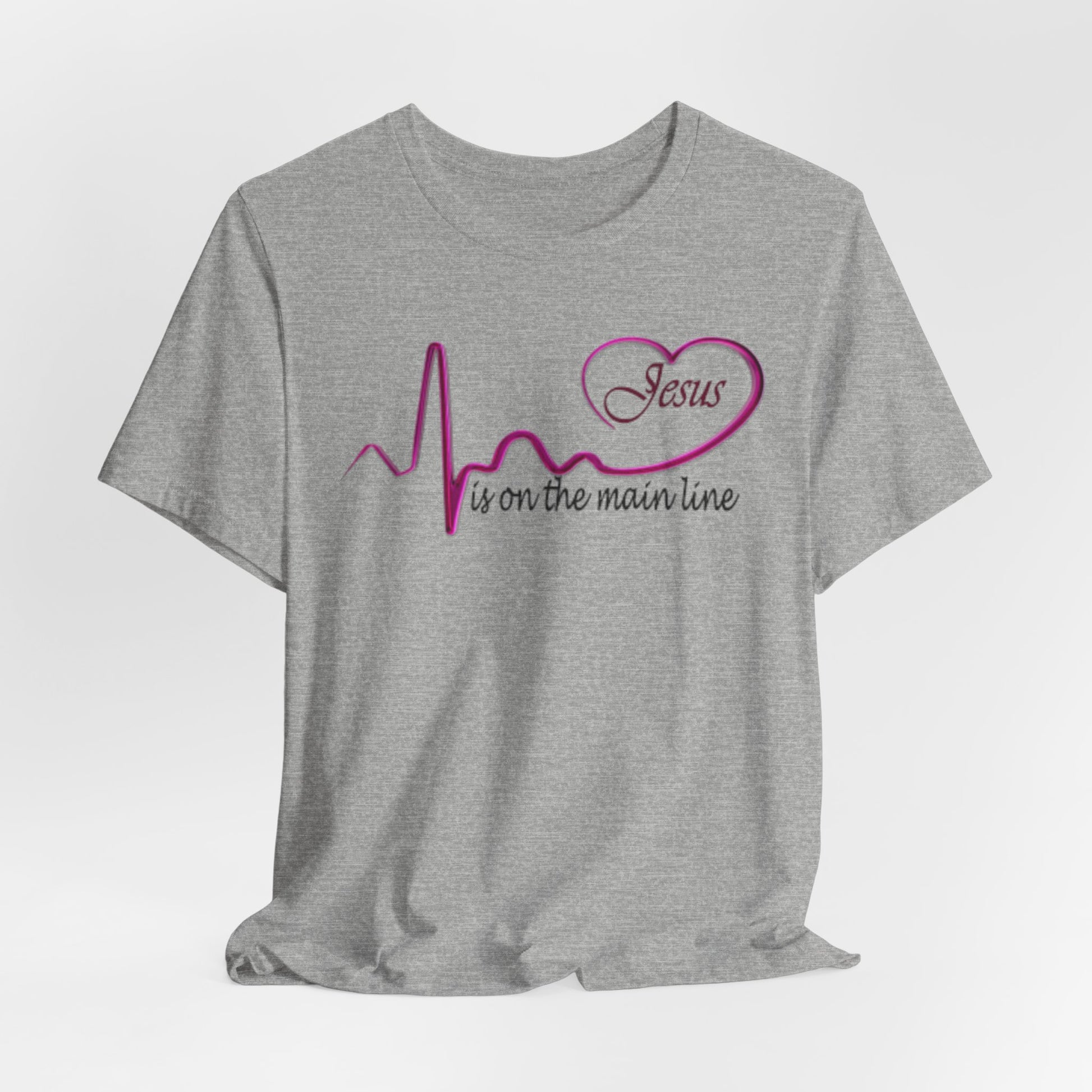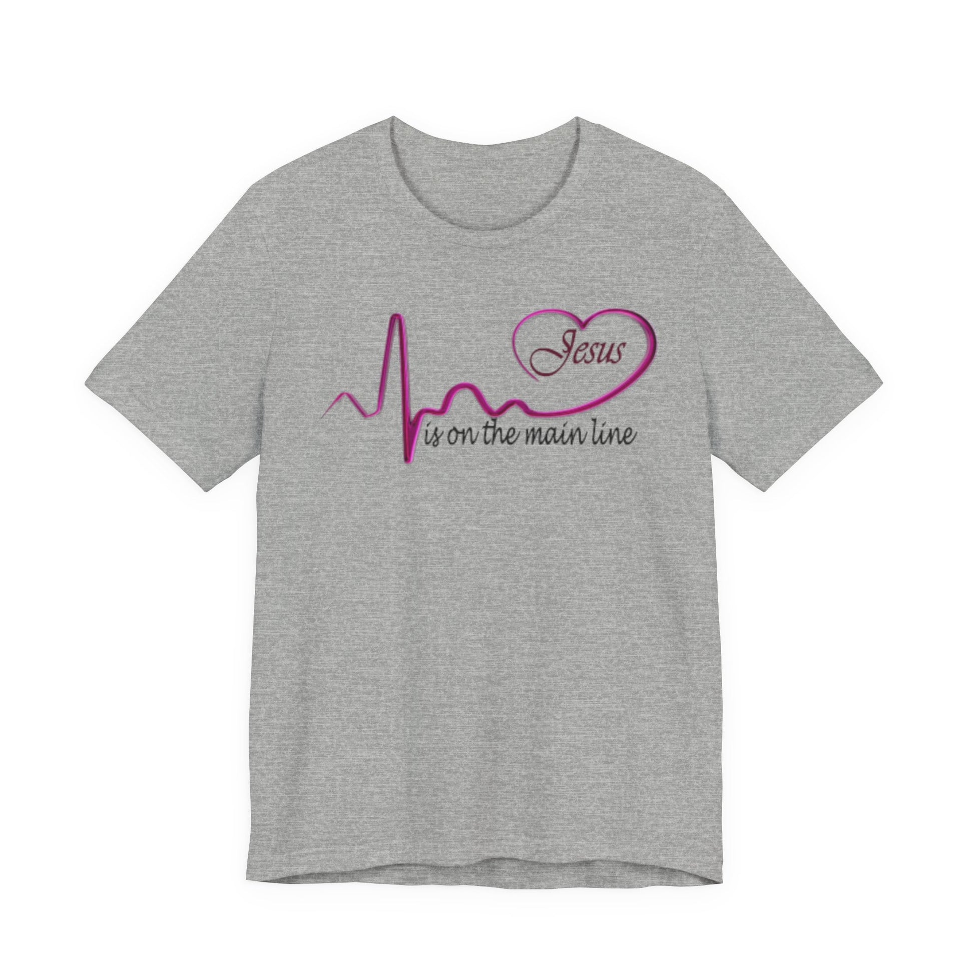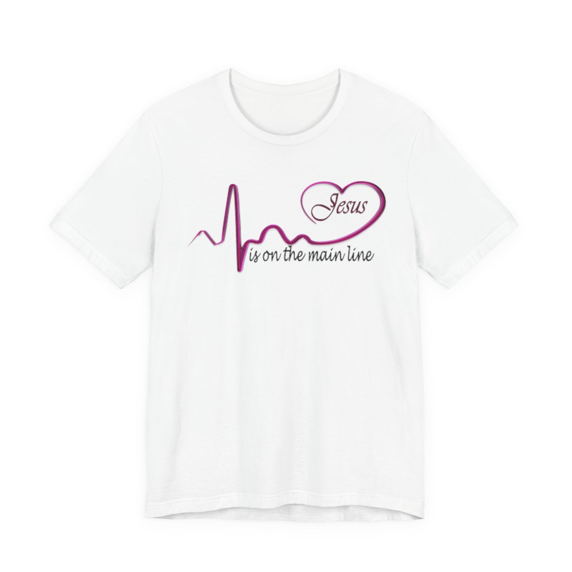 This lightweight crew-neck tee carries a quiet, heartfelt message: a heartbeat line that flows into a heart-shaped script reading "Jesus," with the phrase "is on the main line" beneath. Breathable Airlume combed and ring-spun cotton keeps the shirt soft against skin and easy to layer. The slim retail fit and ribbed collar give a tidy silhouette that works for church gatherings, volunteer days, or everyday wear. Thoughtful construction—side seams, shoulder tape, and a tear-away label—keeps the shirt comfortable and long-lasting. The design reads like a personal reminder of faith, gentle and contemporary rather than flashy.