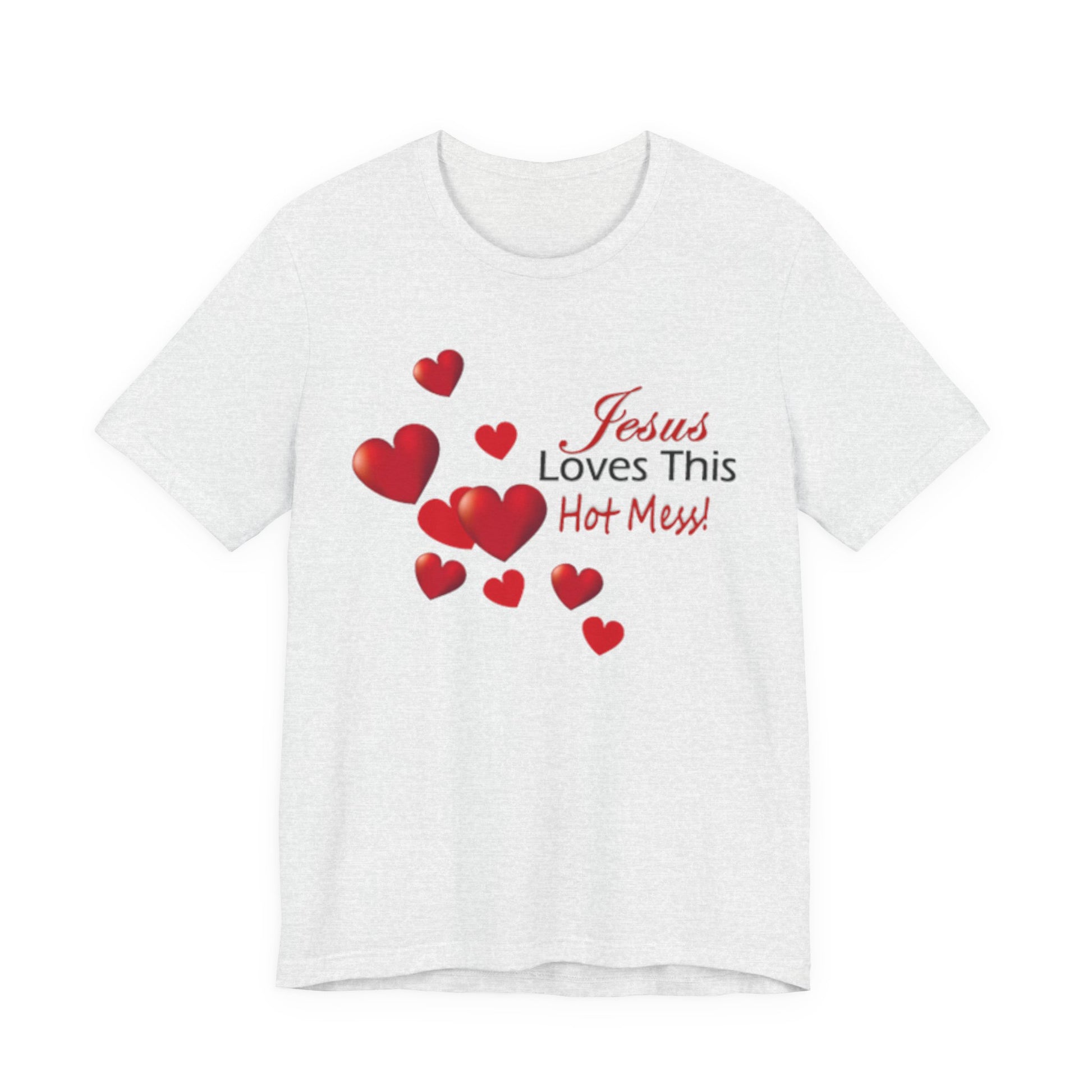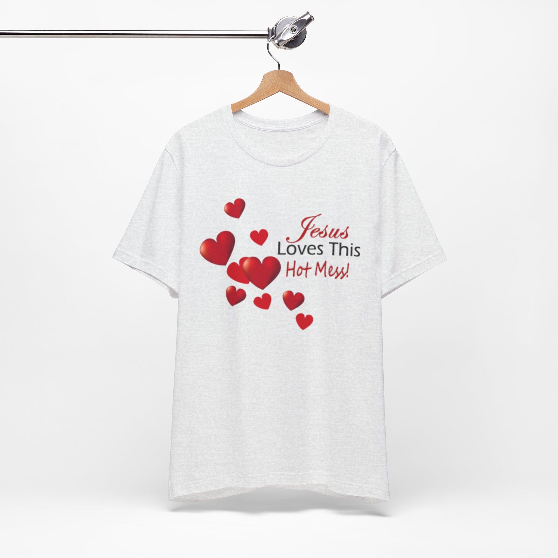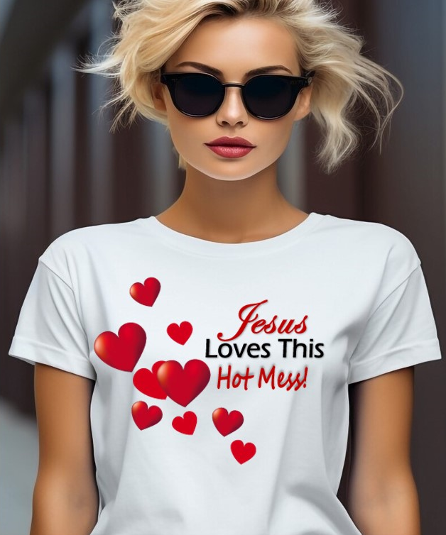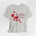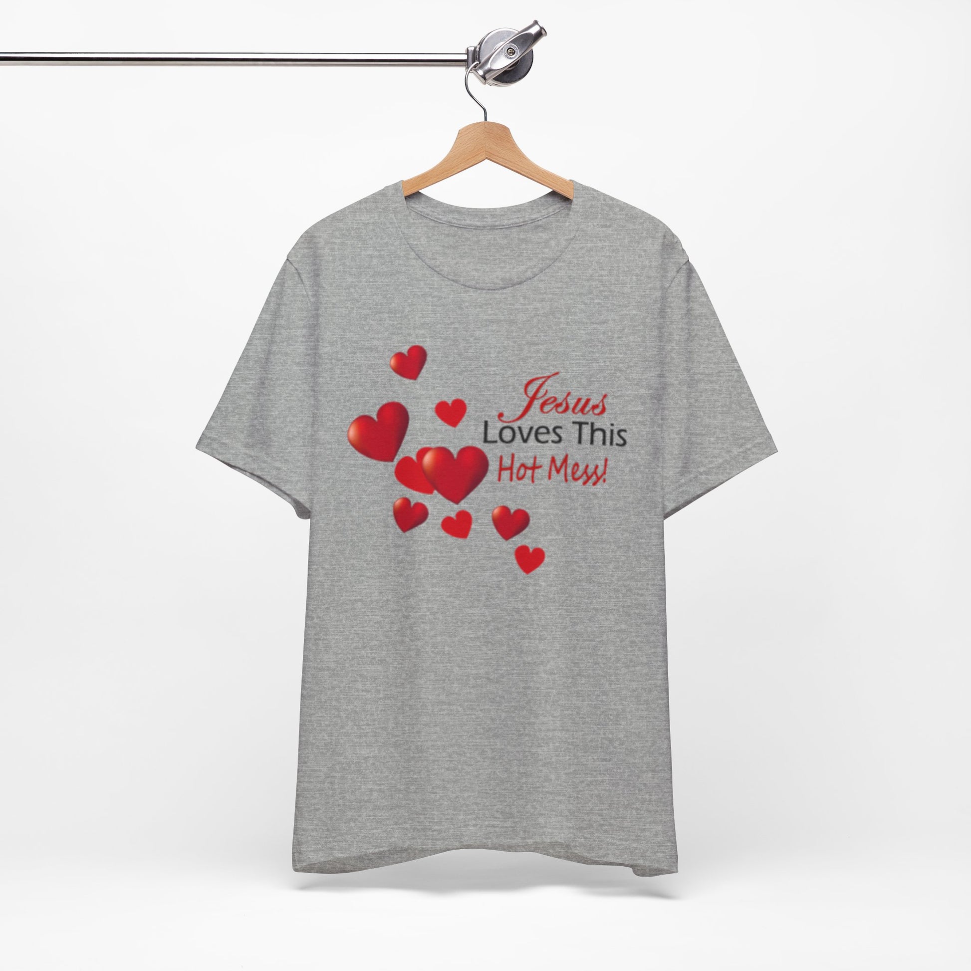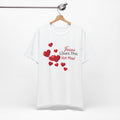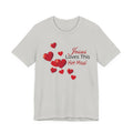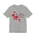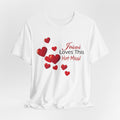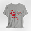 A soft, breathable jersey tee that blends faith-forward charm with everyday comfort. Lightweight Airlume combed and ring-spun cotton drapes easily and feels gentle against the skin, while side seams and shoulder tape help the shirt hold its shape through frequent wear. The front print features scattered red hearts and a warm, playful scripture-inspired message, creating a casual yet heartfelt look. Wear it layered under a denim jacket for Sunday gatherings, or solo for coffee runs, volunteer days, and relaxed evenings with friends. The crew neckline and retail fit keep the silhouette neat and versatile — a simple way to show faith with a lighthearted touch.
