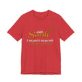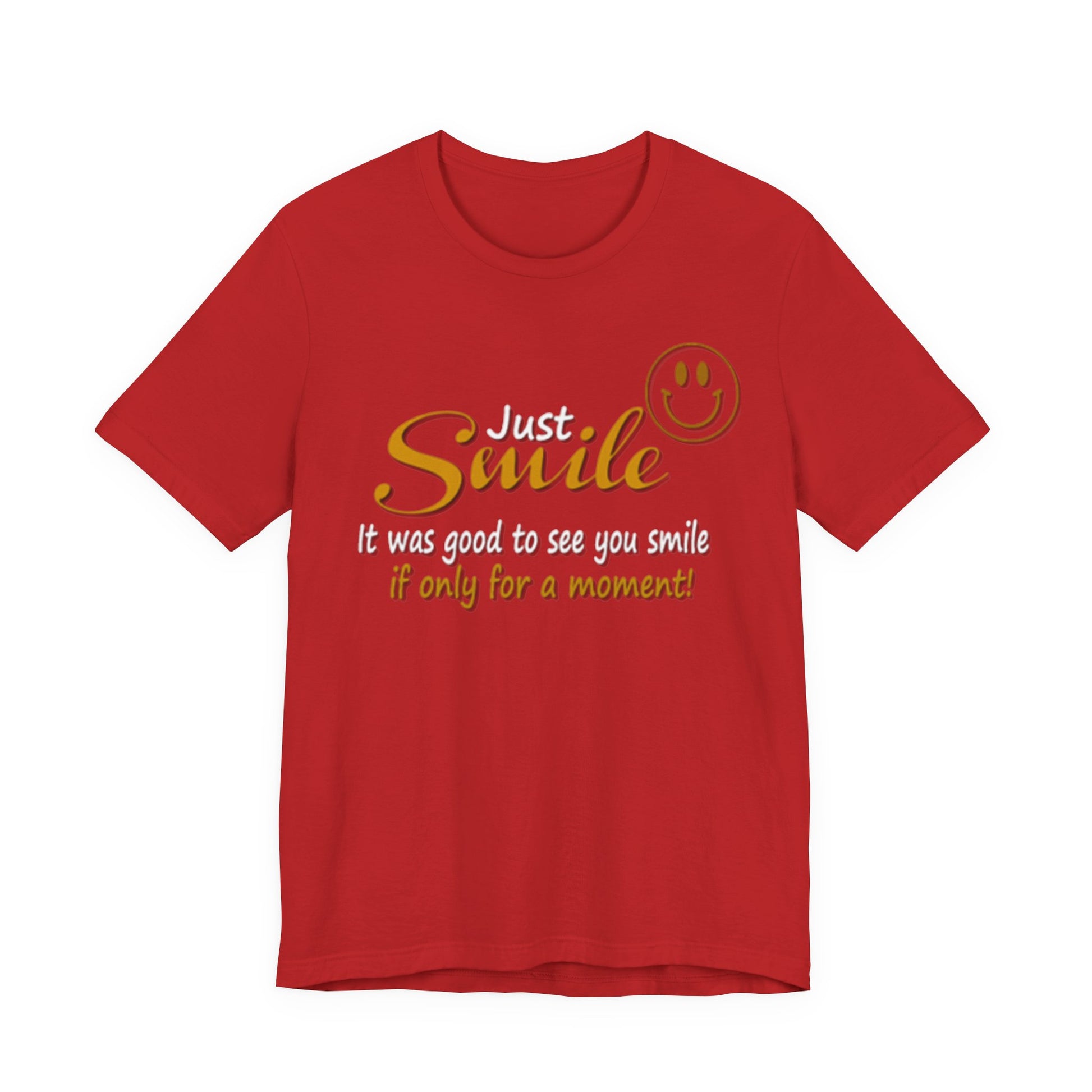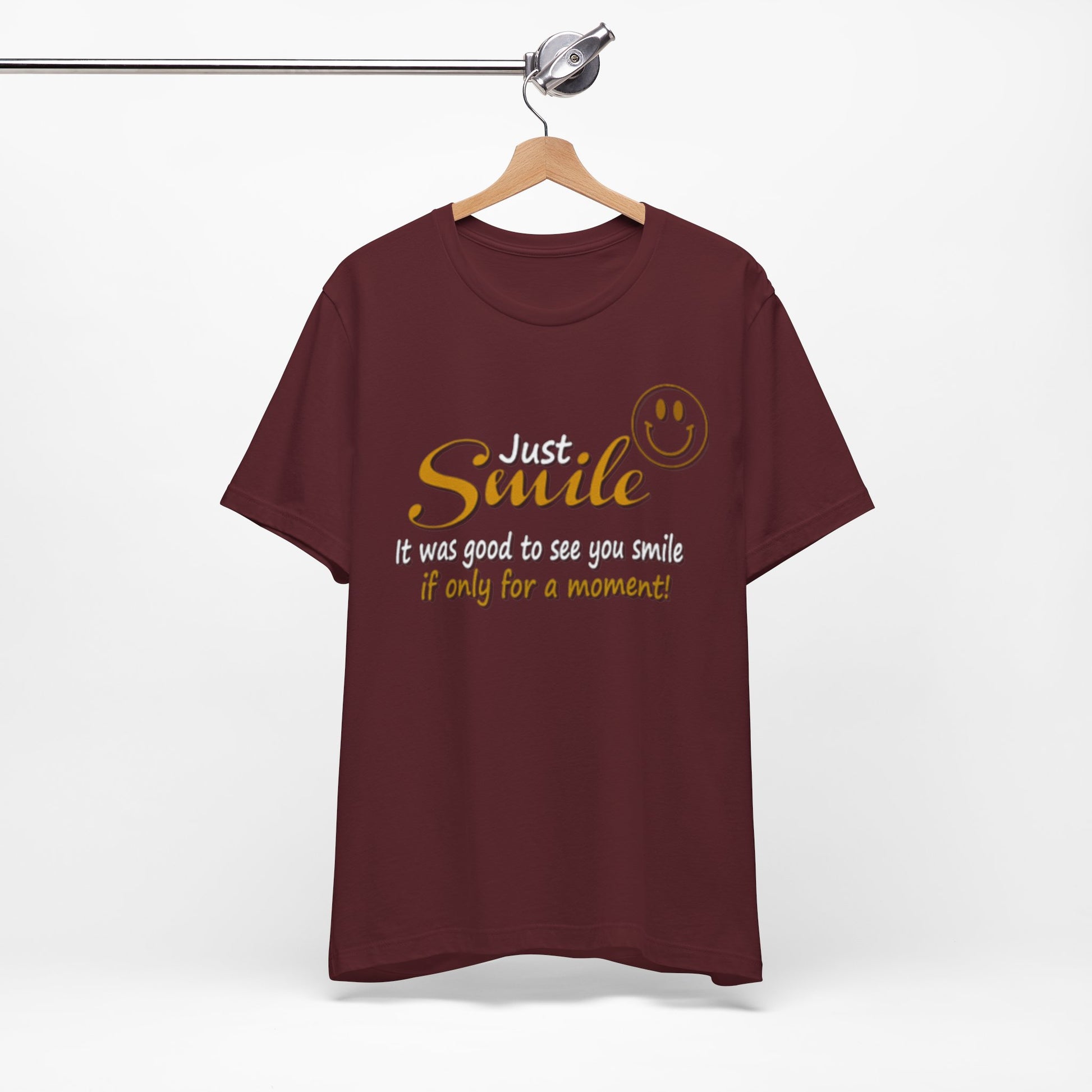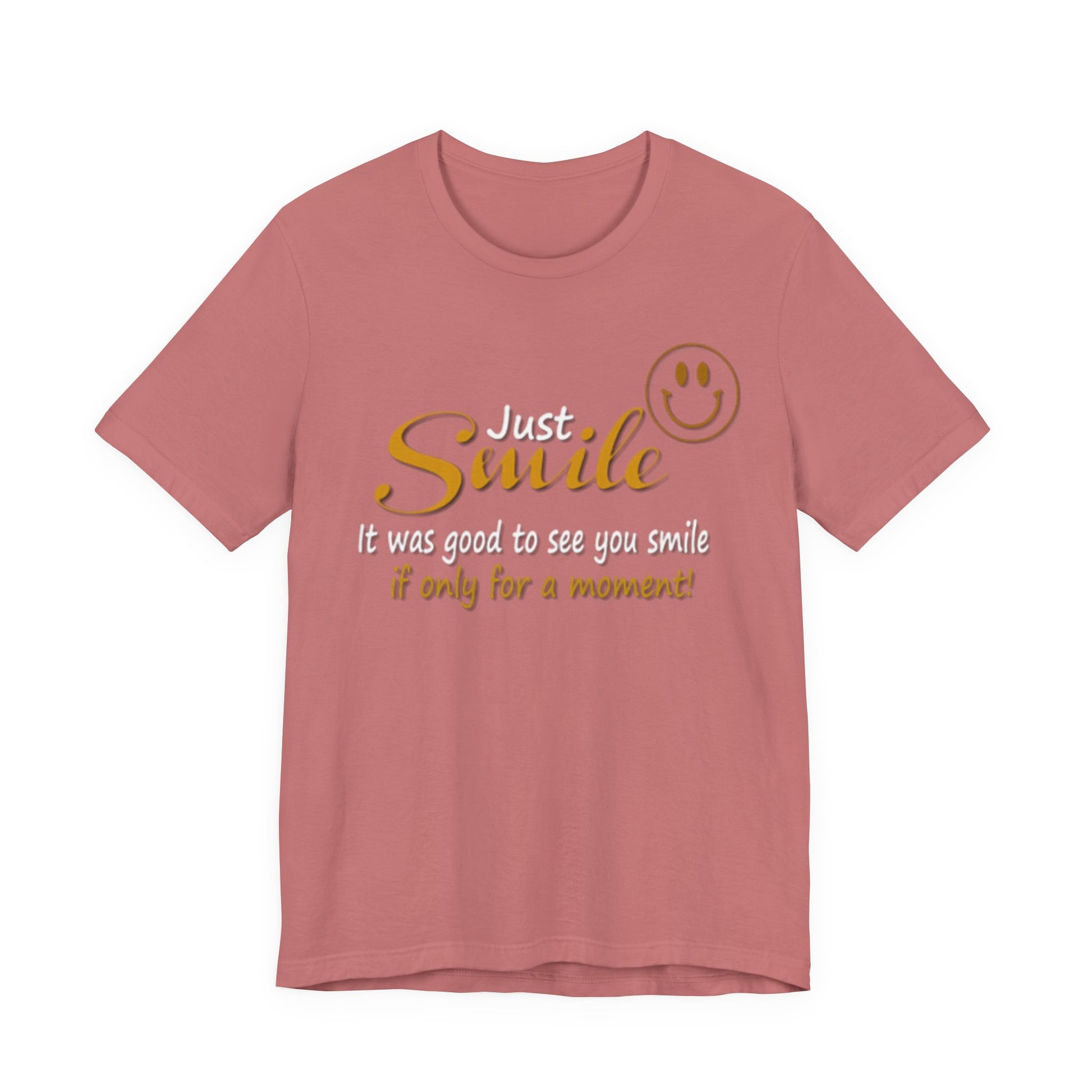 Lightweight, soft, and effortlessly cheerful — this jersey tee carries a quiet optimism wherever you go. The front features a warm, hand-lettered “Just Smile” with a simple smiley mark, rendered in soft gold tones that read like a friendly nudge. Breathable Airlume combed and ring-spun cotton keeps you cool while side seams and shoulder tape hold the shirt’s shape through repeated wear. The retail crew neckline and tear-away label add clean comfort for everyday wear. Slip it on for a coffee run, a casual meet-up, or a slow afternoon of errands — it’s an easy layer that brightens the day without shouting for attention.