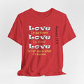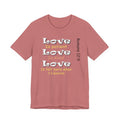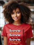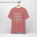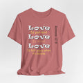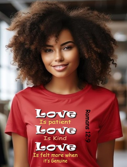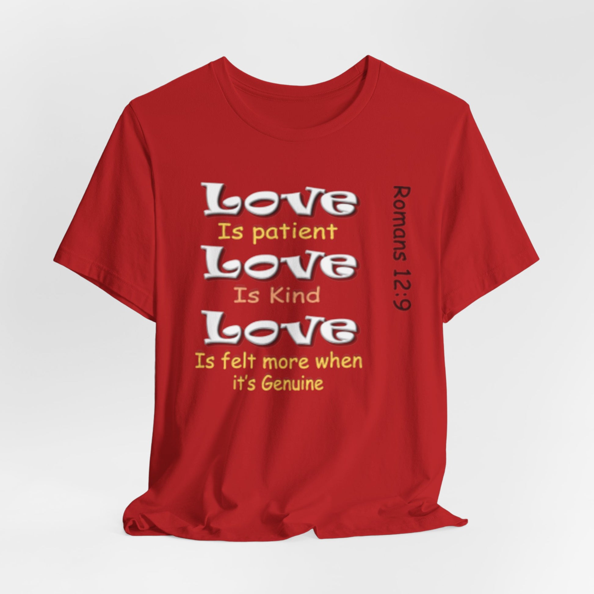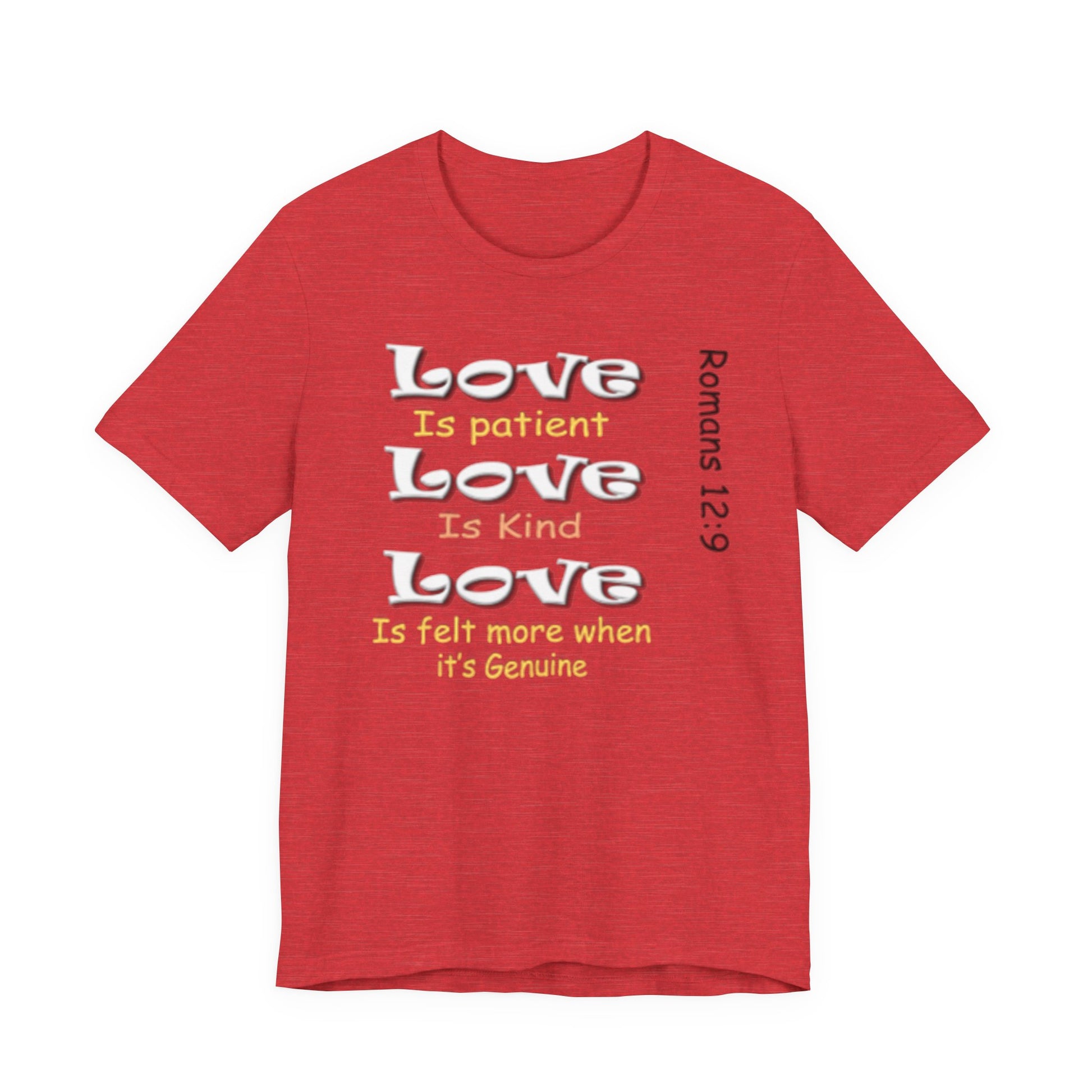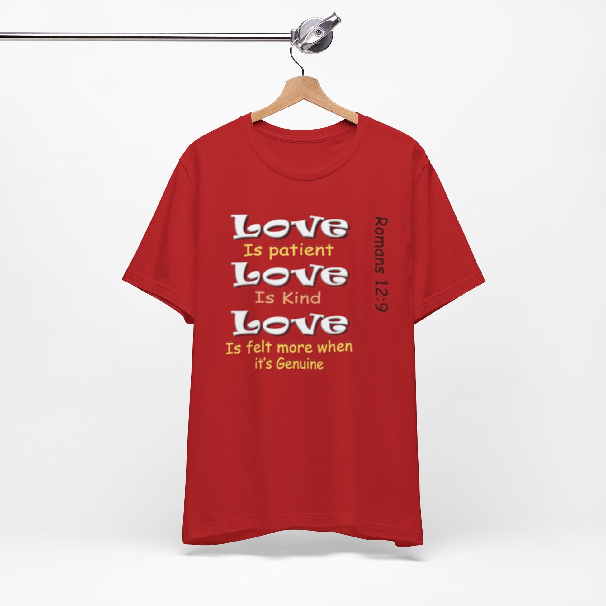 Soft, breathable, and quietly expressive — this crew-neck tee carries a gentle message that resonates. The front reads phrases about love with warm, hand-lettered strokes and a subtle gold accent, while a vertical reference to Romans 12:9 sits along the side. Lightweight Airlume cotton feels cool against the skin and layers easily under a jacket or over a long-sleeve on cooler days. The clean white canvas keeps the lettering the focus, so the message reads like a personal reminder: show patience, choose kindness, and let sincerity lead the way.