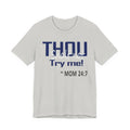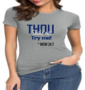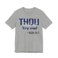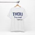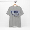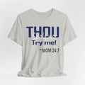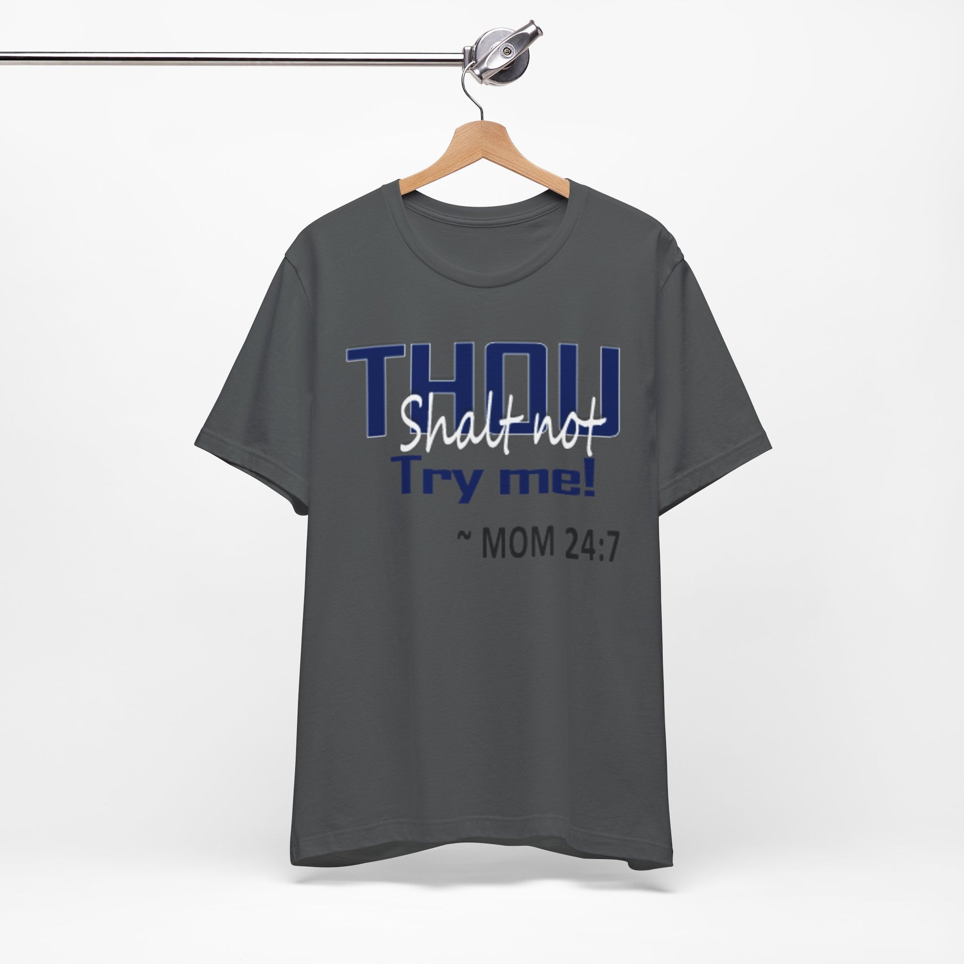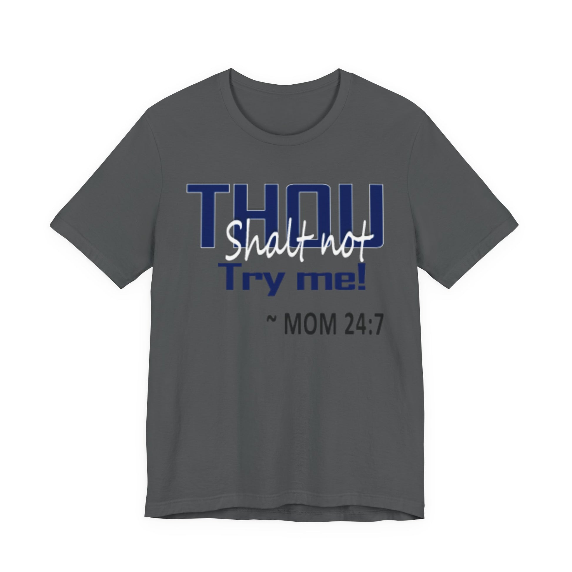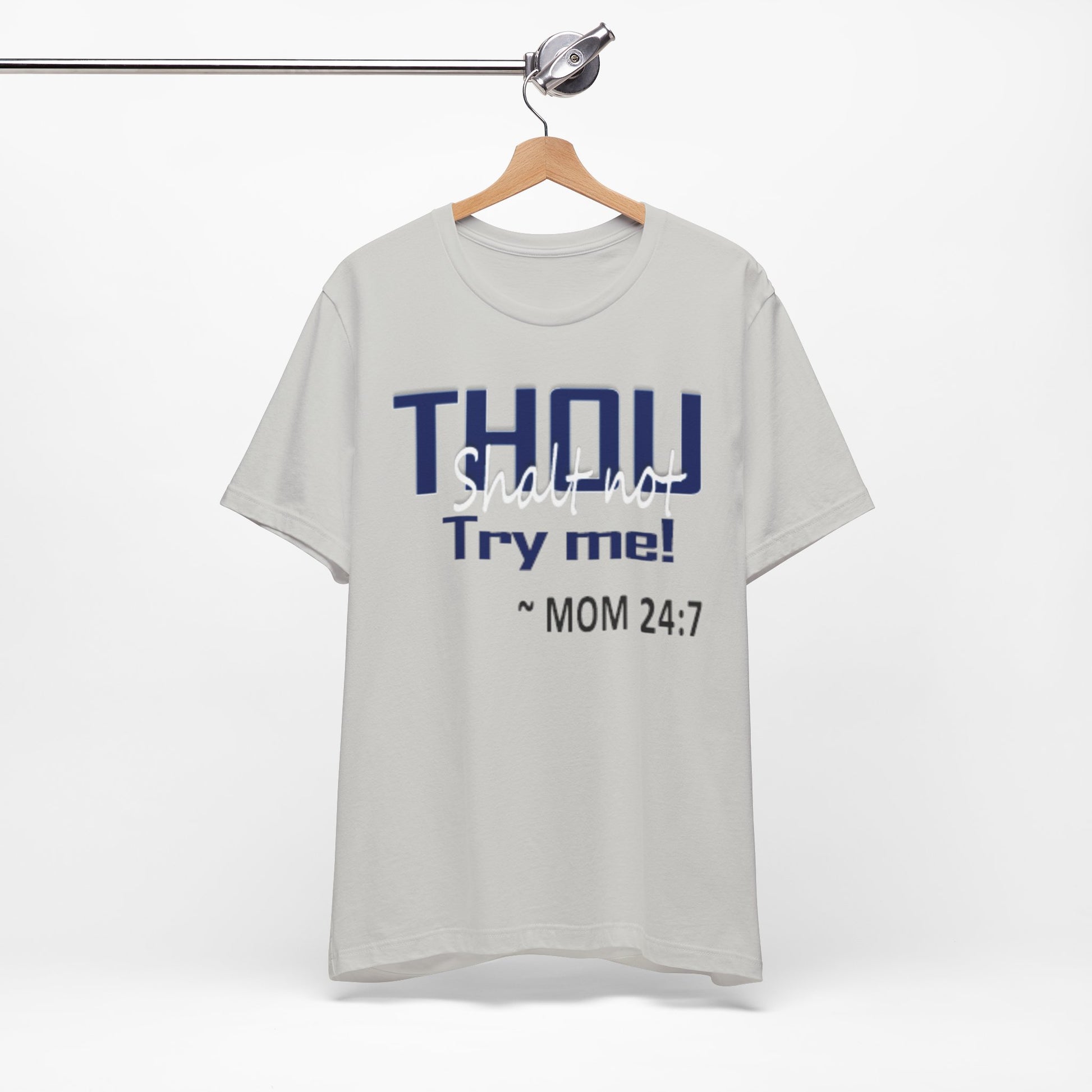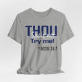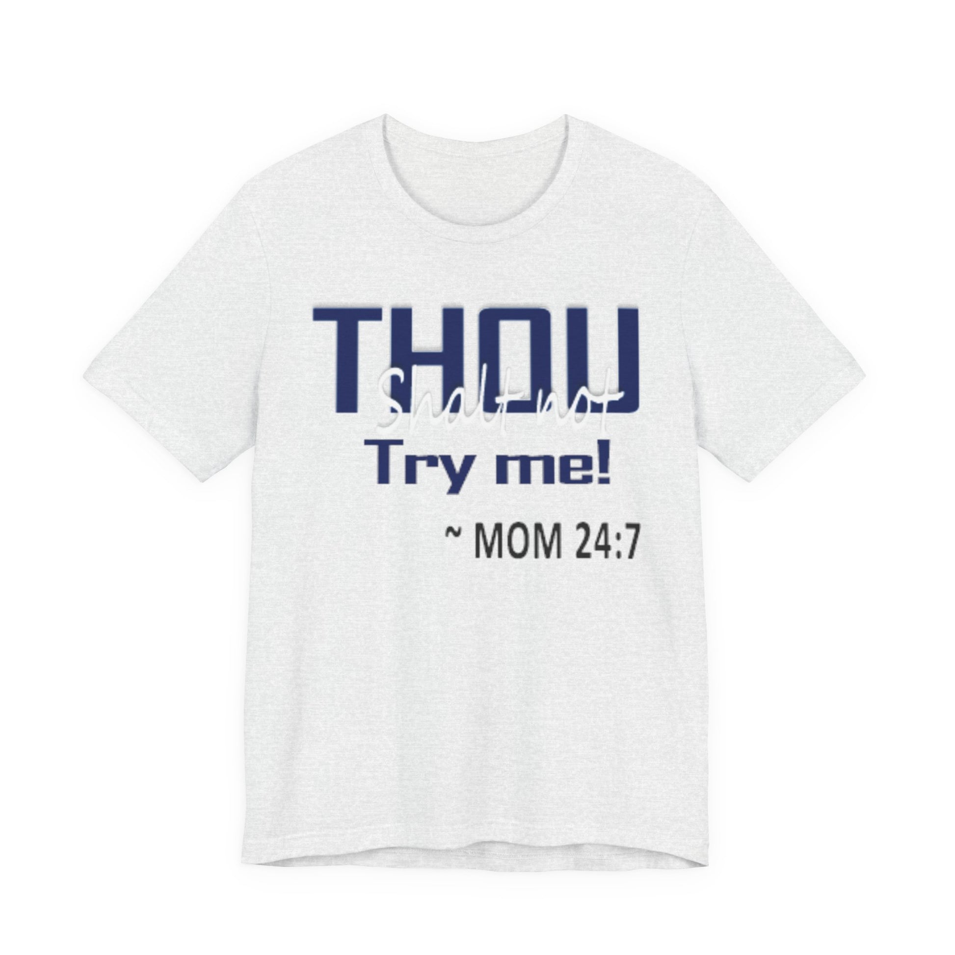 A soft, breathable jersey tee that speaks with a wink. The front features bold navy lettering that reads "THOU" with a playful, distressed finish and the cheeky line "Try me! ~ MOM 24:7" beneath — a shirt made to start conversations, raise smiles, and carry a little homegrown sass. Lightweight Airlume combed and ring-spun cotton keeps it comfortable all day, while the retail crew cut and neat neckline make it easy to layer or wear on its own. The tear-away label and thoughtful construction (shoulder tape, ribbed collar, side seams) keep the fit looking sharp wash after wash. Wear it lounging at home, running errands, or wearing out to family gatherings when you want to blend humor with comfort.