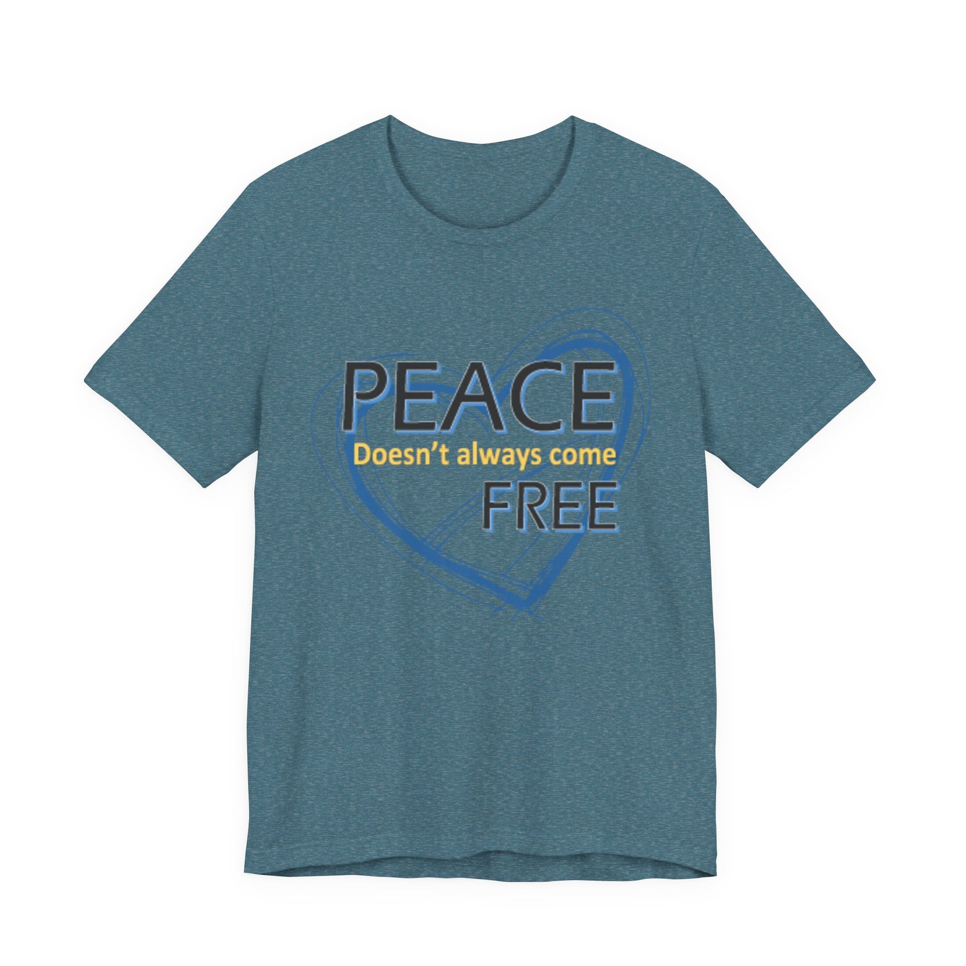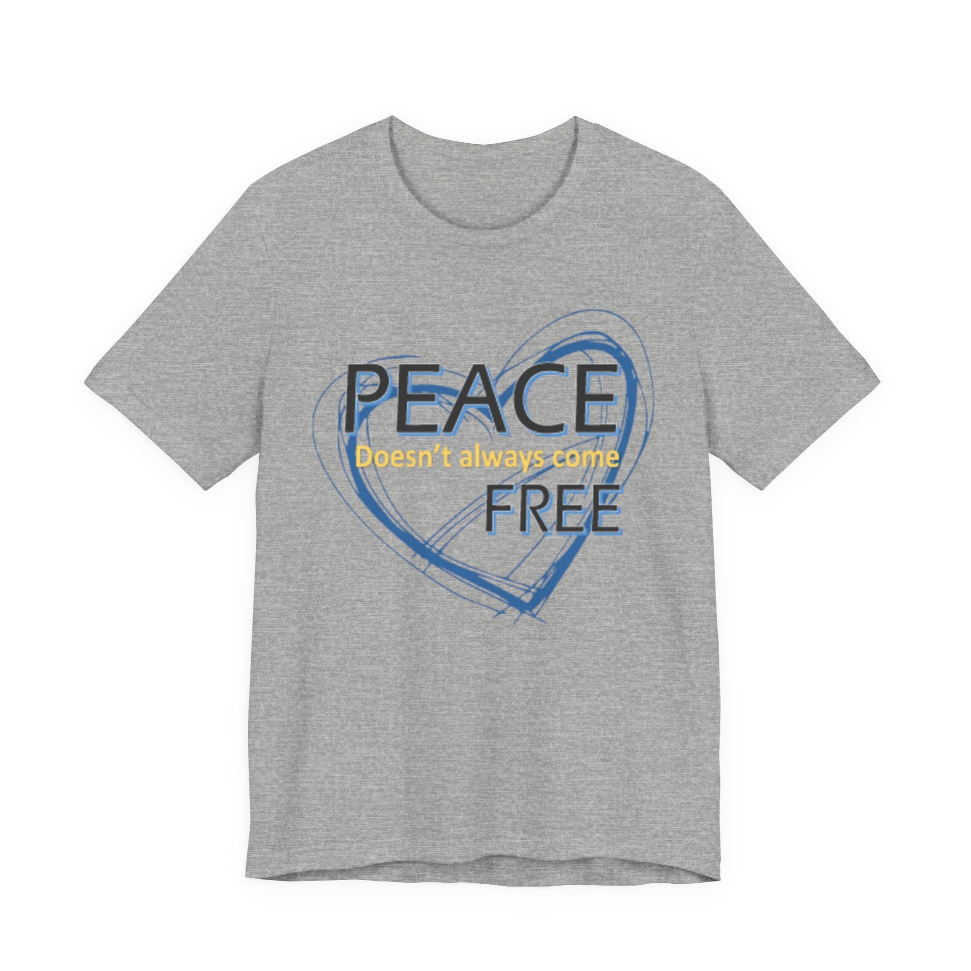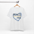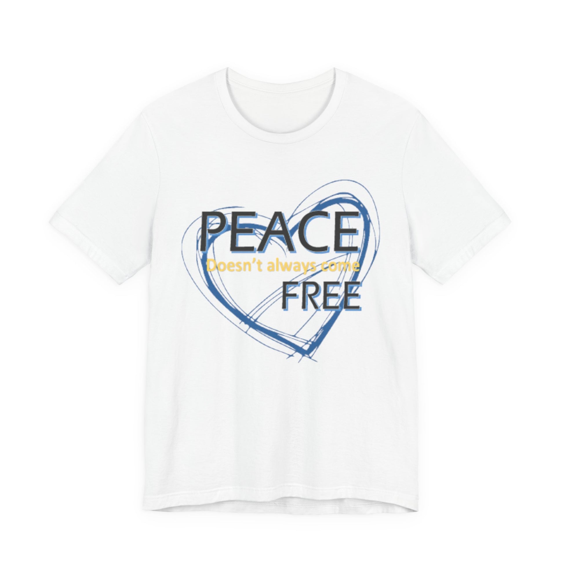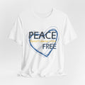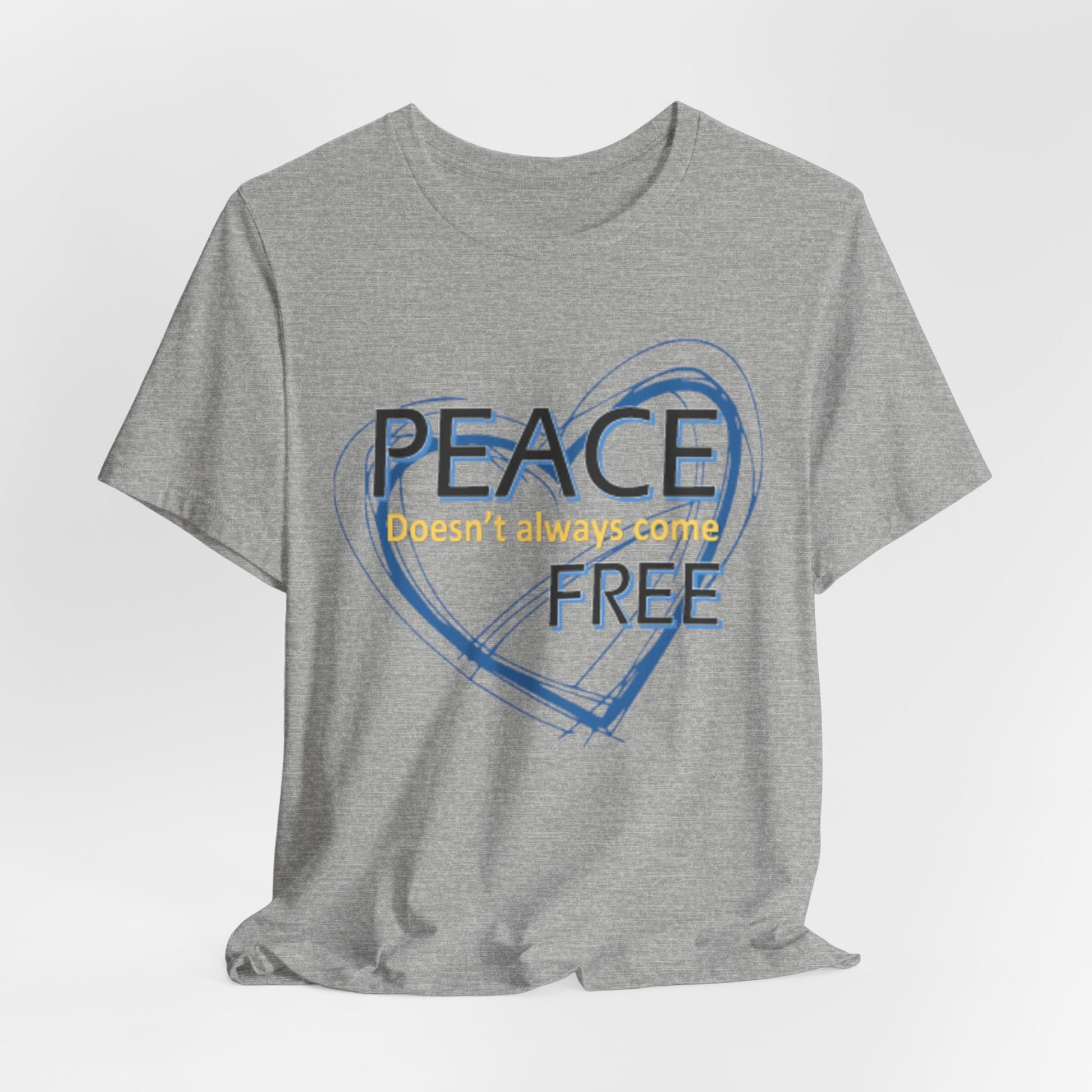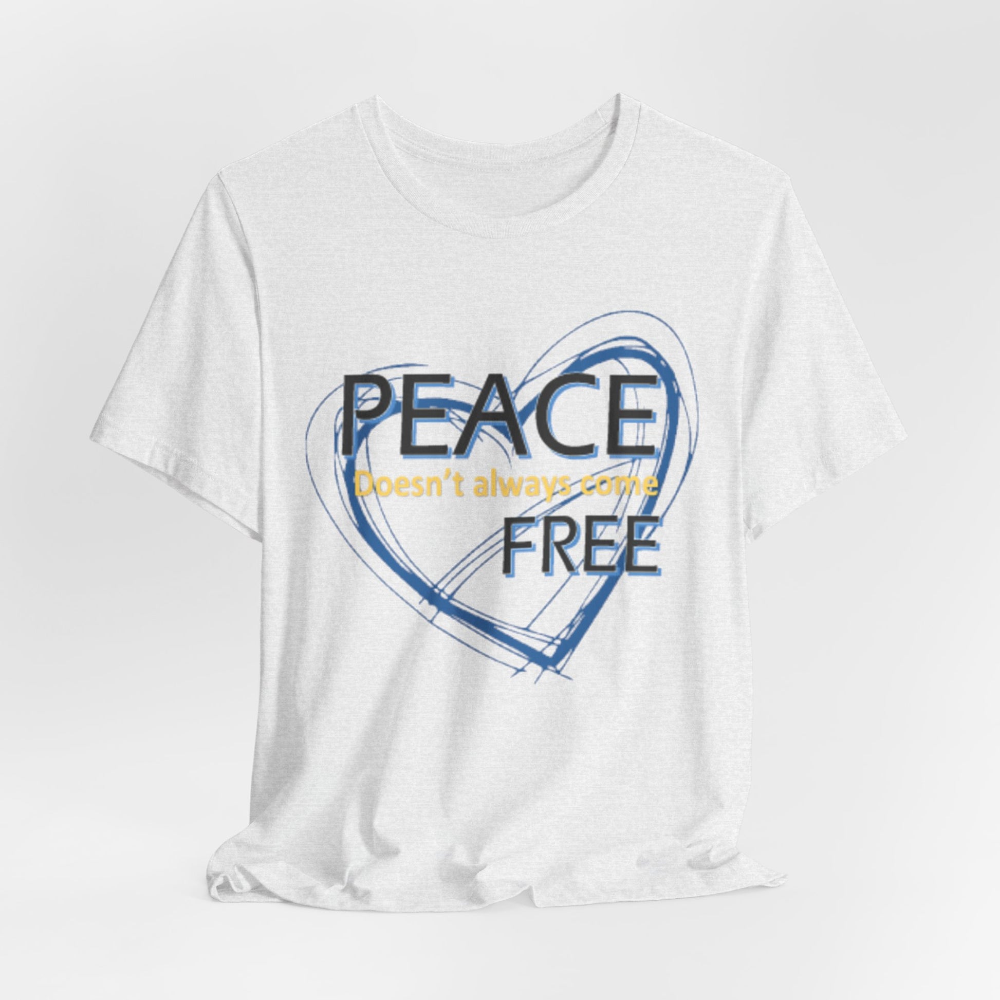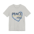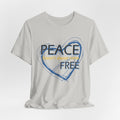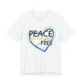 Soft, breathable tee carrying a calm, thoughtful message. A hand-drawn heart in layered blue wraps the words “PEACE” and “FREE” with a faint, handwritten line reading “doesn’t have to” between them — a quiet reminder that peace is a choice you can wear. The lightweight Airlume combed and ring-spun cotton feels gentle against the skin and layers easily under a jacket or over a long-sleeve. Subtle retail fit and crew neckline keep the look tidy while the tear-away label and stabilized shoulder seams prioritize comfort. Wear it to slow down, to start conversations, or to bring a little softness into a busy day.