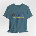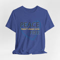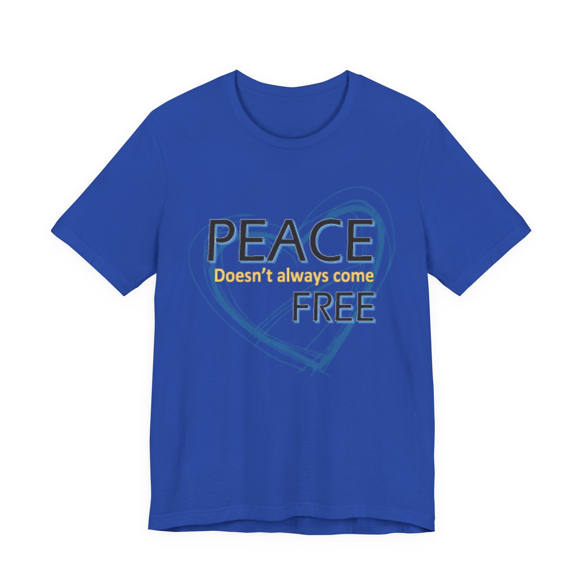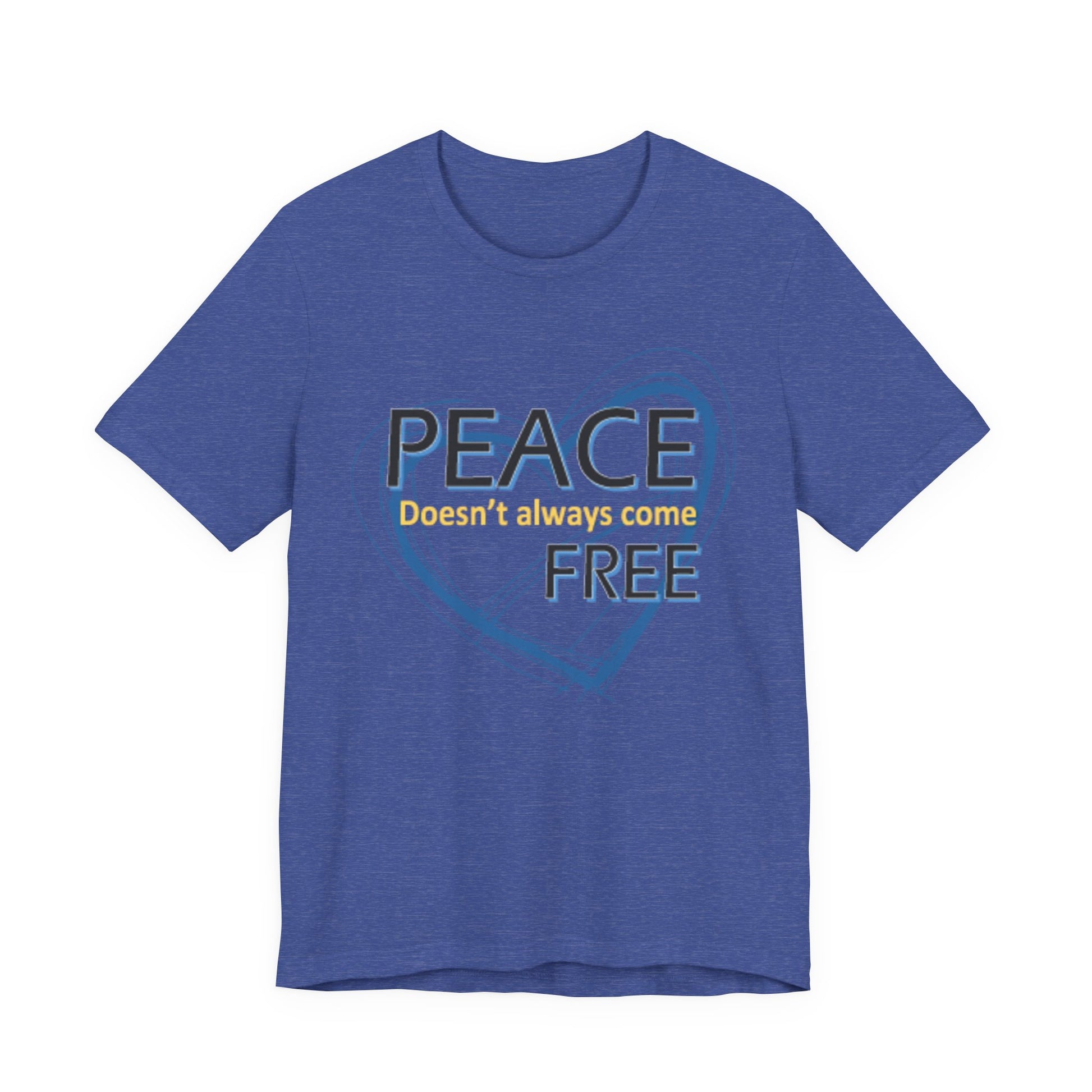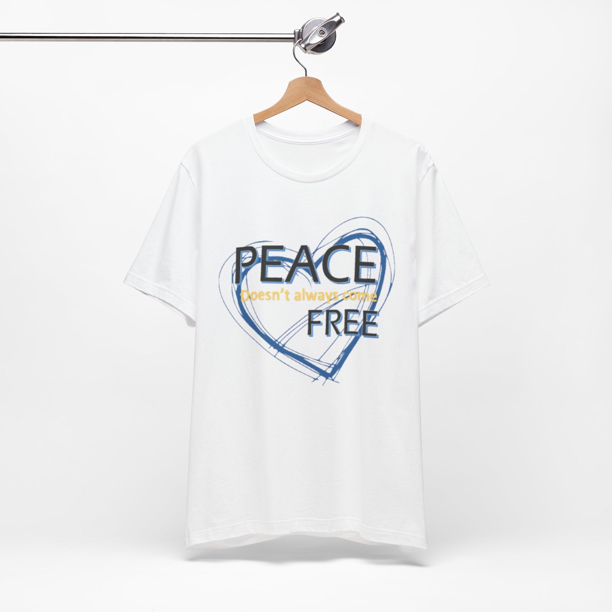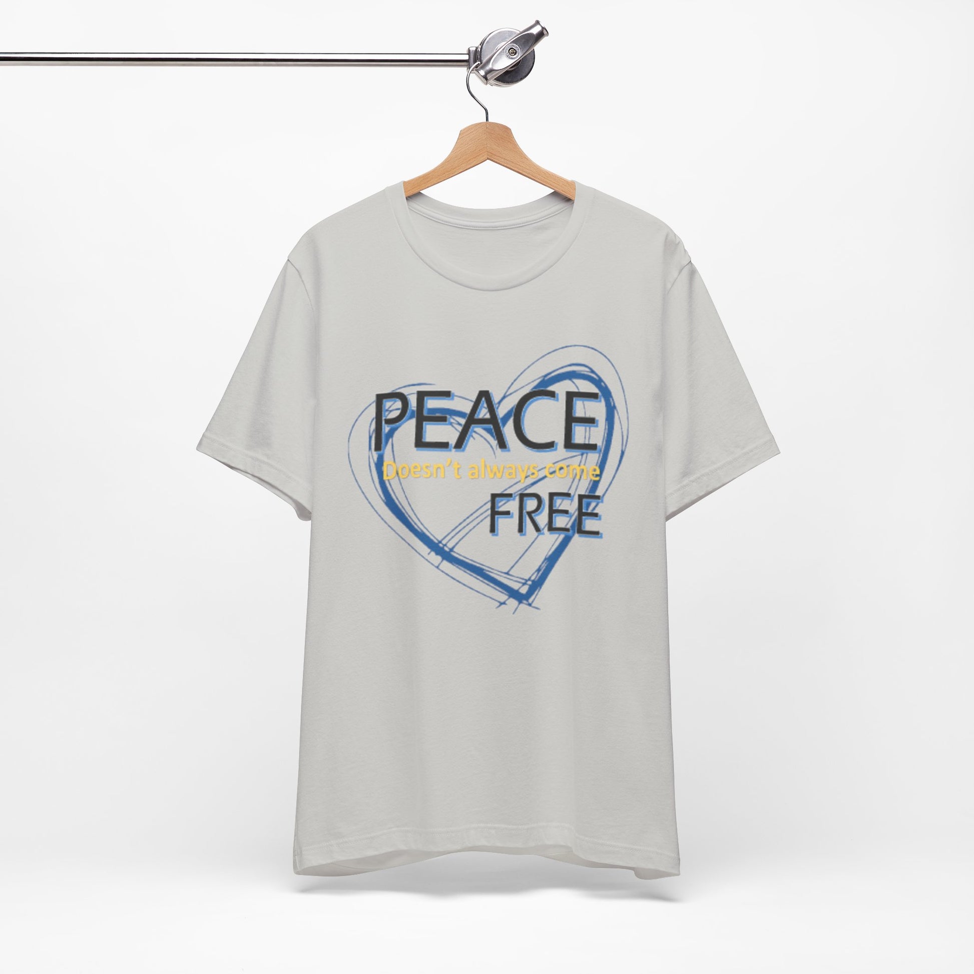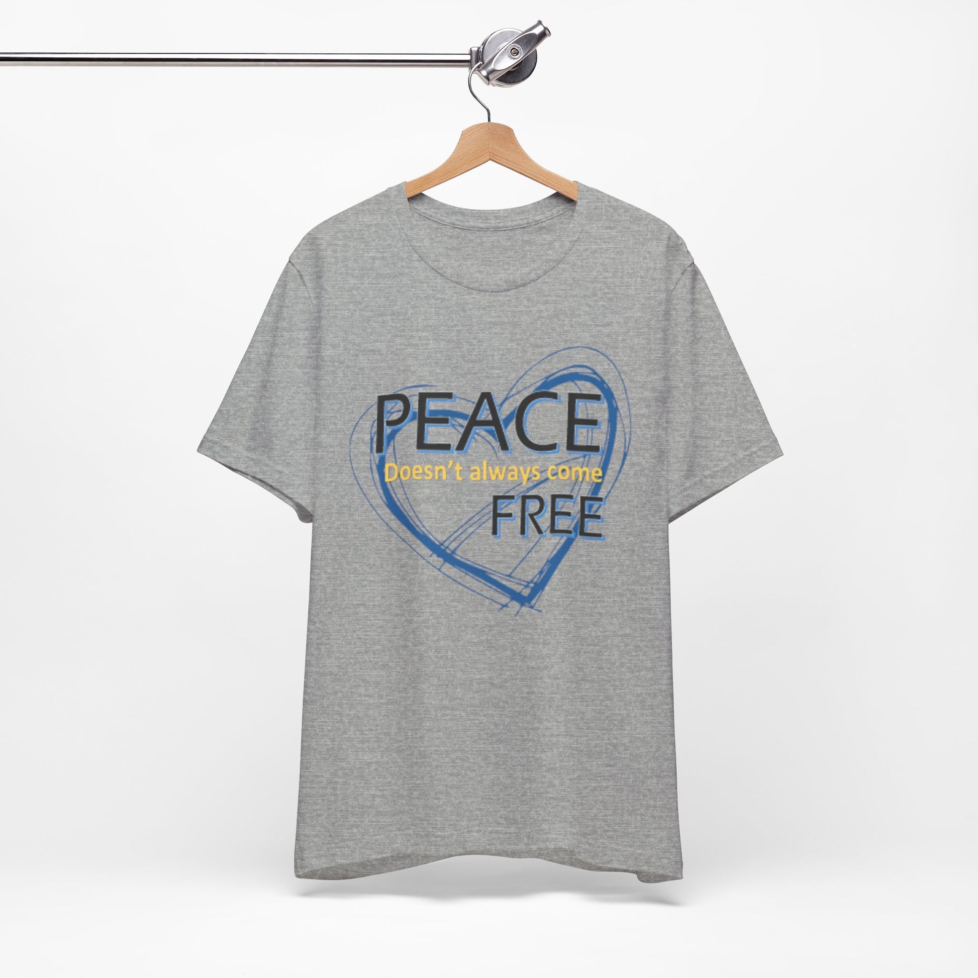 Soft, breathable tee carrying a calm, thoughtful message. A hand-drawn heart in layered blue wraps the words “PEACE” and “FREE” with a faint, handwritten line reading “doesn’t have to” between them — a quiet reminder that peace is a choice you can wear. The lightweight Airlume combed and ring-spun cotton feels gentle against the skin and layers easily under a jacket or over a long-sleeve. Subtle retail fit and crew neckline keep the look tidy while the tear-away label and stabilized shoulder seams prioritize comfort. Wear it to slow down, to start conversations, or to bring a little softness into a busy day.