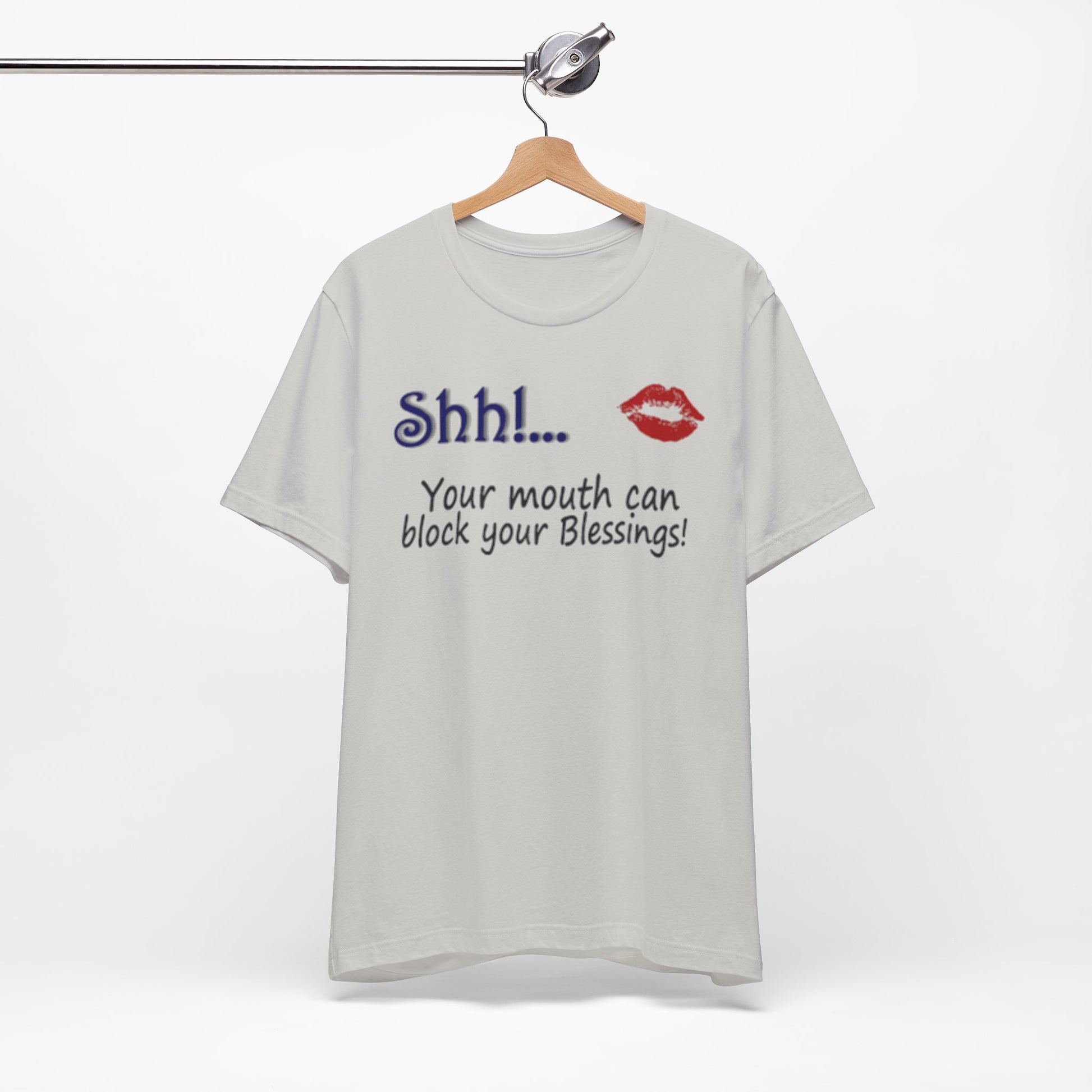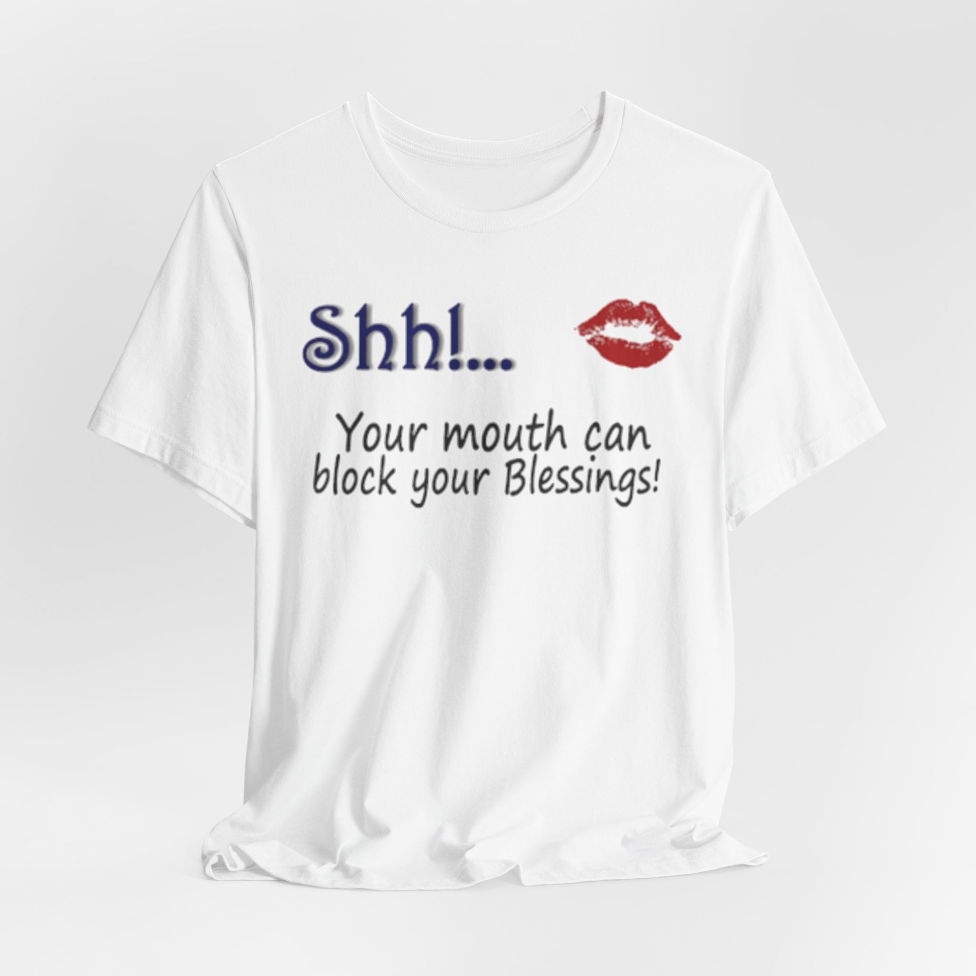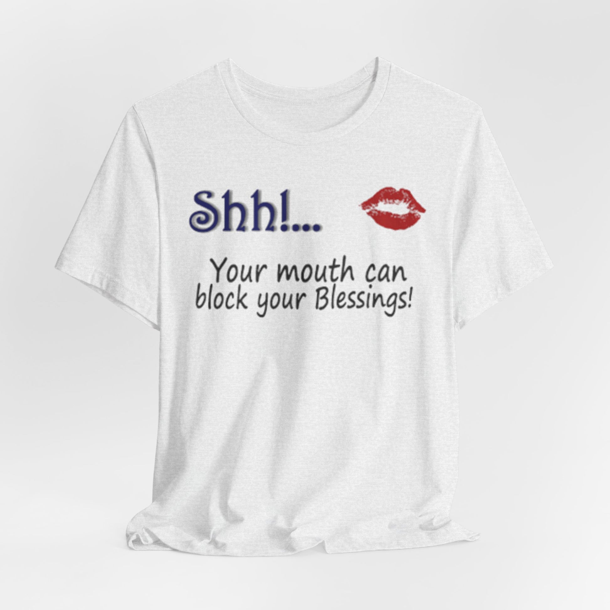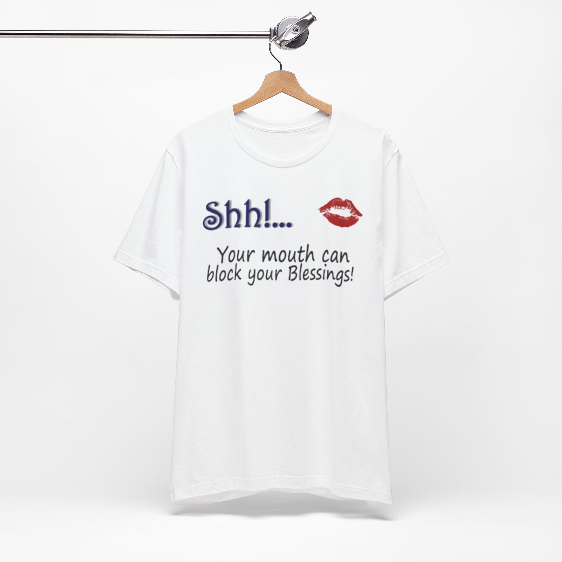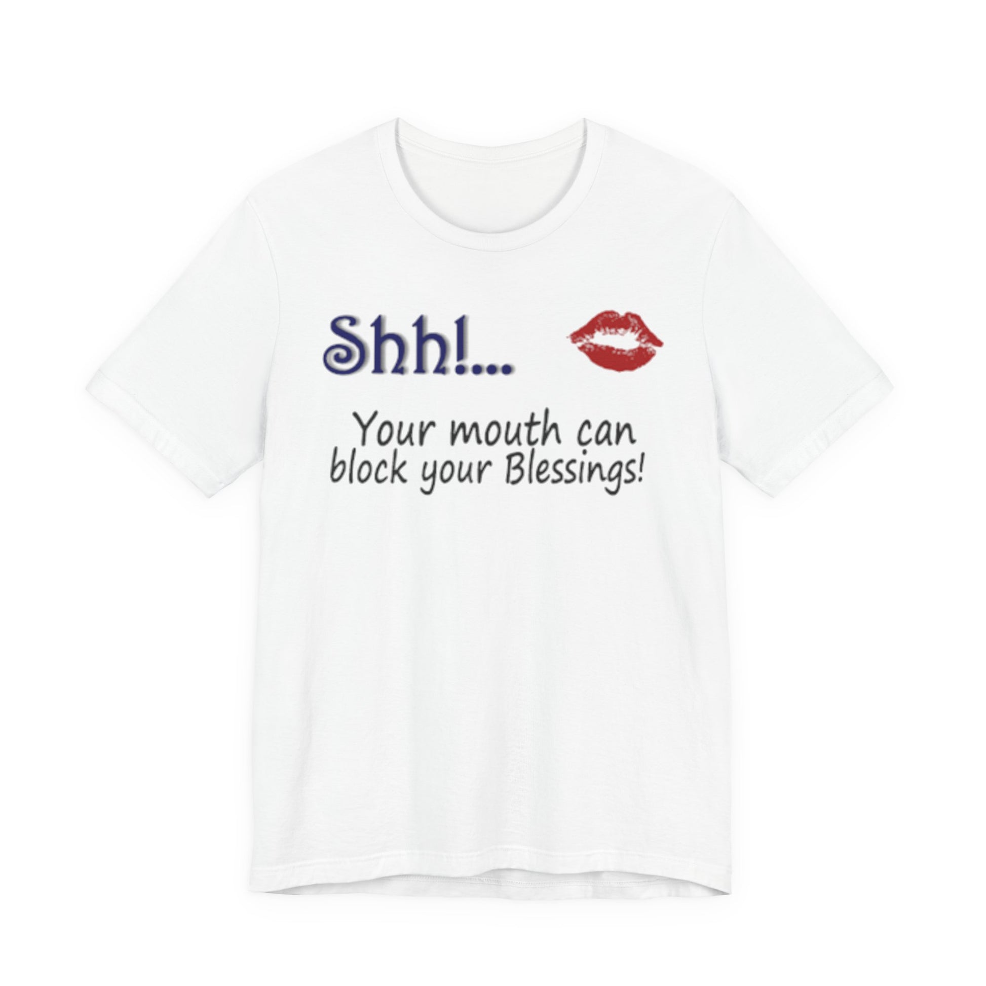 Quiet confidence in a soft tee. This lightweight jersey shirt carries a playful, faith-forward message — a small reminder to speak with care. The front features a gentle “Shh!…” script, a kiss mark, and the line “Your mouth can block your Blessings!” printed in a relaxed, handwritten style. It sits on a clean white canvas so the text and graphic read clearly without shouting. Wear it layered under a jacket or on its own when you want to make a subtle statement: calm, thoughtful, and a little cheeky.