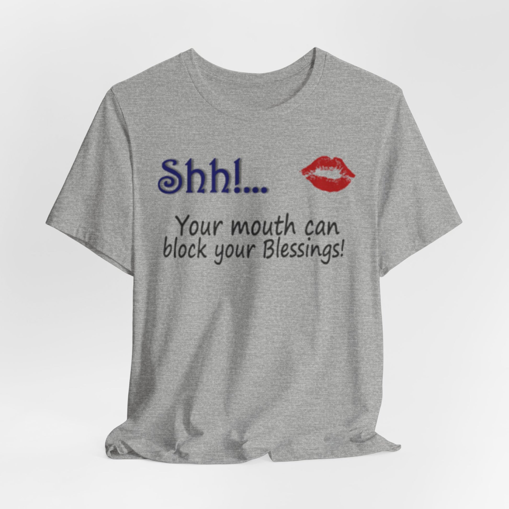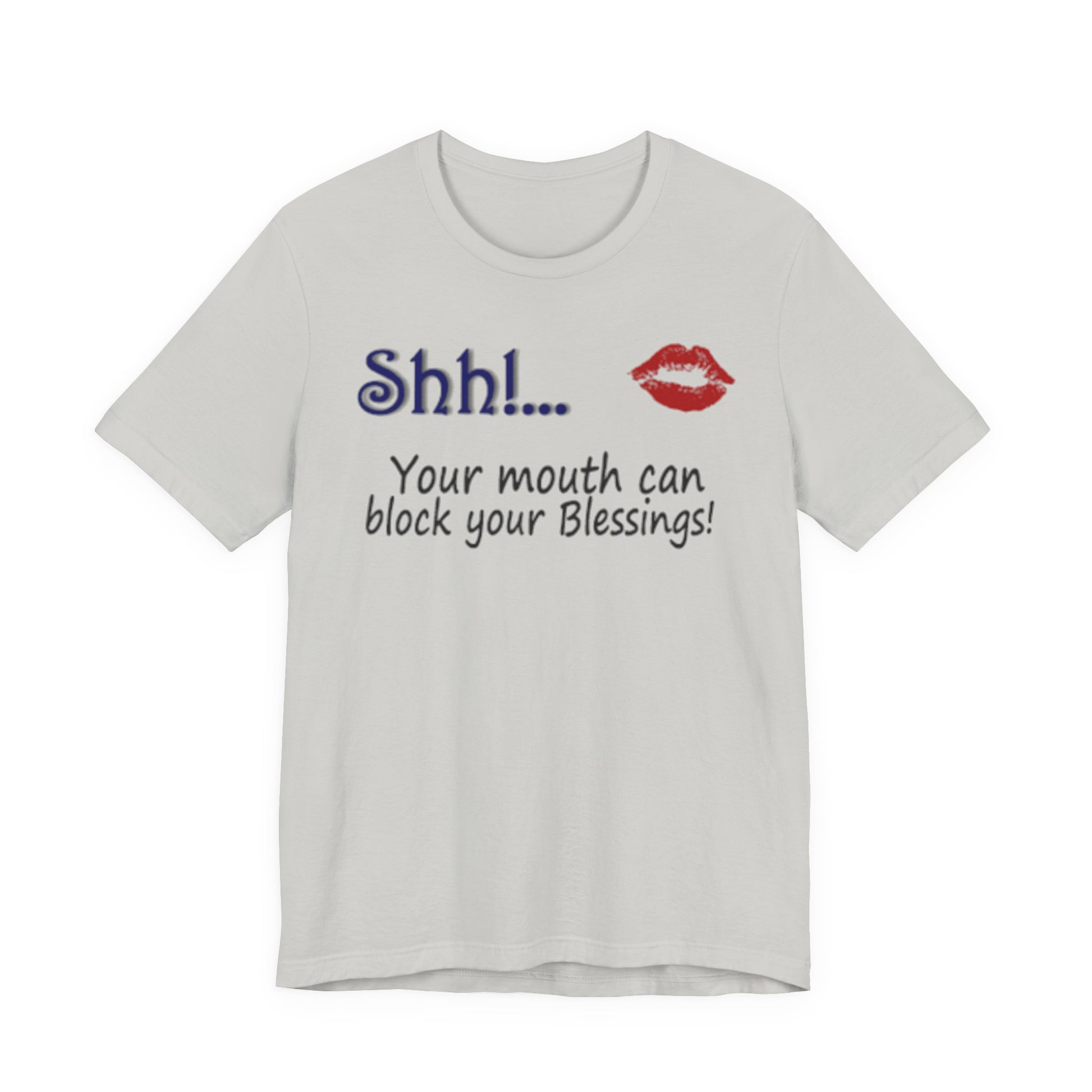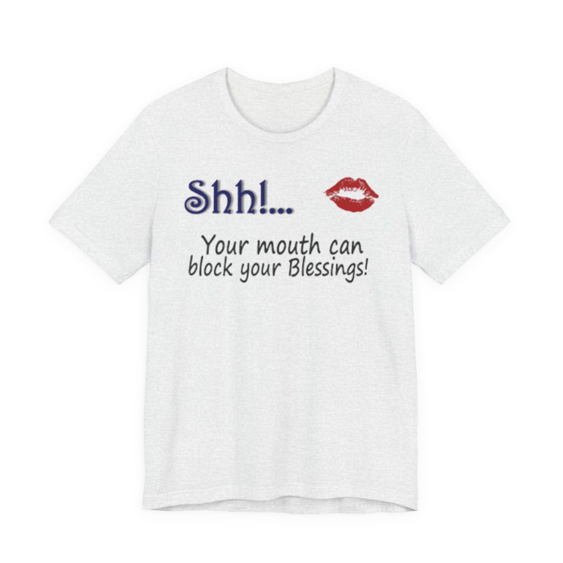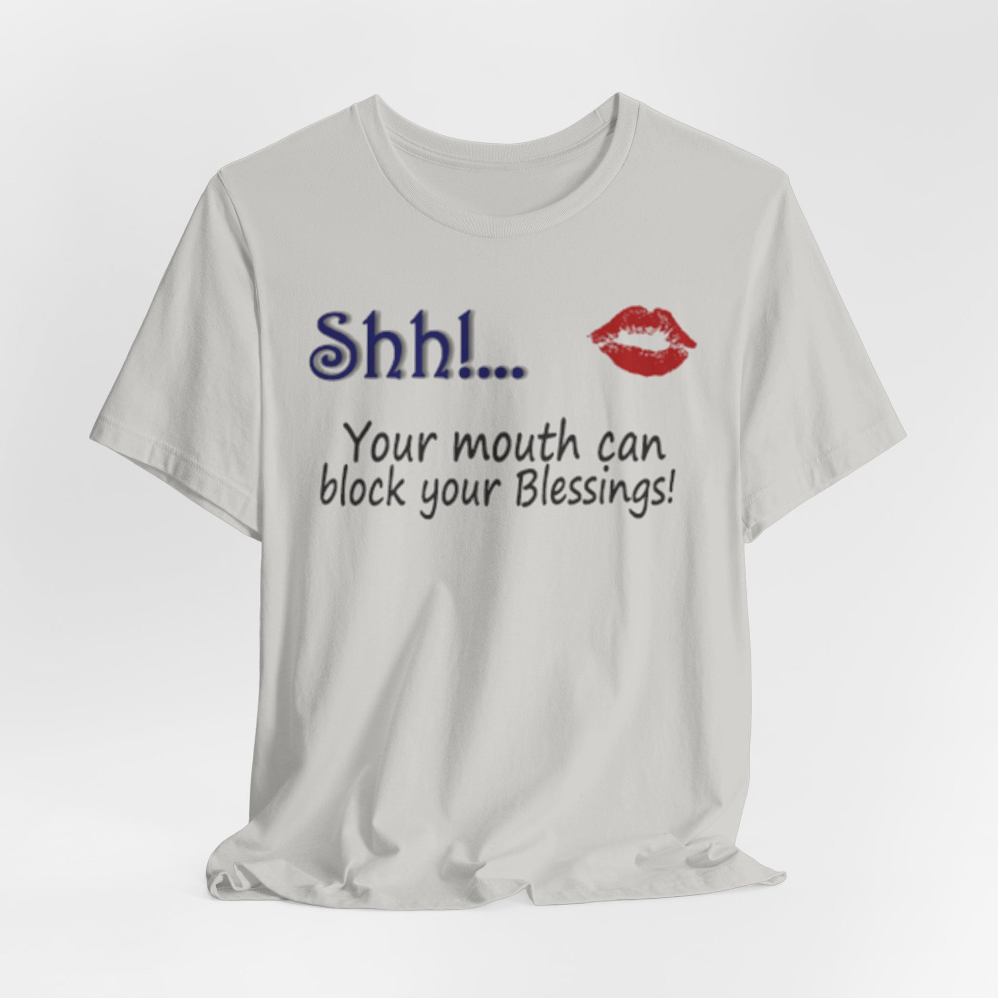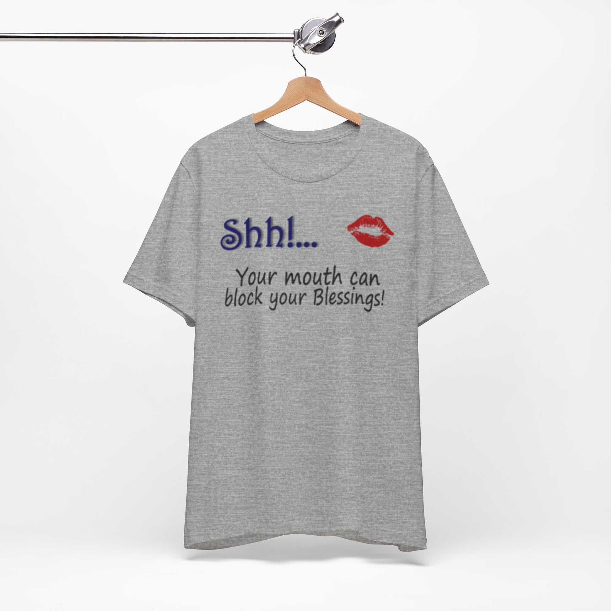 Quiet confidence in a soft tee. This lightweight jersey shirt carries a playful, faith-forward message — a small reminder to speak with care. The front features a gentle “Shh!…” script, a kiss mark, and the line “Your mouth can block your Blessings!” printed in a relaxed, handwritten style. It sits on a clean white canvas so the text and graphic read clearly without shouting. Wear it layered under a jacket or on its own when you want to make a subtle statement: calm, thoughtful, and a little cheeky.