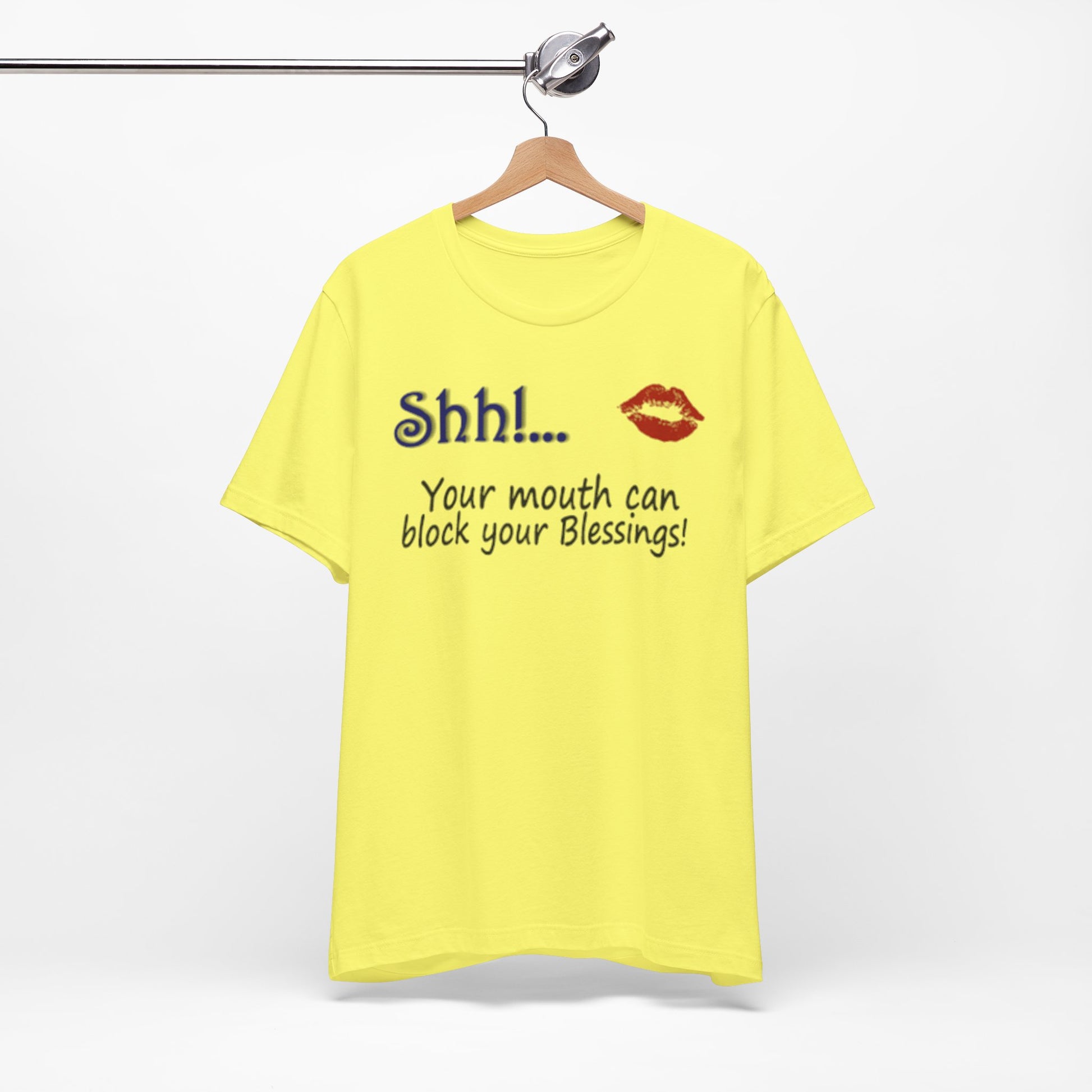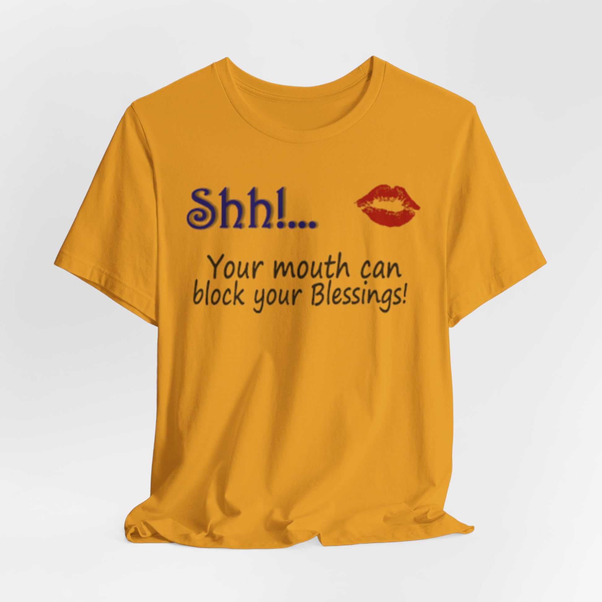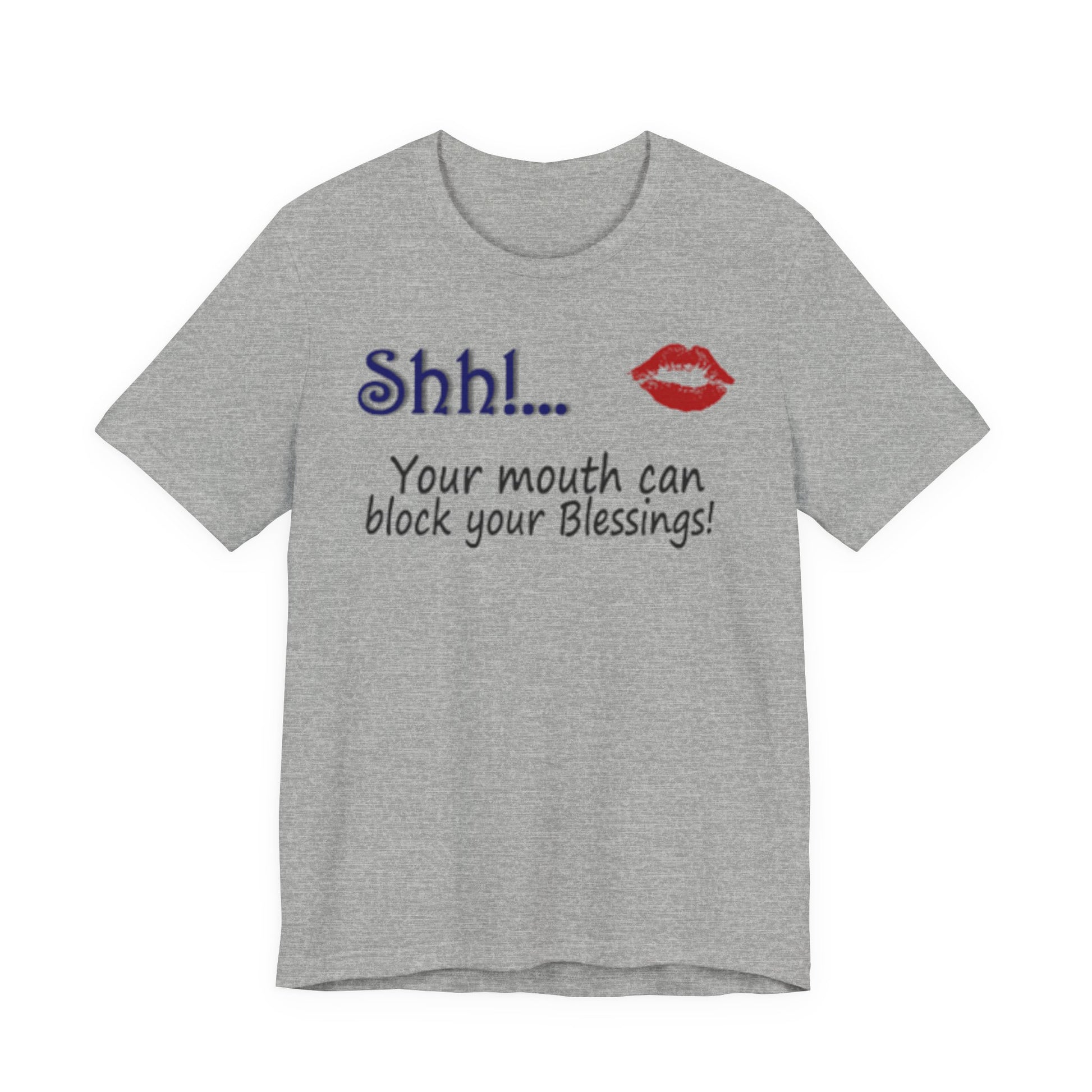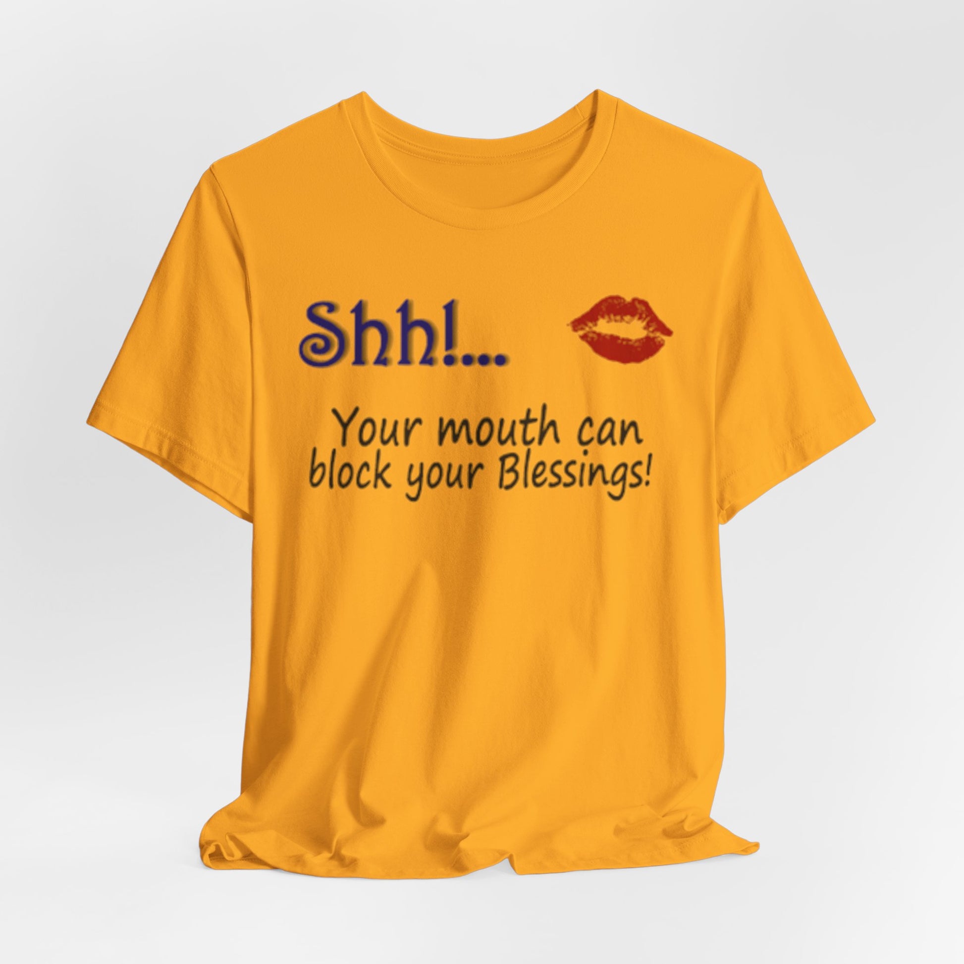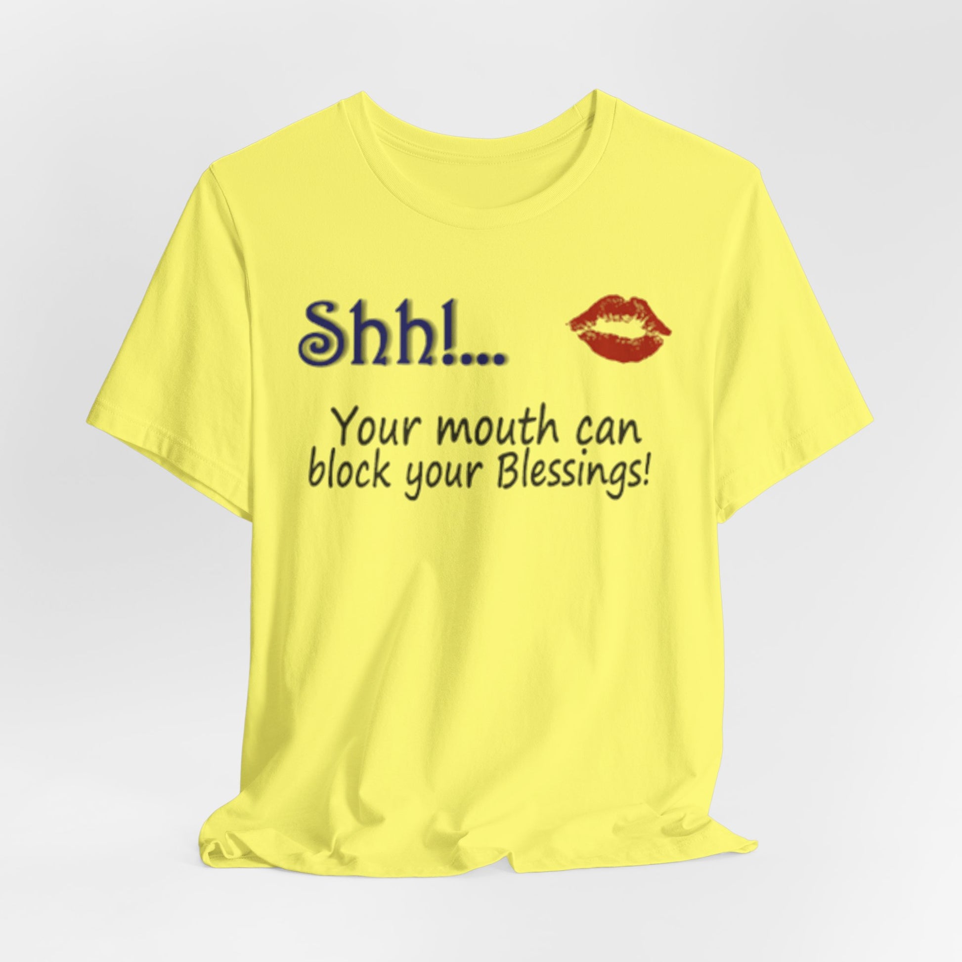 Quiet confidence in a soft tee. This lightweight jersey shirt carries a playful, faith-forward message — a small reminder to speak with care. The front features a gentle “Shh!…” script, a kiss mark, and the line “Your mouth can block your Blessings!” printed in a relaxed, handwritten style. It sits on a clean white canvas so the text and graphic read clearly without shouting. Wear it layered under a jacket or on its own when you want to make a subtle statement: calm, thoughtful, and a little cheeky.