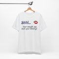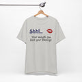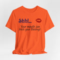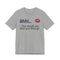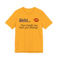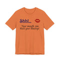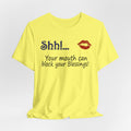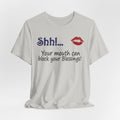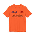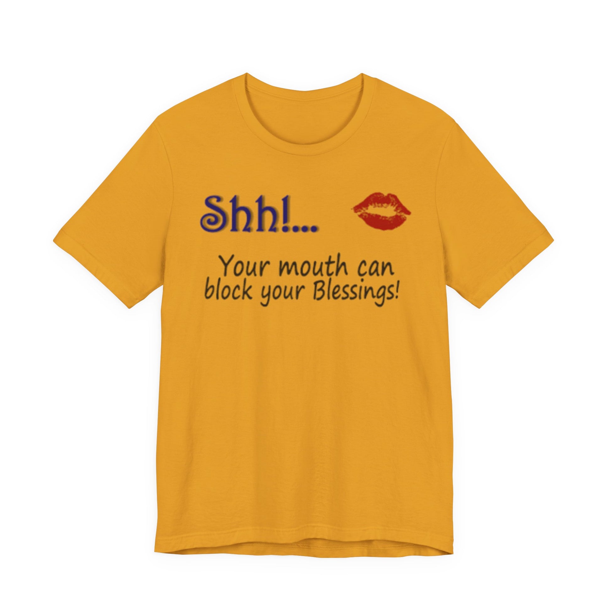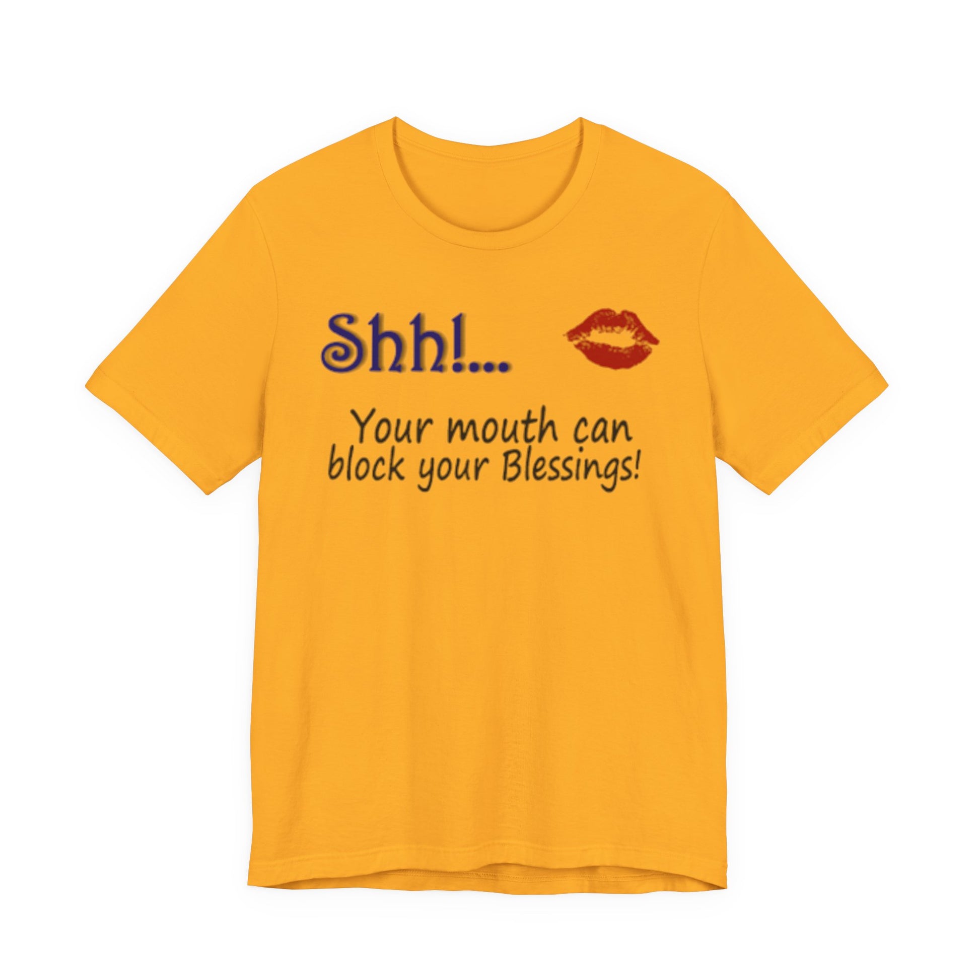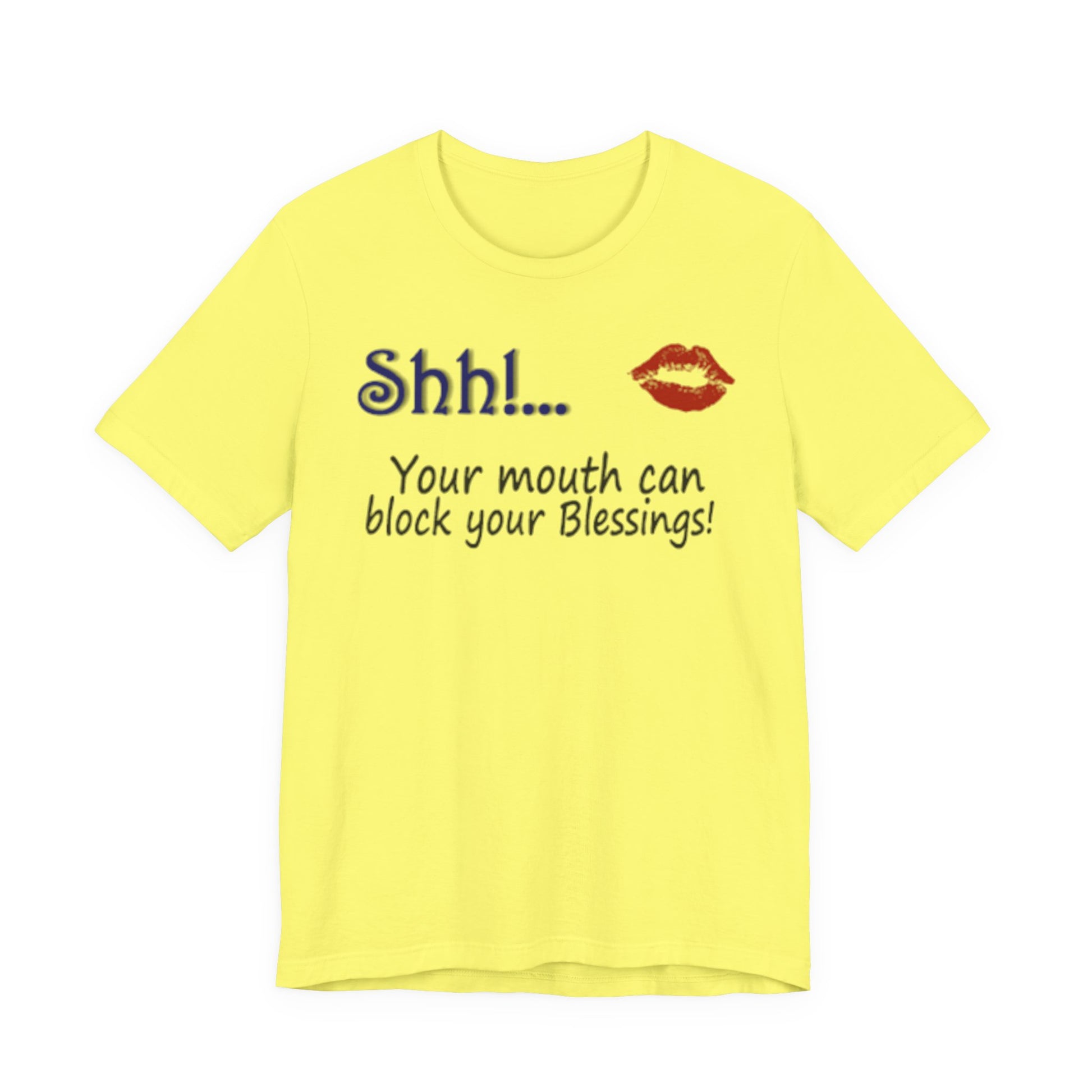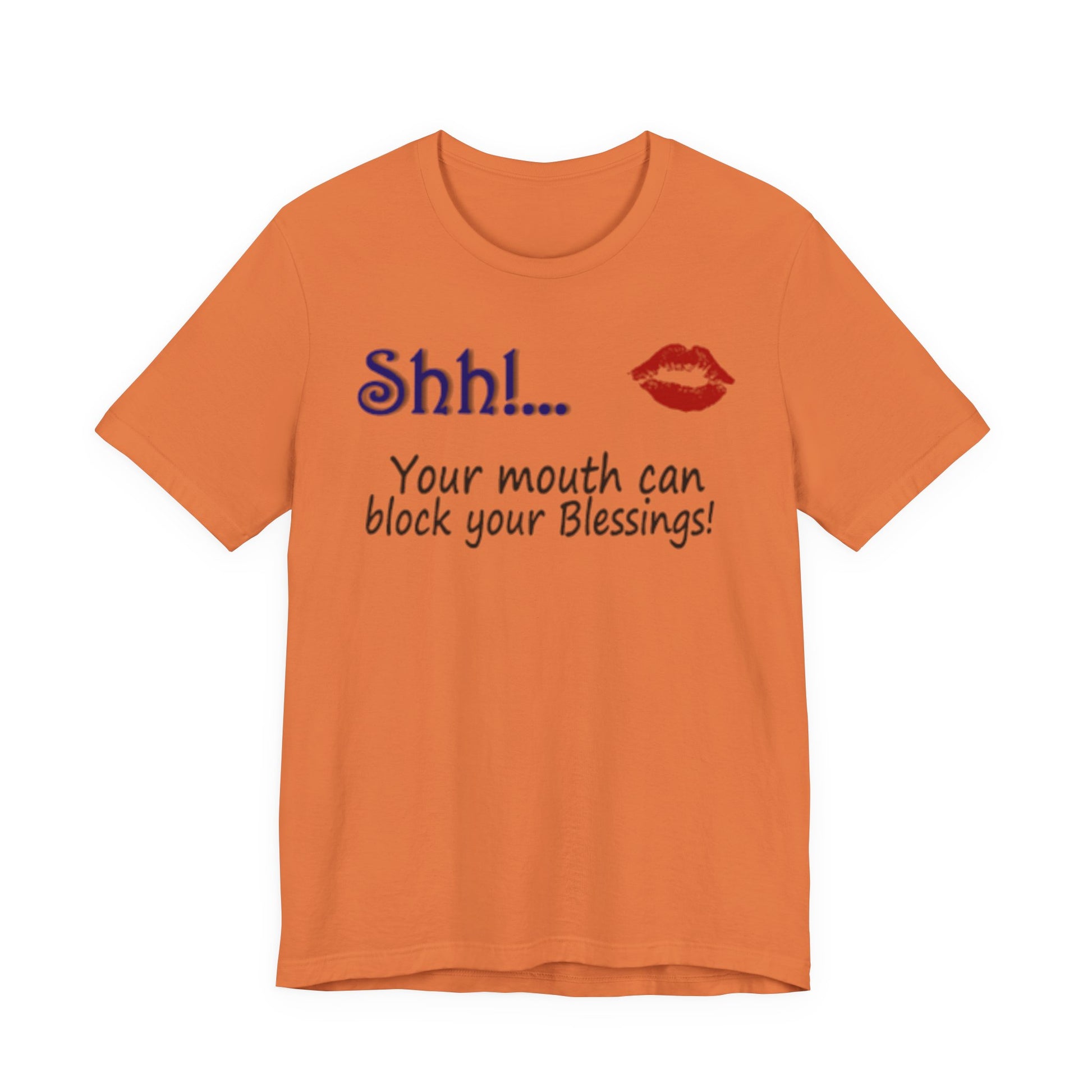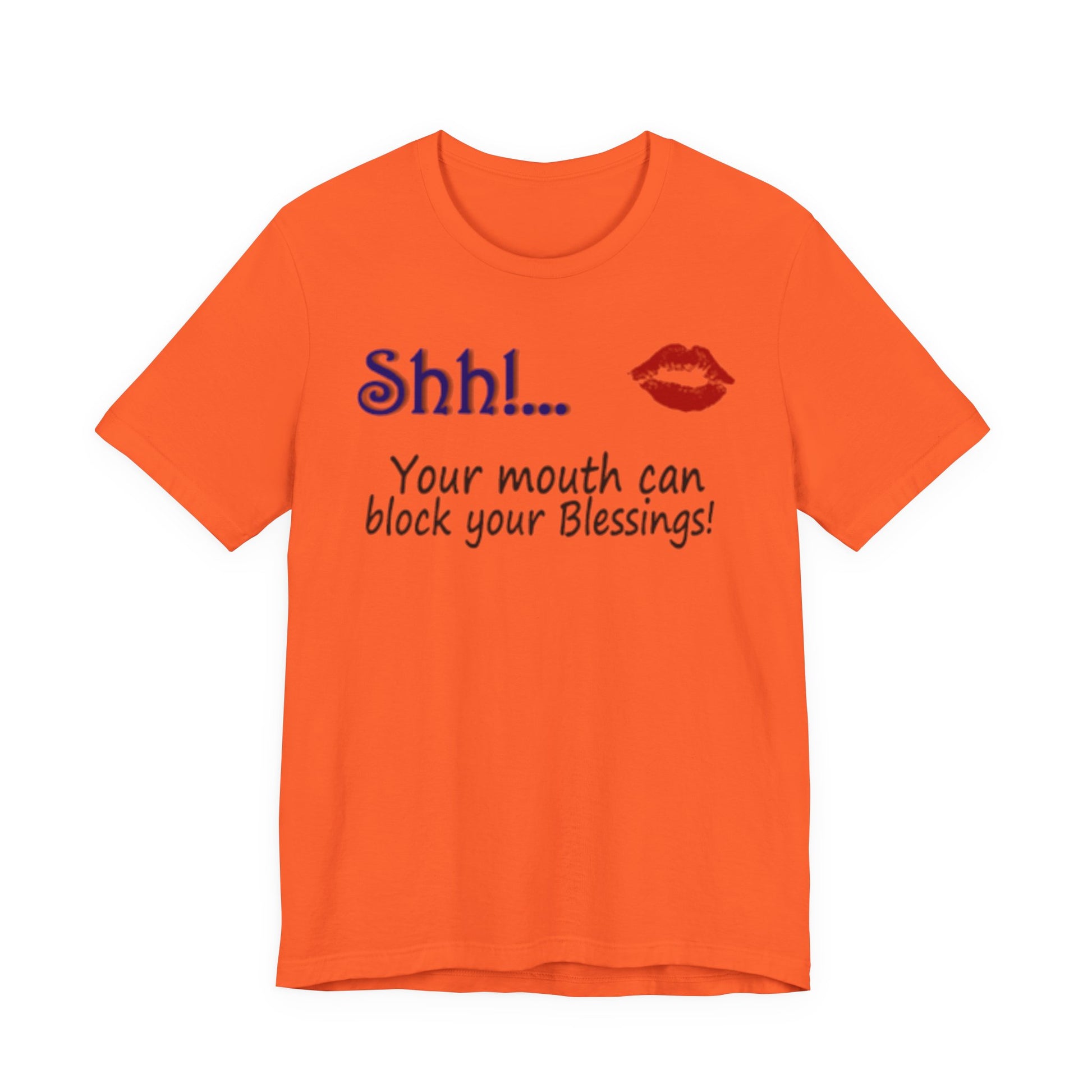 Quiet confidence in a soft tee. This lightweight jersey shirt carries a playful, faith-forward message — a small reminder to speak with care. The front features a gentle “Shh!…” script, a kiss mark, and the line “Your mouth can block your Blessings!” printed in a relaxed, handwritten style. It sits on a clean white canvas so the text and graphic read clearly without shouting. Wear it layered under a jacket or on its own when you want to make a subtle statement: calm, thoughtful, and a little cheeky.