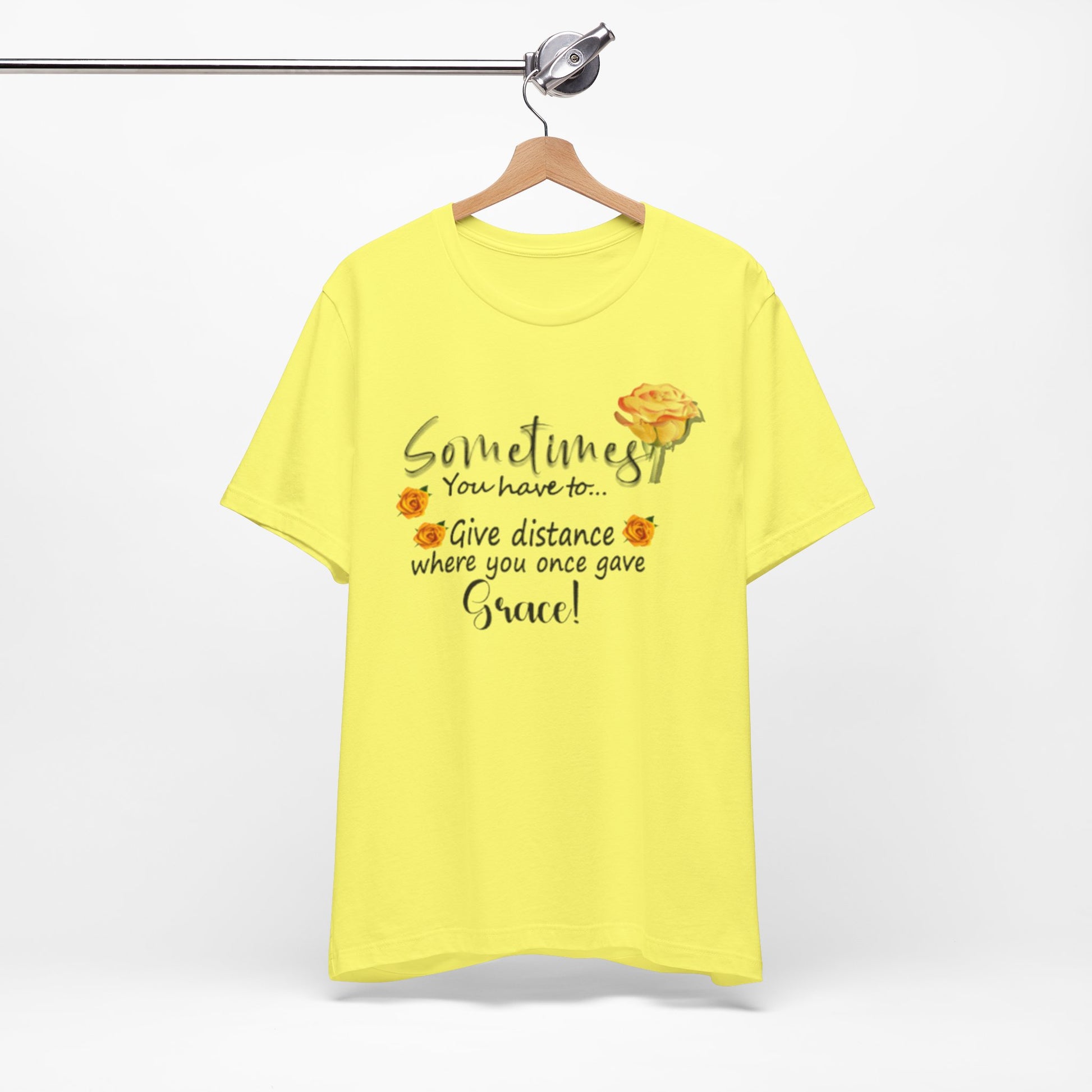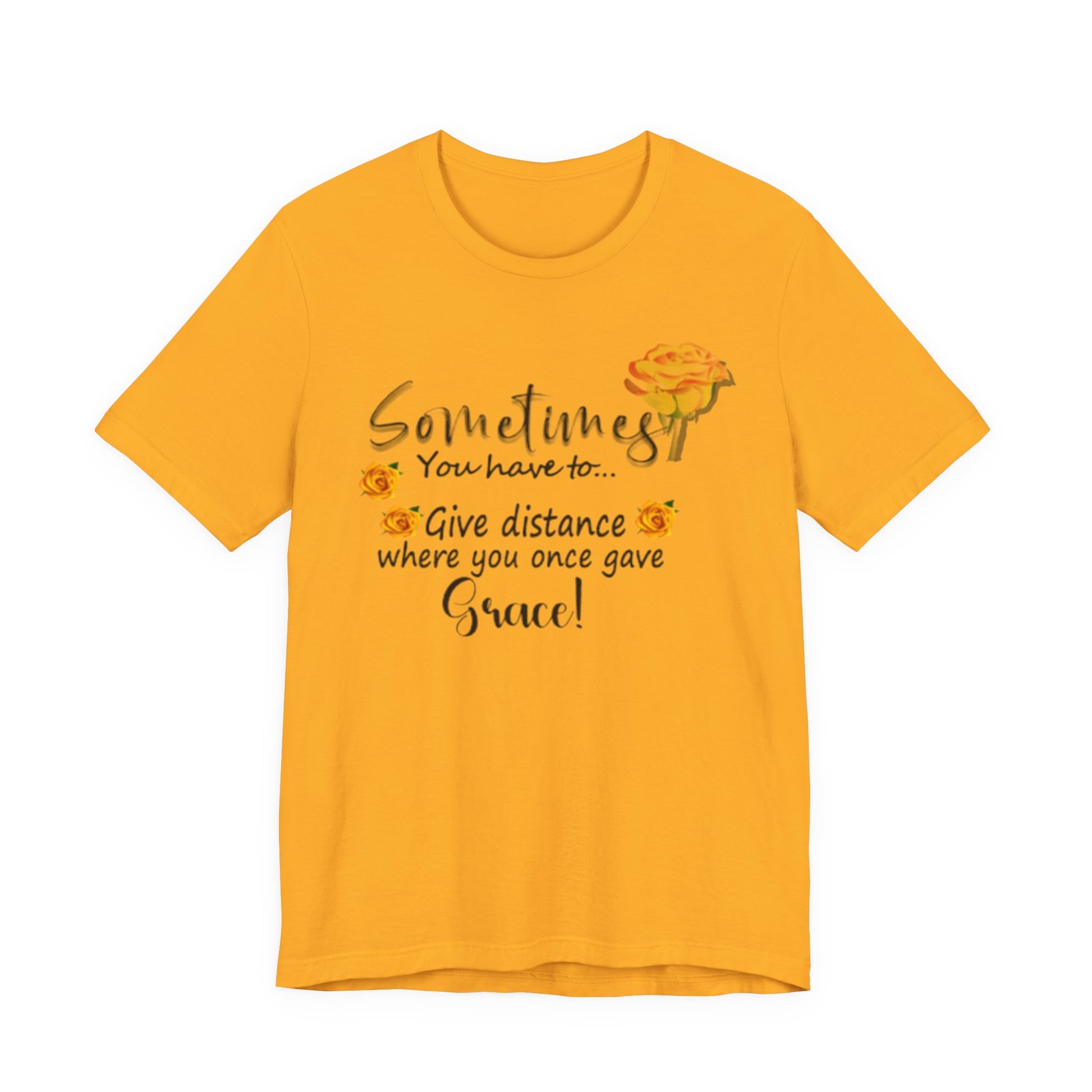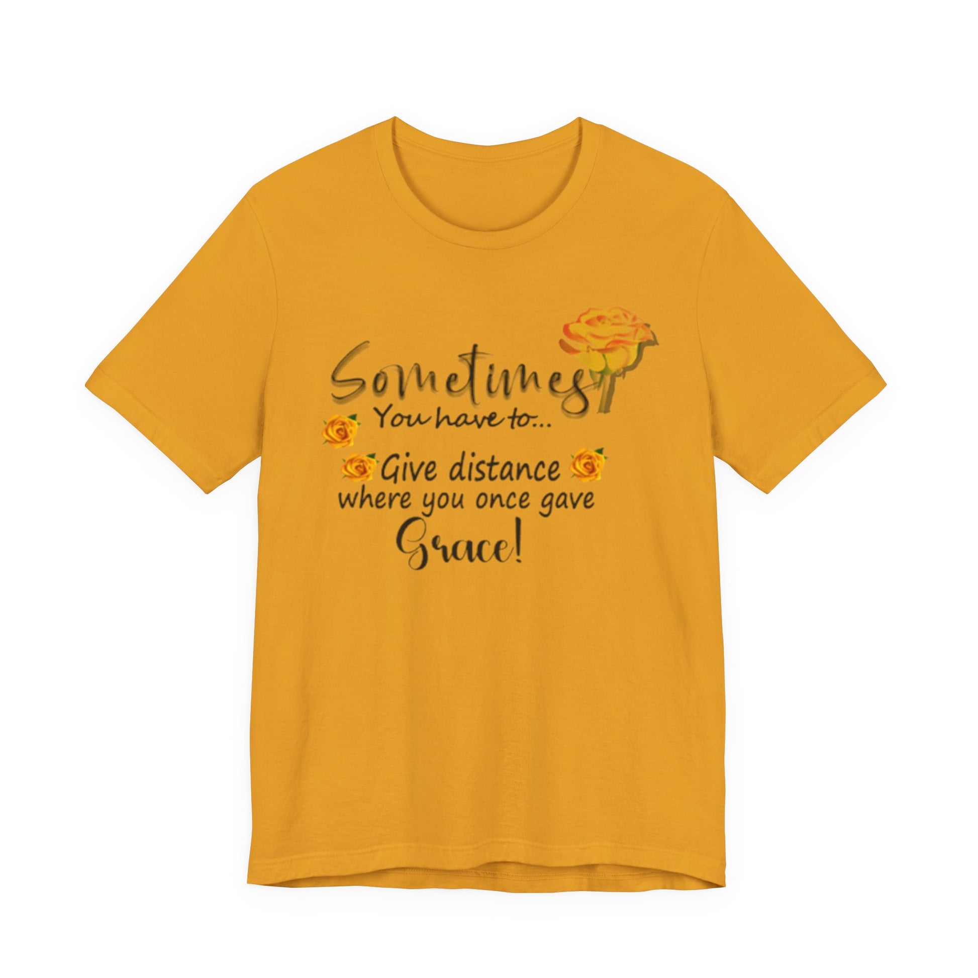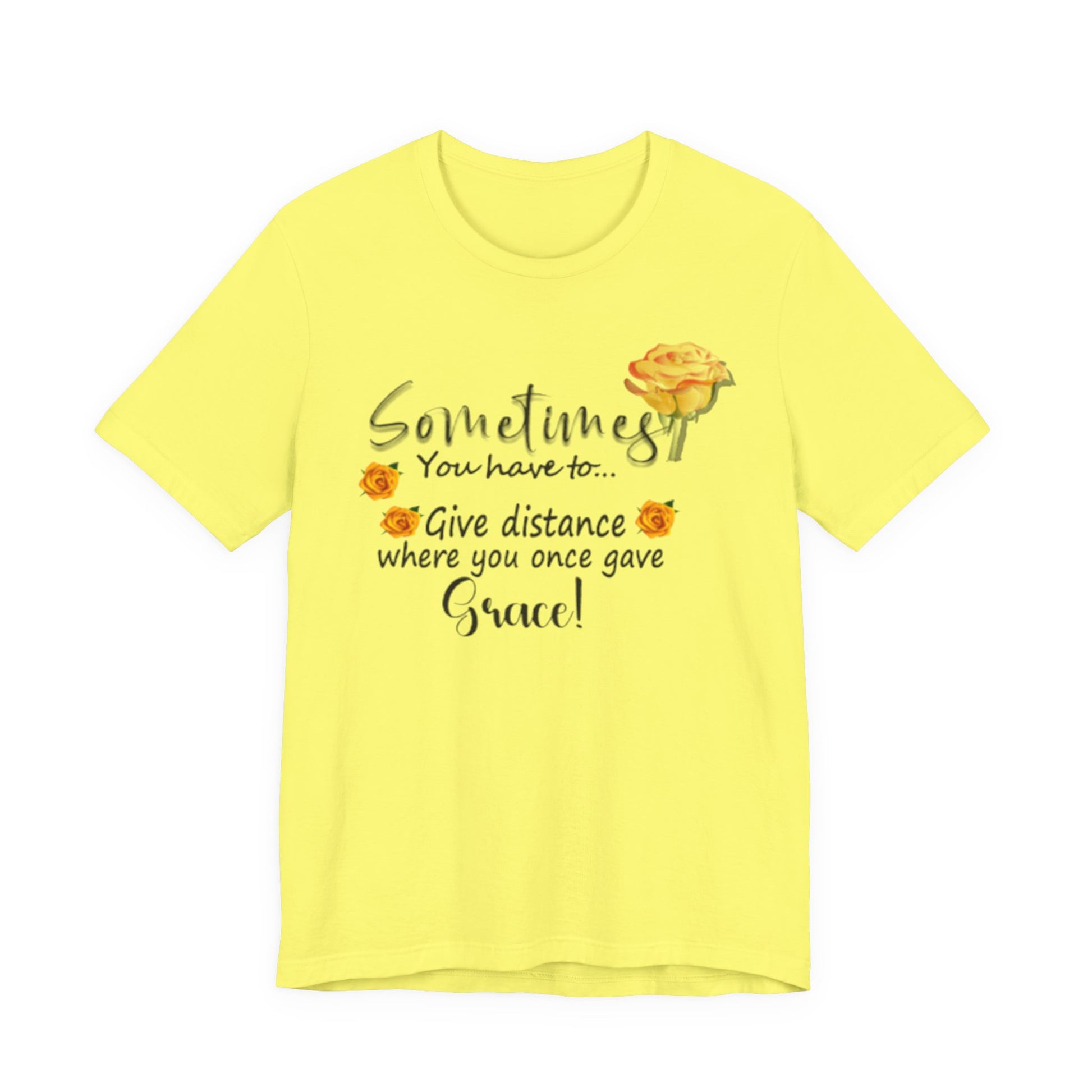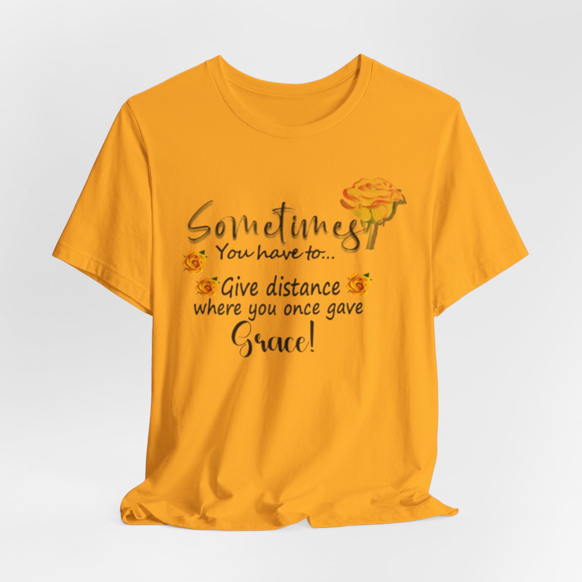 A soft, breathable tee that speaks with gentle honesty. This lightweight jersey shirt carries a calm, hand-lettered message — “Sometimes you have to… give distance where you once gave grace!” — surrounded by warm watercolor roses. It settles easily into everyday life: worn with jeans on a quiet morning walk, layered under a cardigan during reflective coffee dates, or pulled on after a long day when you need a subtle reminder to set healthy boundaries. The airy Airlume combed cotton feels like a second skin and the crew neckline keeps the look clean and approachable. The floral accents and script lettering give it a gentle, personal touch that reads like a wink from a friend who understands when to hold on and when to step back.