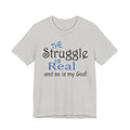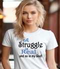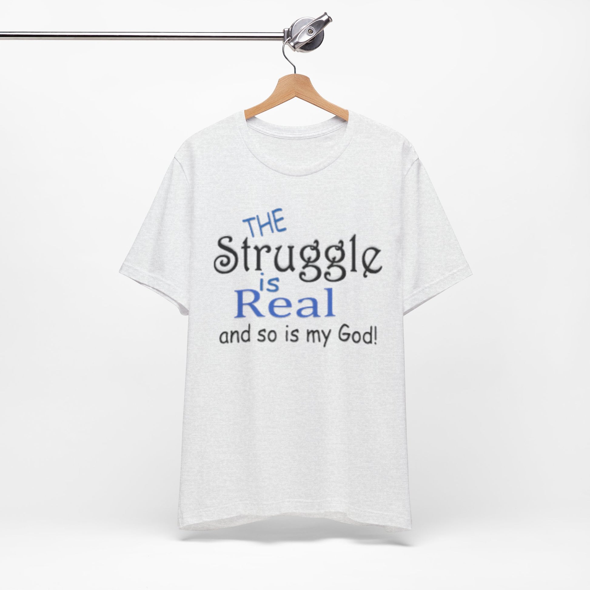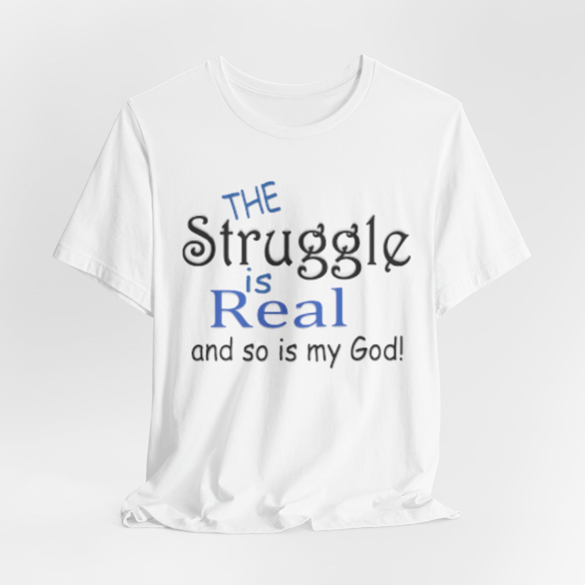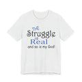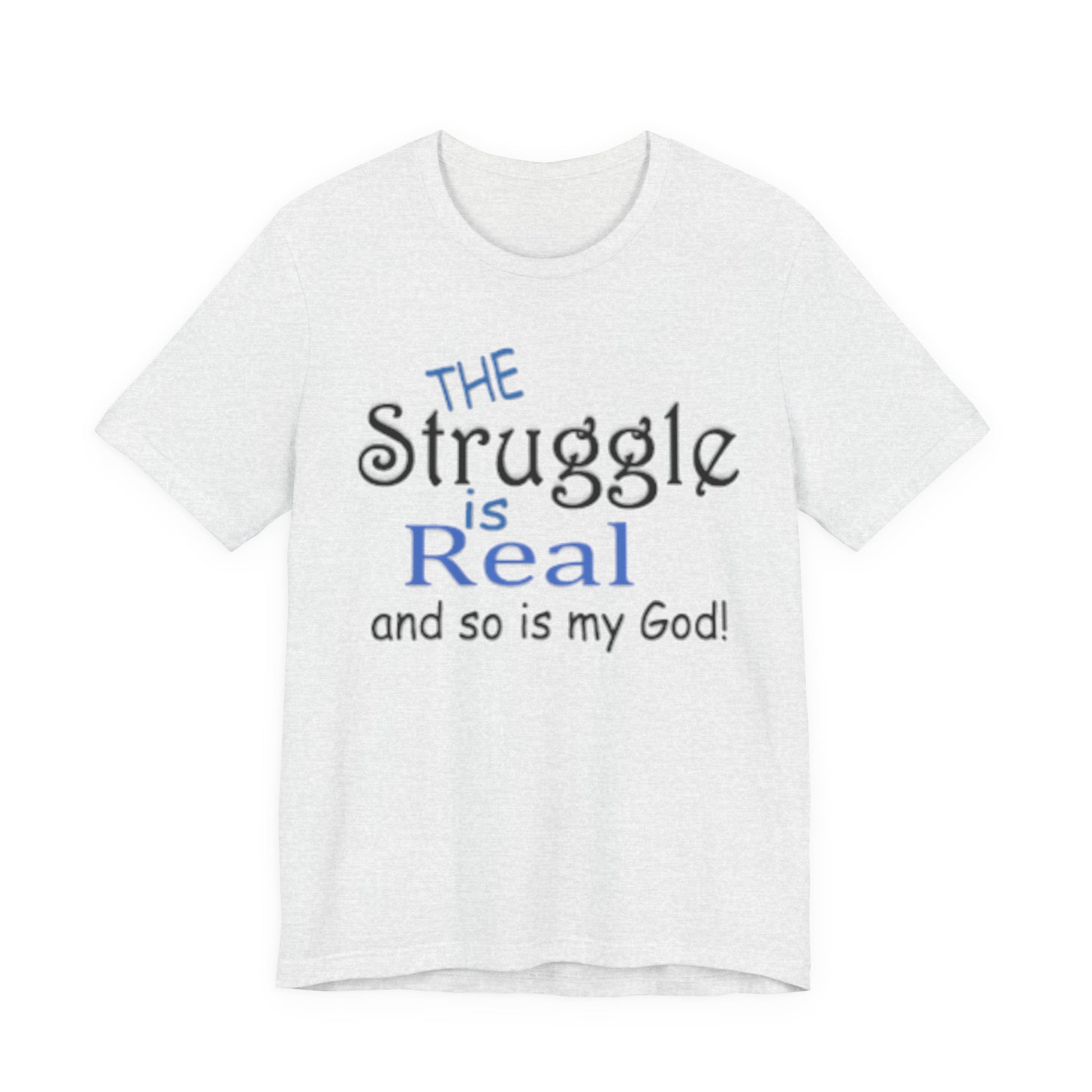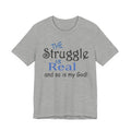 Soft, breathable tee with a gentle message for days when faith and honesty meet. Lightweight Airlume combed cotton keeps you cool while the playful mixed-type lettering—soft script mixed with bold serif—says, “the struggle is real and so is my God.” It feels lived-in from the first wear and sits neatly at the neckline for easy layering under jackets or over long sleeves. Wear it to church meetups, small-group nights, volunteer shifts, or quiet mornings with coffee when you want to speak plainly about real life and quiet faith.