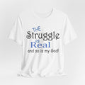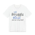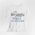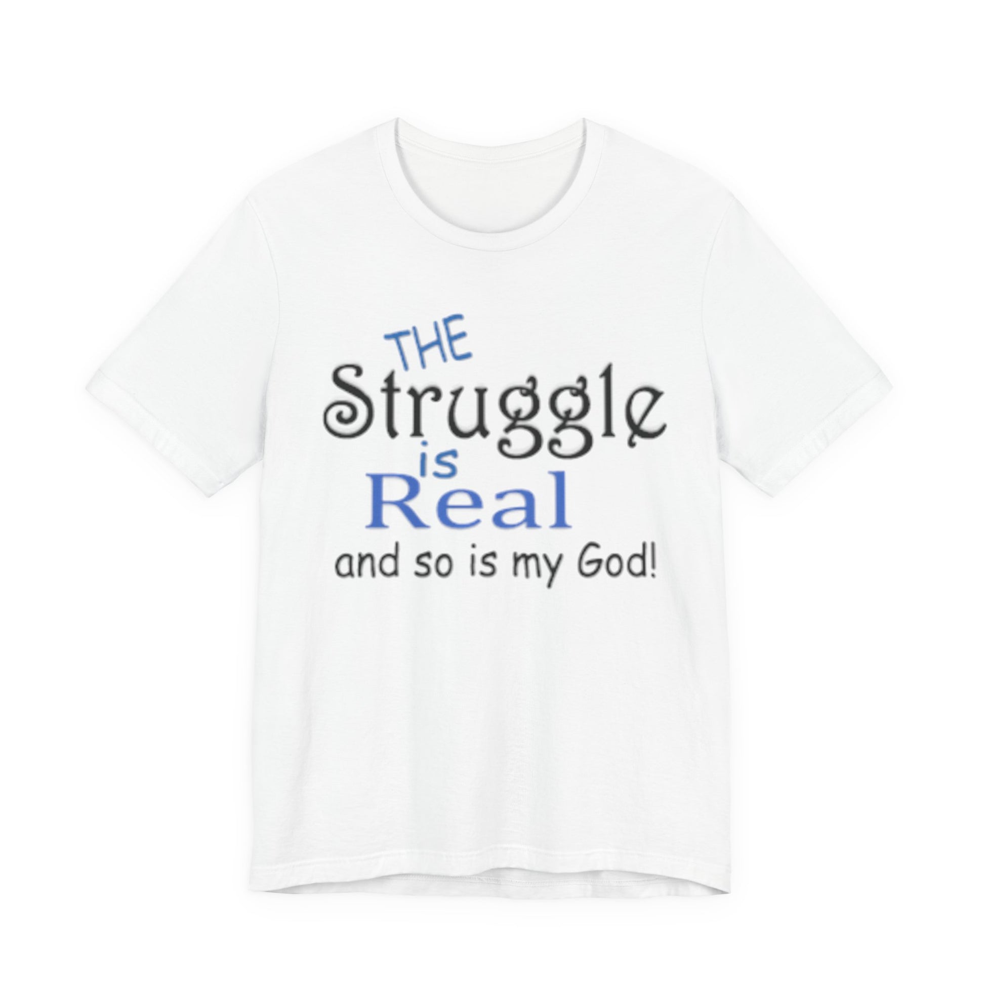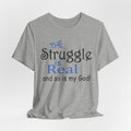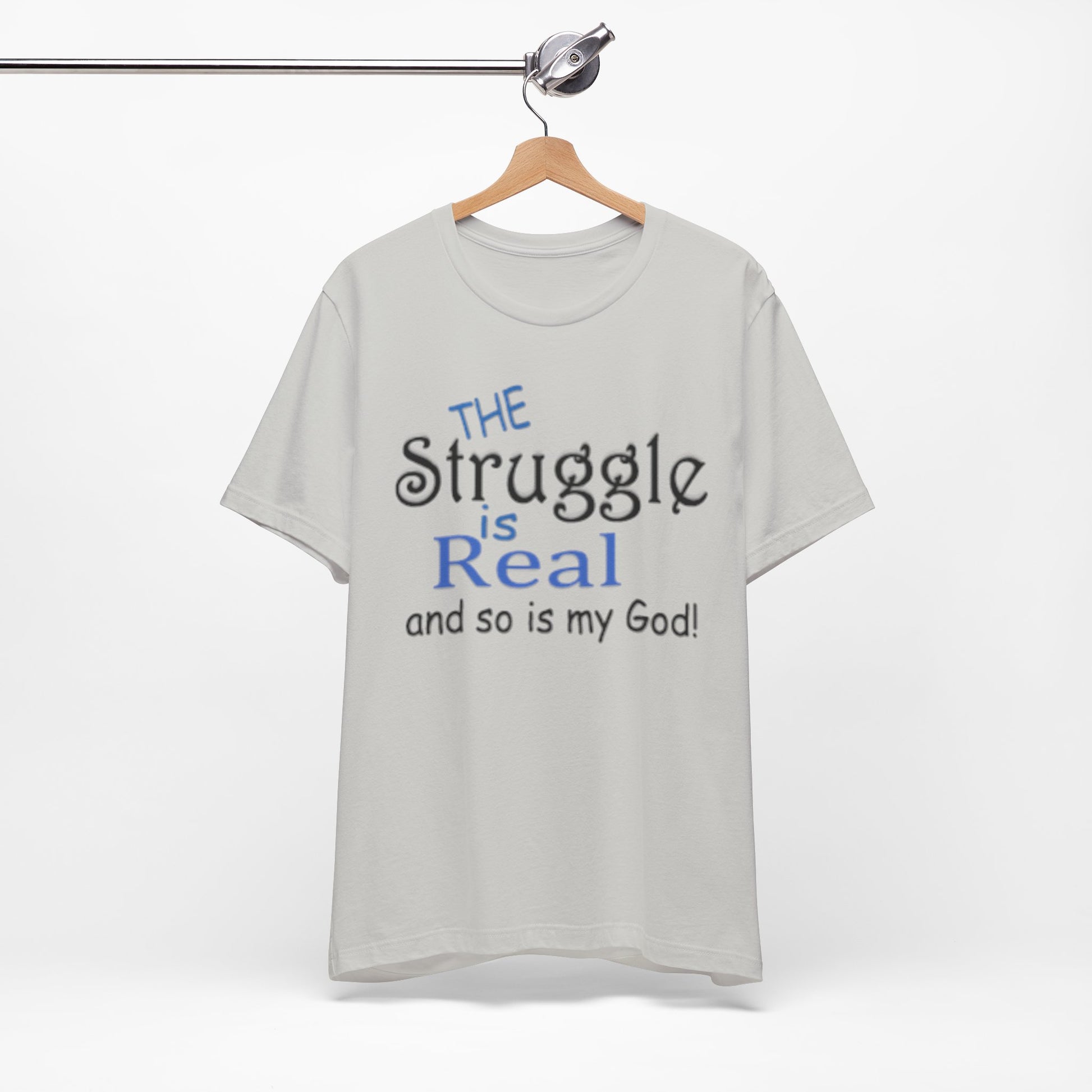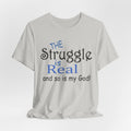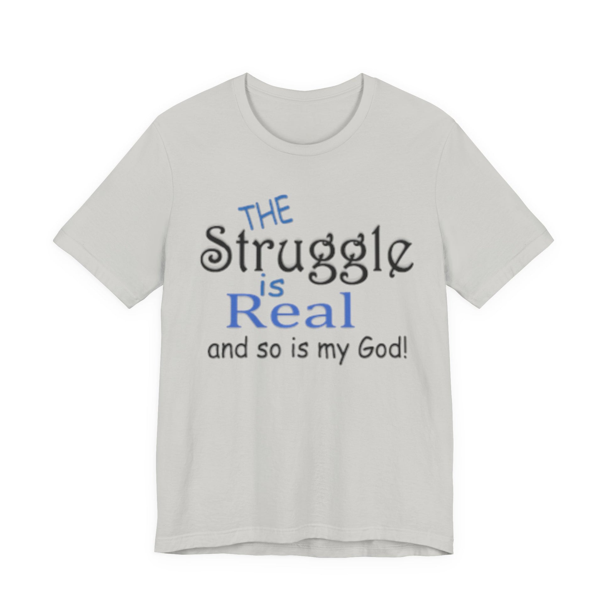 Soft, breathable tee with a gentle message for days when faith and honesty meet. Lightweight Airlume combed cotton keeps you cool while the playful mixed-type lettering—soft script mixed with bold serif—says, “the struggle is real and so is my God.” It feels lived-in from the first wear and sits neatly at the neckline for easy layering under jackets or over long sleeves. Wear it to church meetups, small-group nights, volunteer shifts, or quiet mornings with coffee when you want to speak plainly about real life and quiet faith.